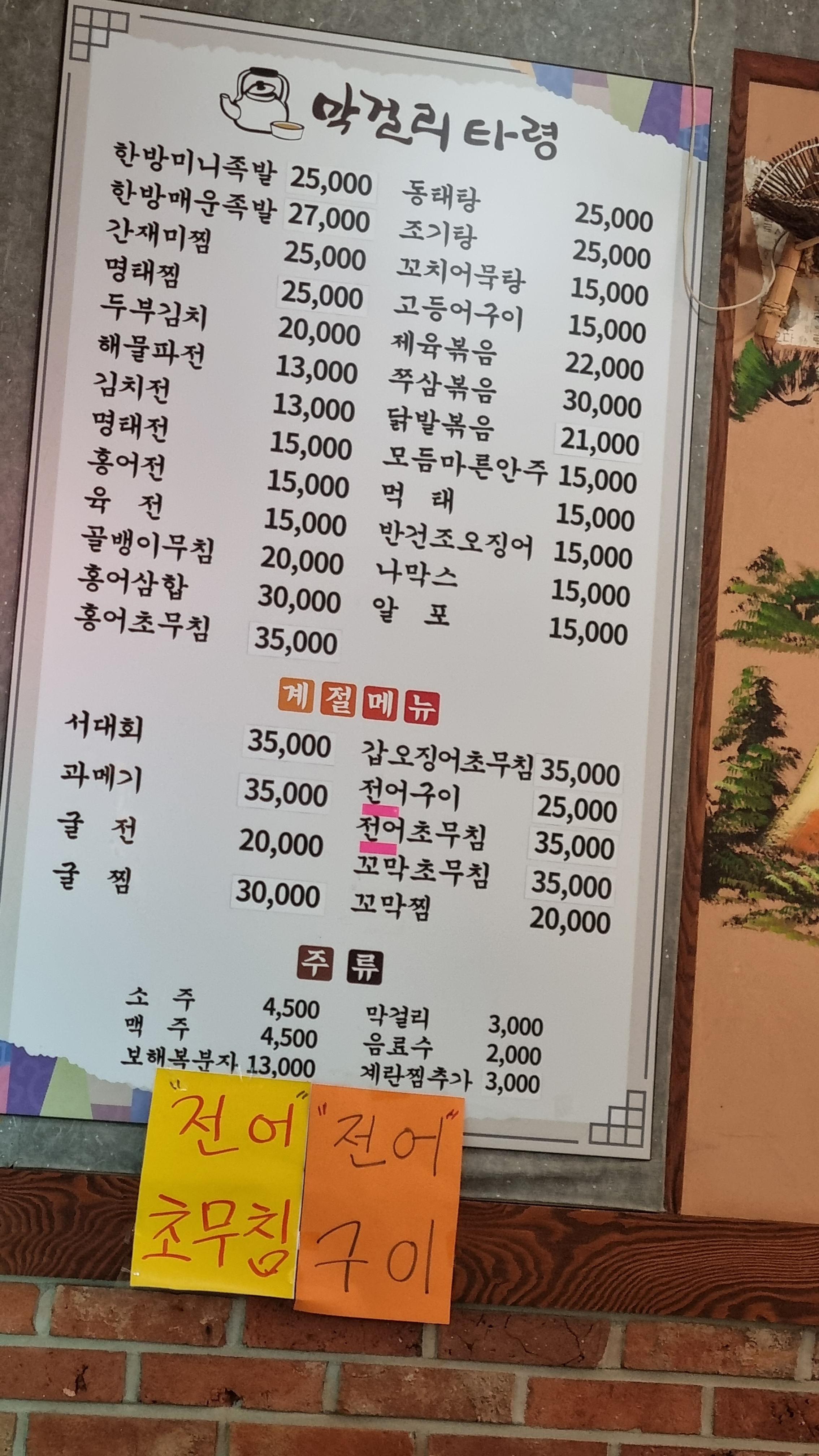 메뉴가 다양하는데 포장마차나 선술집에서 드실 수 있는 메뉴들이 많습니다. 두부김치,파전,동태전등 전 종류가 다양하는데 이것은 1년 내내 가능하 메뉴입니다.