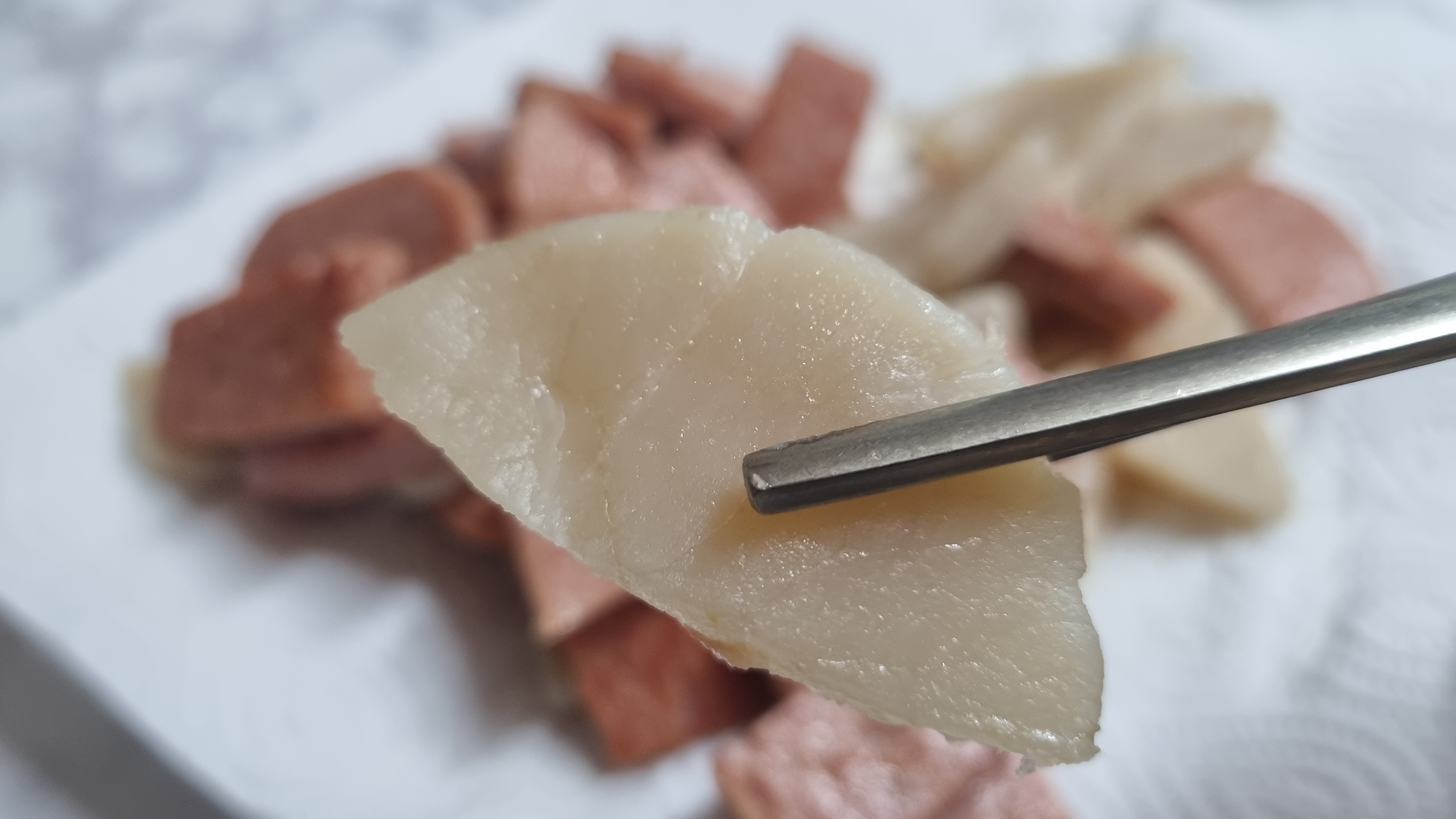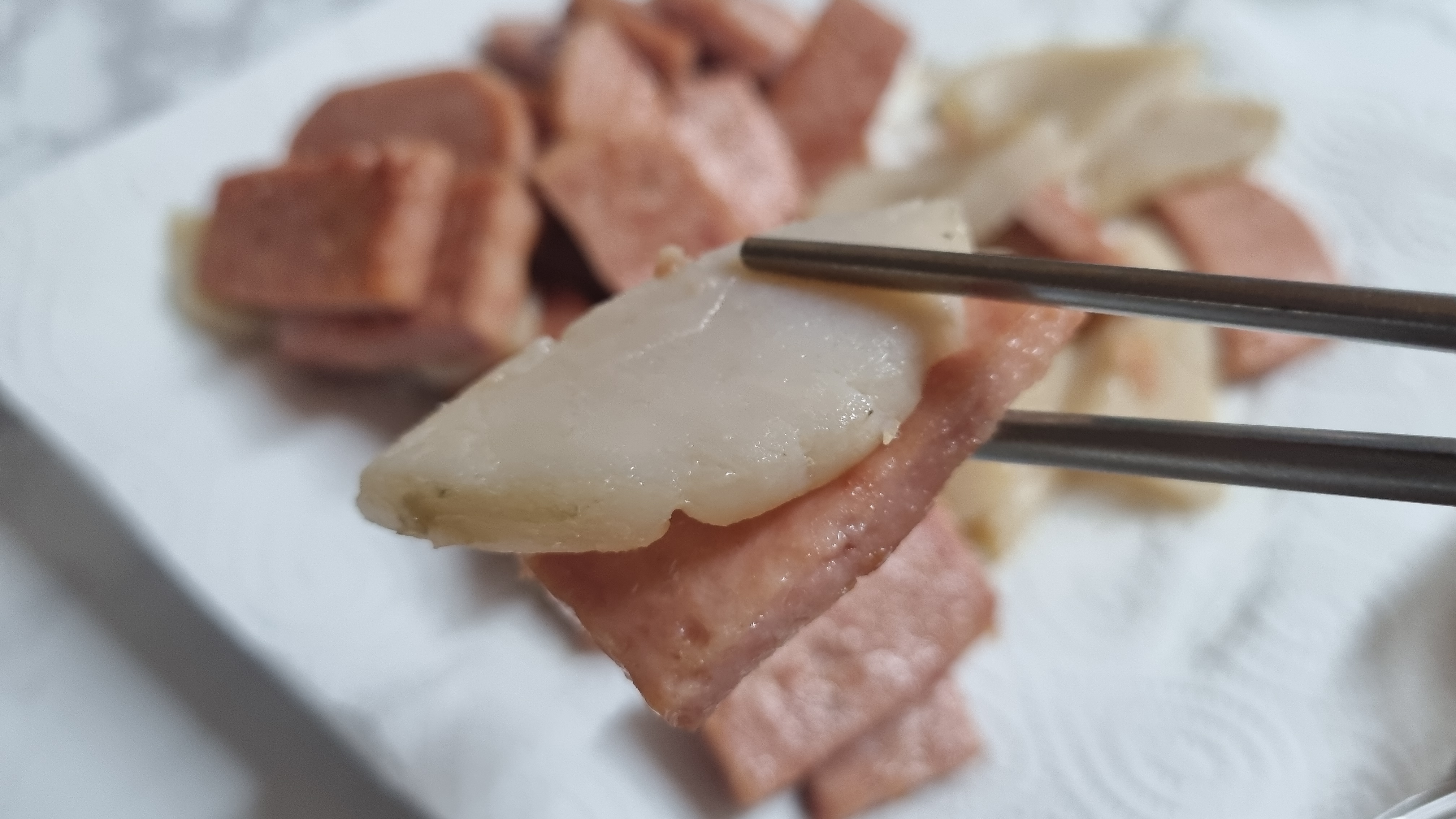 드실때는 관자와 스팸 김치 이렇게 드시면 바로 키조개 삼합이 됩니다. 위의 사진은 키조개 관자와 스팸은 있는데 김치가 빠져 있습니다.