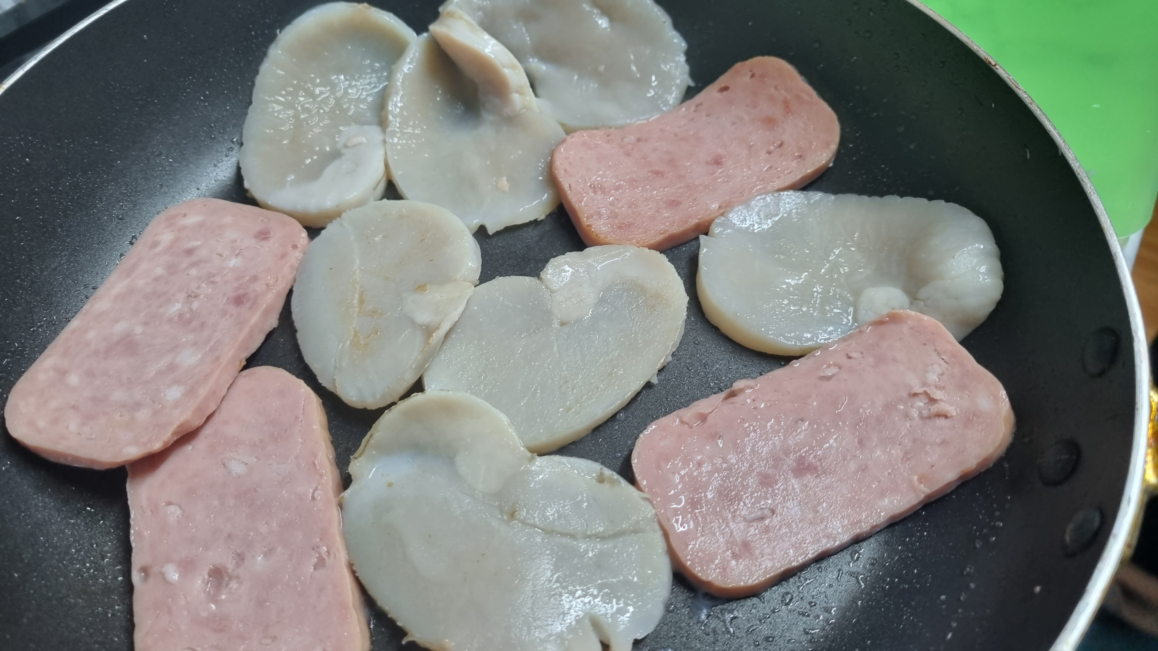 스팸은 잛은 시간만 구워도 되는데 조금 많이 굽거나 시간이 짧아도 상관이 없으며 1~2분 정도 살짝씩 굽는데 2번 정도 뒤집어 주면서 진행하면 됩니다.