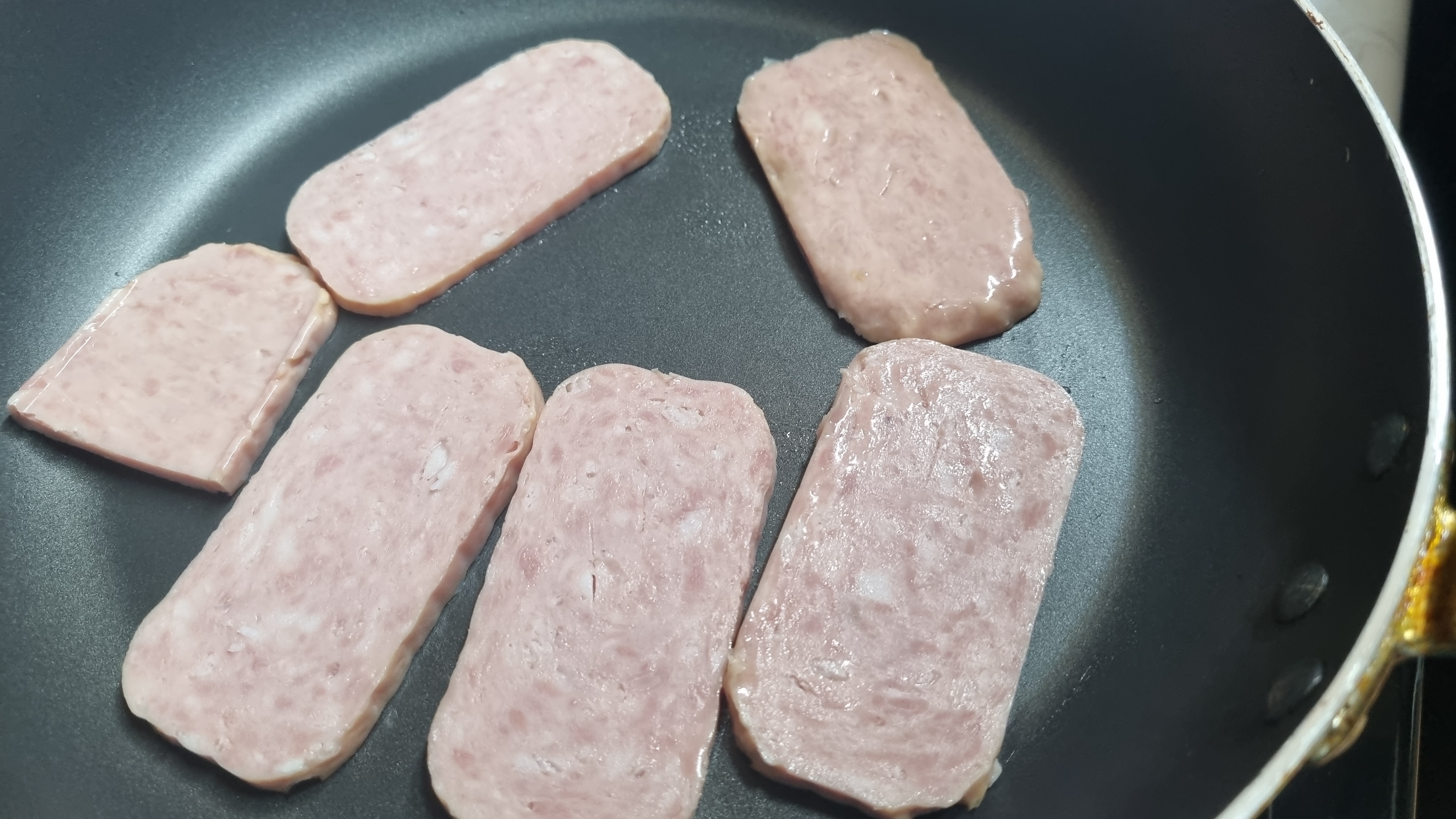 너무나 간단한데 먼저 가스렌인지나 인덕션 불을 중간으로 하고 프라이팬에 기름을 바르고 데우기 시작하는데 먼저 스팸을 올려 먼저 굽기 시작합니다.