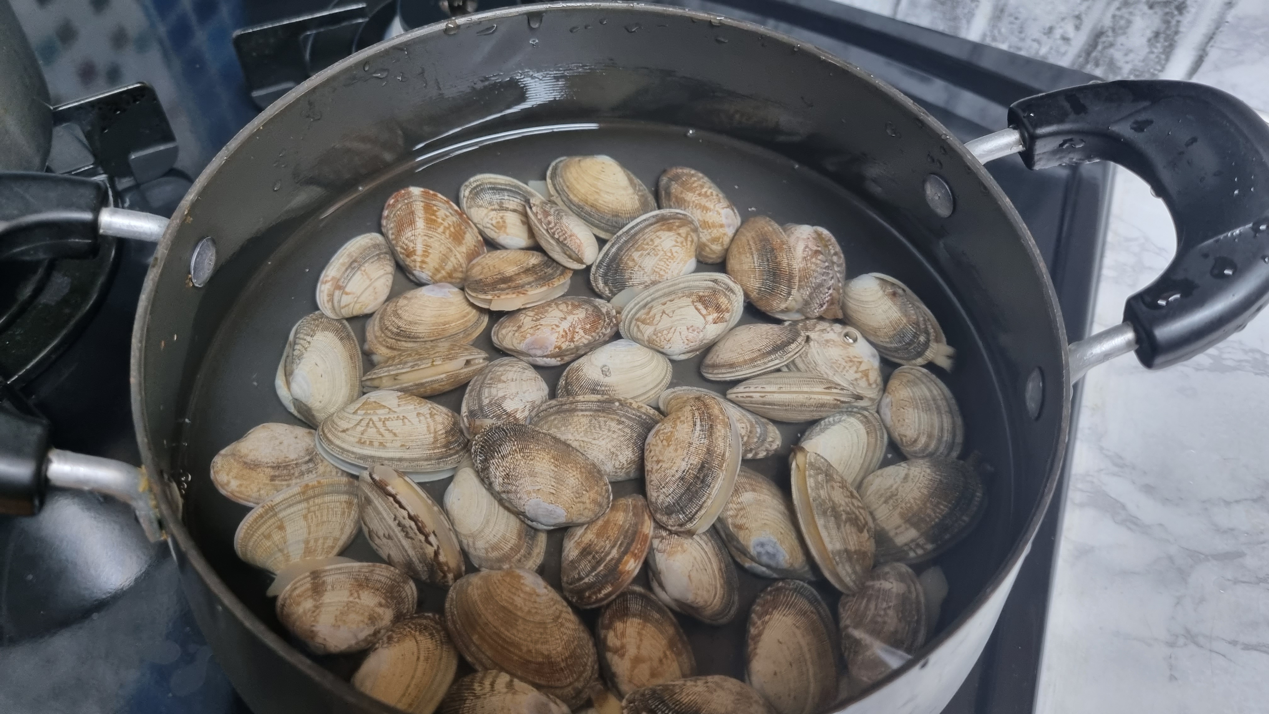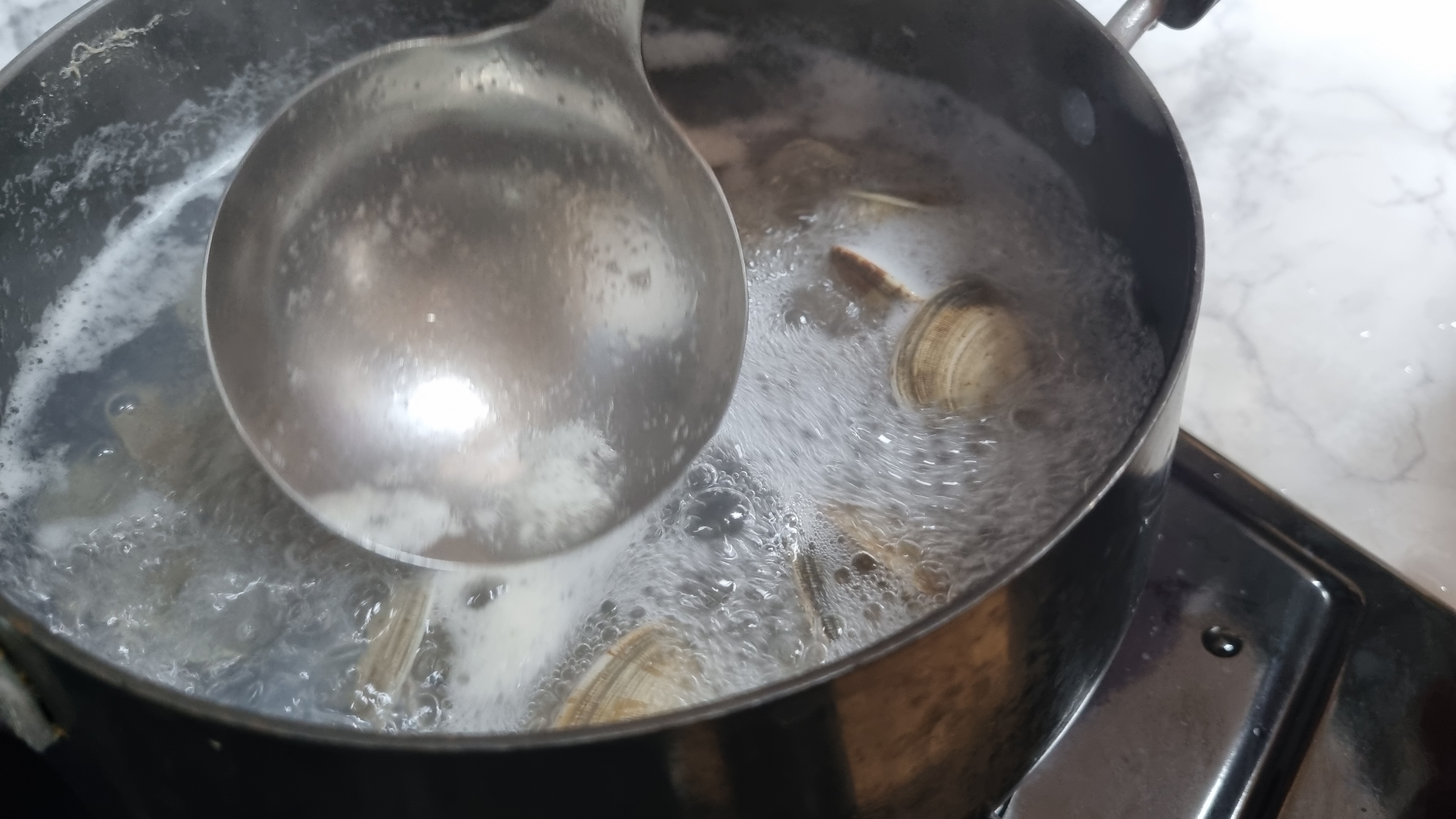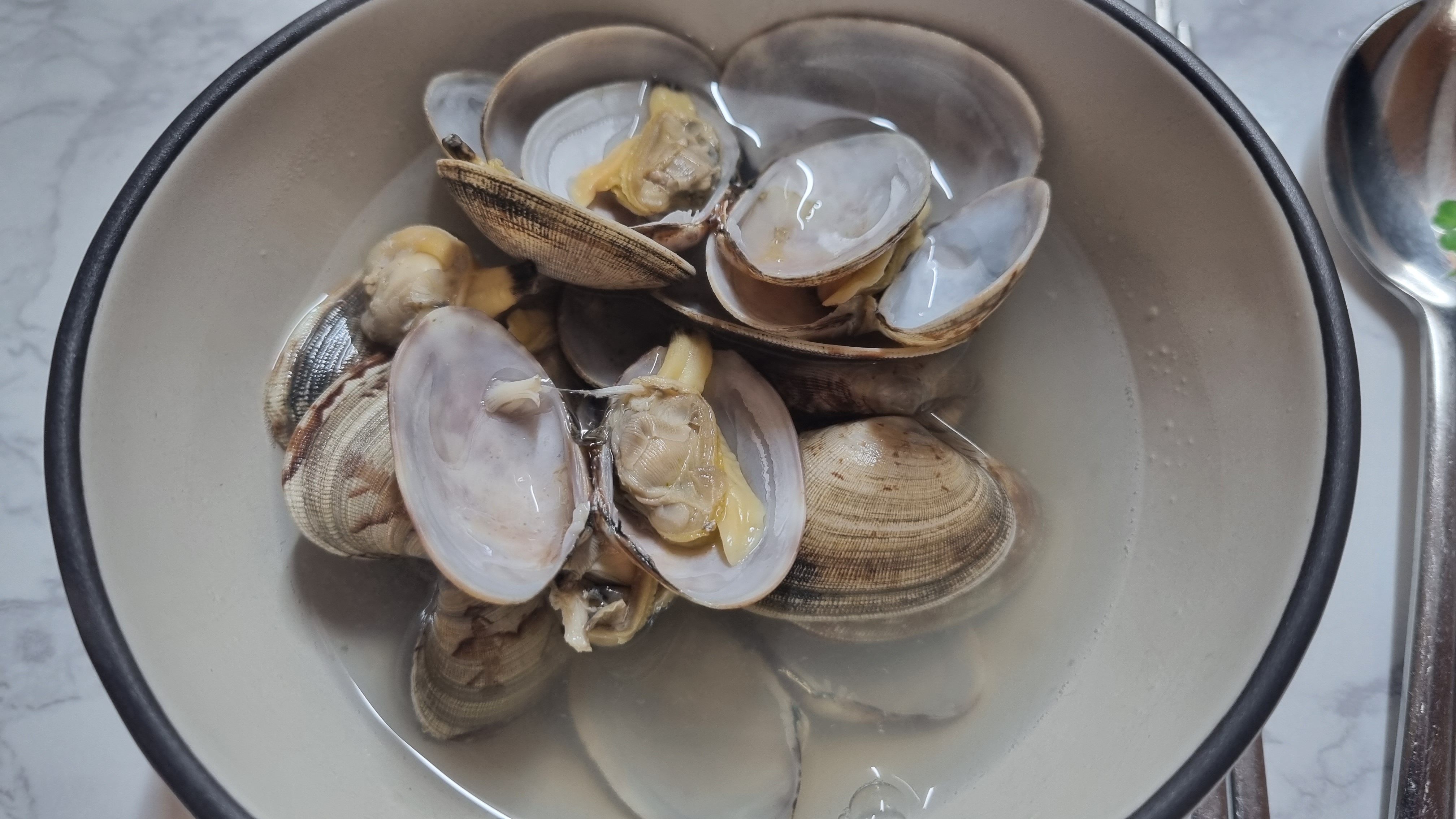 물의 양은 바지락을 잠길 정도면 충분합니다. 너무 적거나 너무 많아도 맛에 영향을 미치는데 살짝 잠길 정도가 제일 적당합니다.