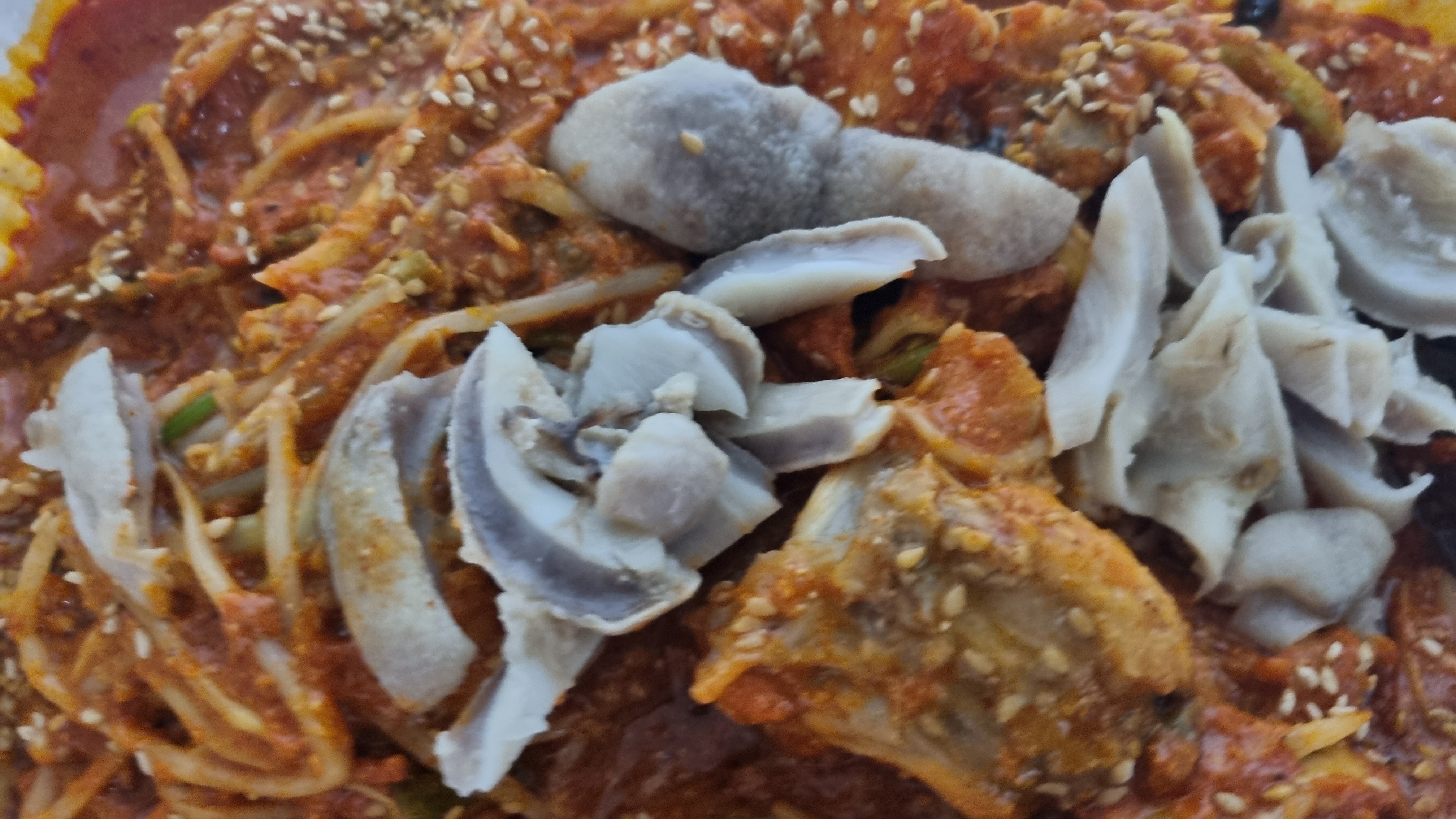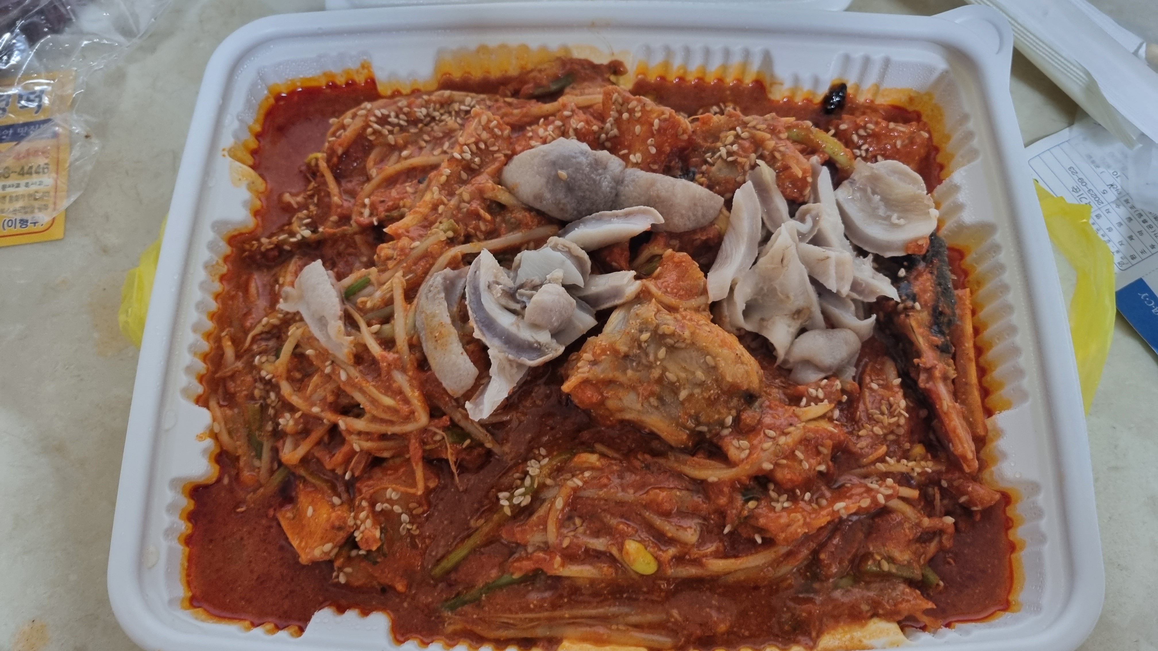 이것이 아귀찜입니다. 콩나물과 아귀 양념이 잘 조화를 이루어 아주 맛있게 보이는데 제일 위에 올라와 있는 고기는 바로 대창입니다.