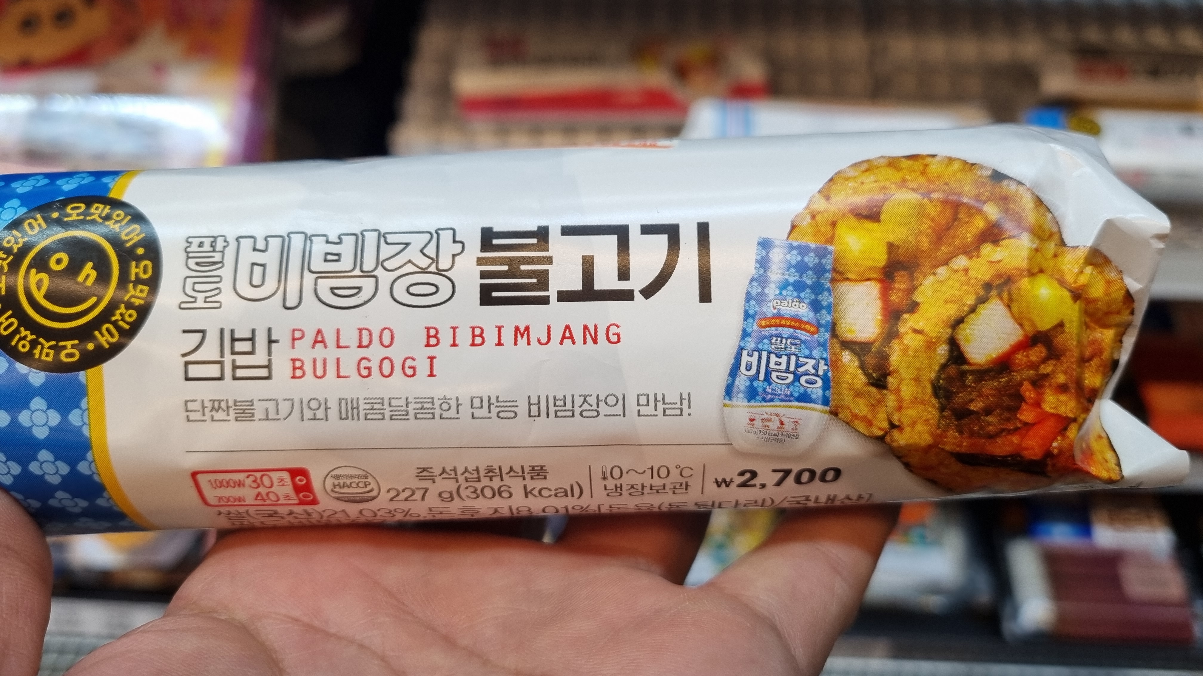 양은 더 많지만 가격이 조금 더 비쌉니다. 우리가 고른 것은 팔도 비빔장 불고기와 베이컨 참치마요김밥을 골랐습니다. 가격은 2,700원과 2,500원입니다.