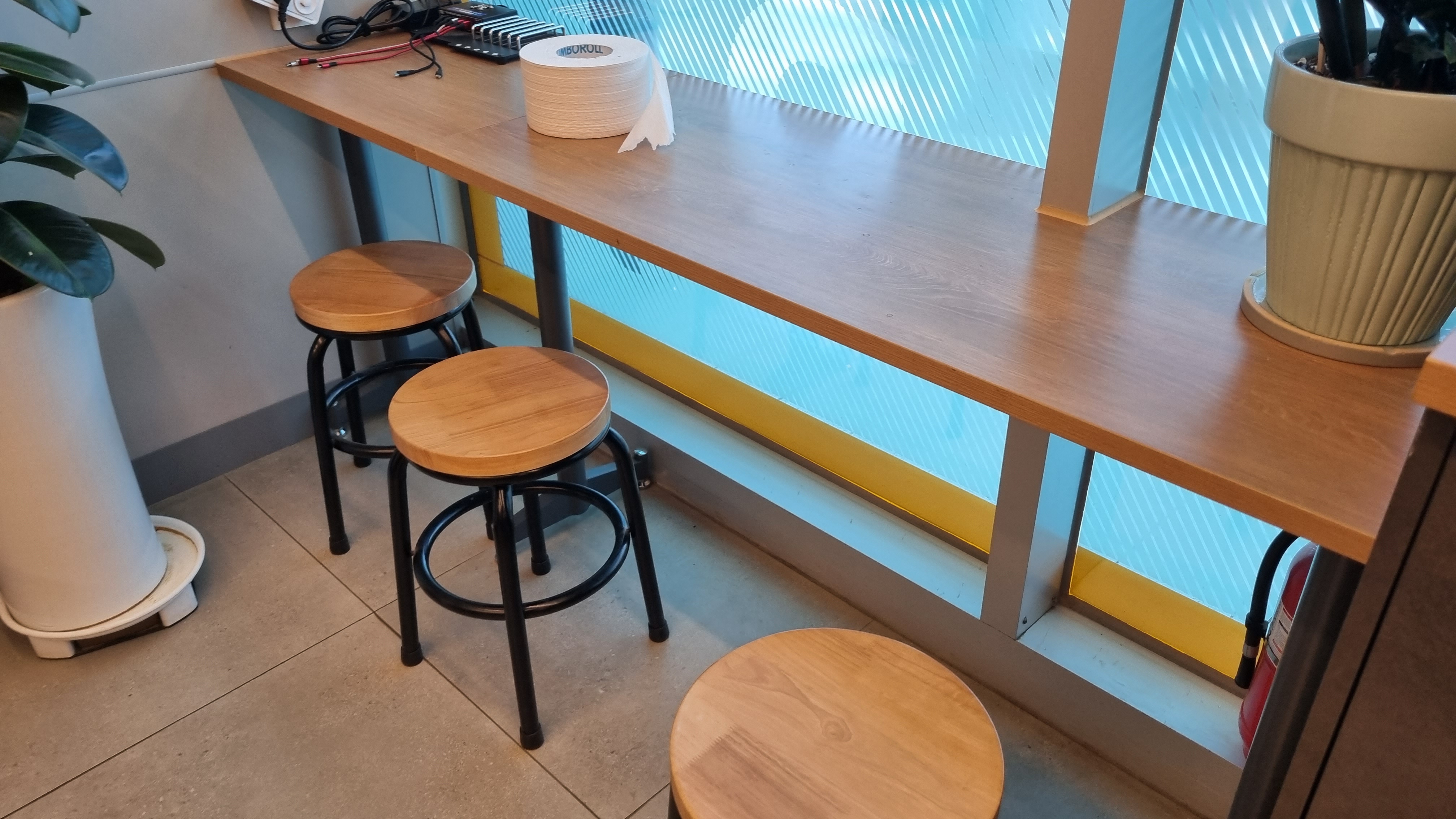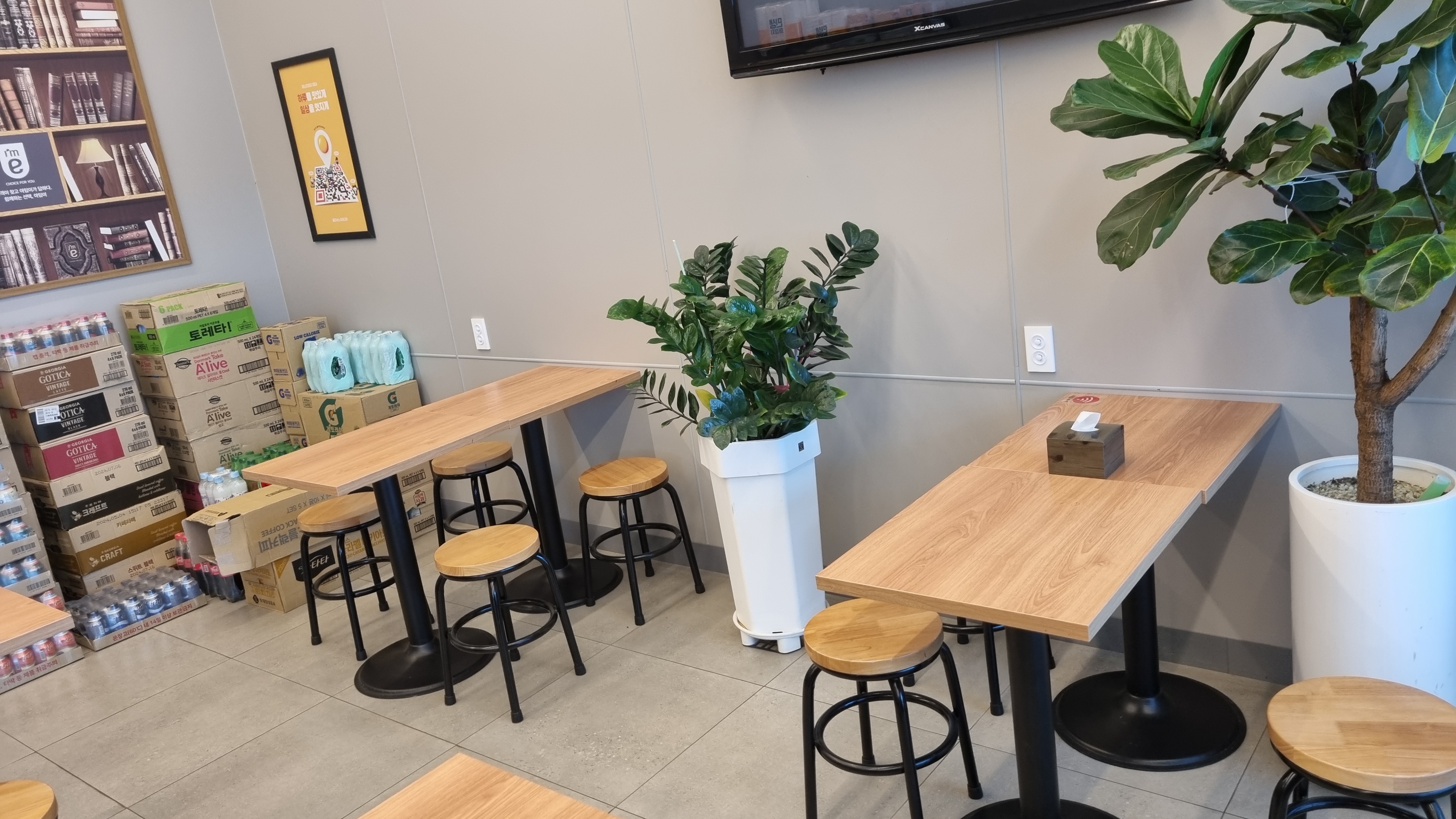 편의점의 장점 이렇게 식탁 테이블이 있어서 편하게 앉아서 즐겁게 식사나 커피를 마실 수 있다는 것입니다