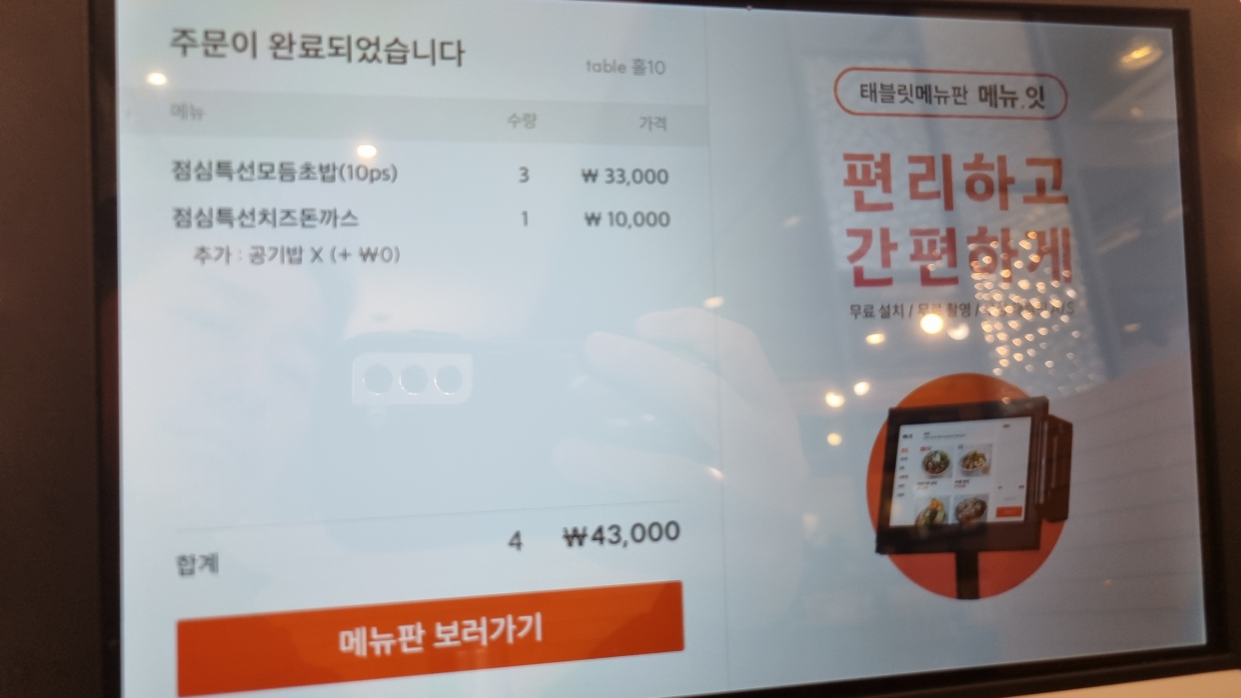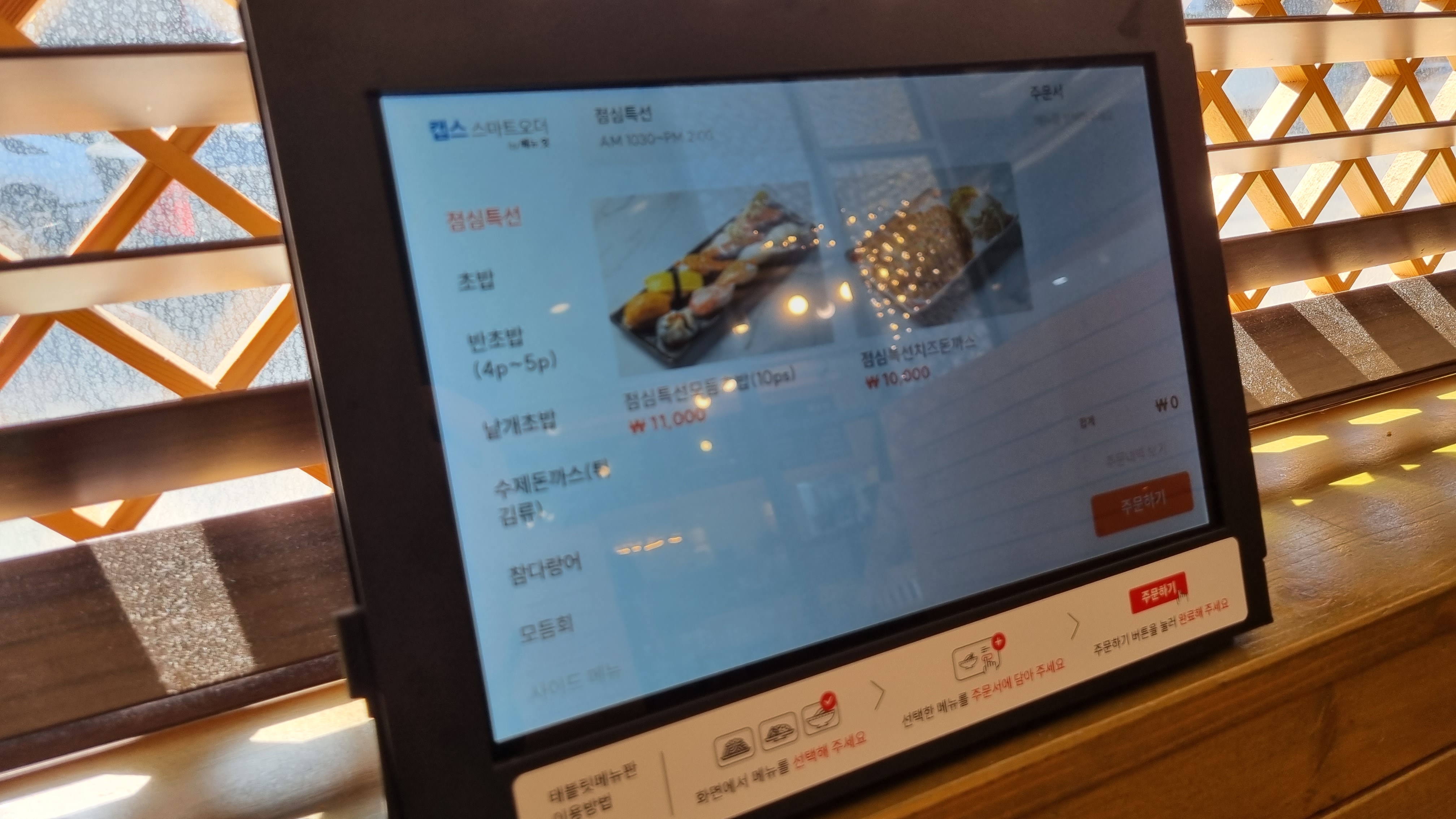 주문은 모두 테이블에 온라인으로 할 수 있으며 우리는 일행이 3명인데 점심특선 모둠초밥 3개와 치즈돈까시 1개를 주문했습니다.