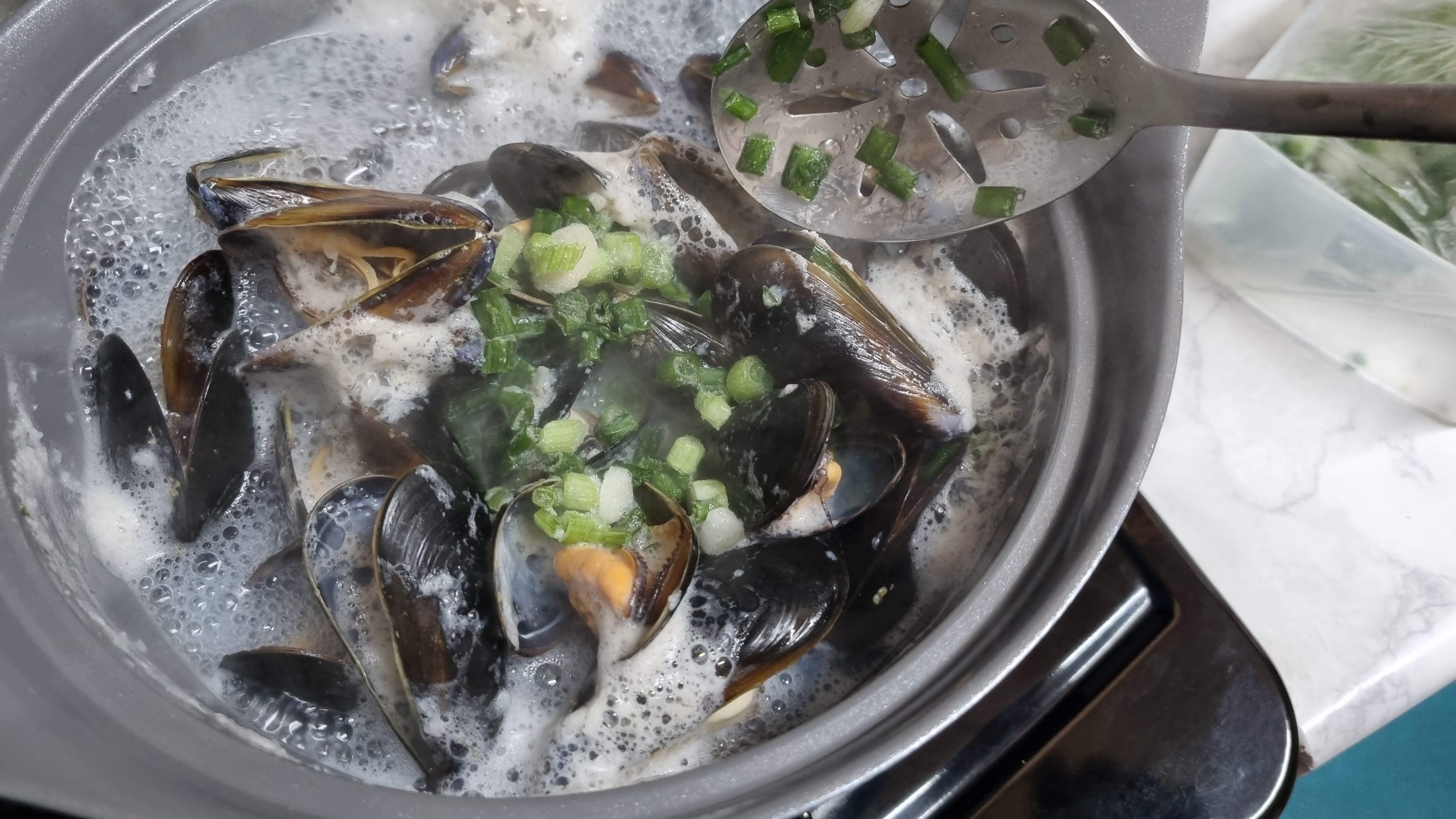 대파를 넣은후 1~2분 정도만 더 끓이면 되는데 이때 국물맛을 보고 소금을 조금더 할 것인지 결정하고 홍합도 하나정도 맛을 보면 됩니다.