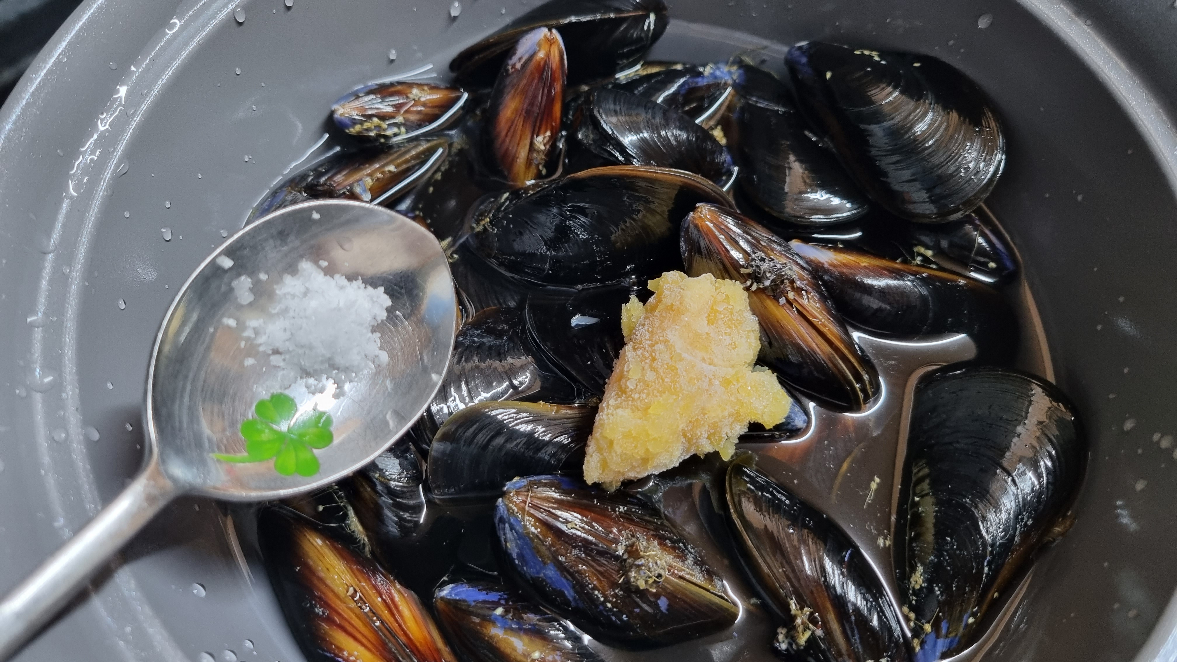 이렇게 물을 홍합 높이로 넣었으며 다음으로 다짐마늘과 소금을 넣은데 마늘은 미리 다져서 조금씩 잘라 냉동실에 보관 후 사용하면 정말 편리합니다.