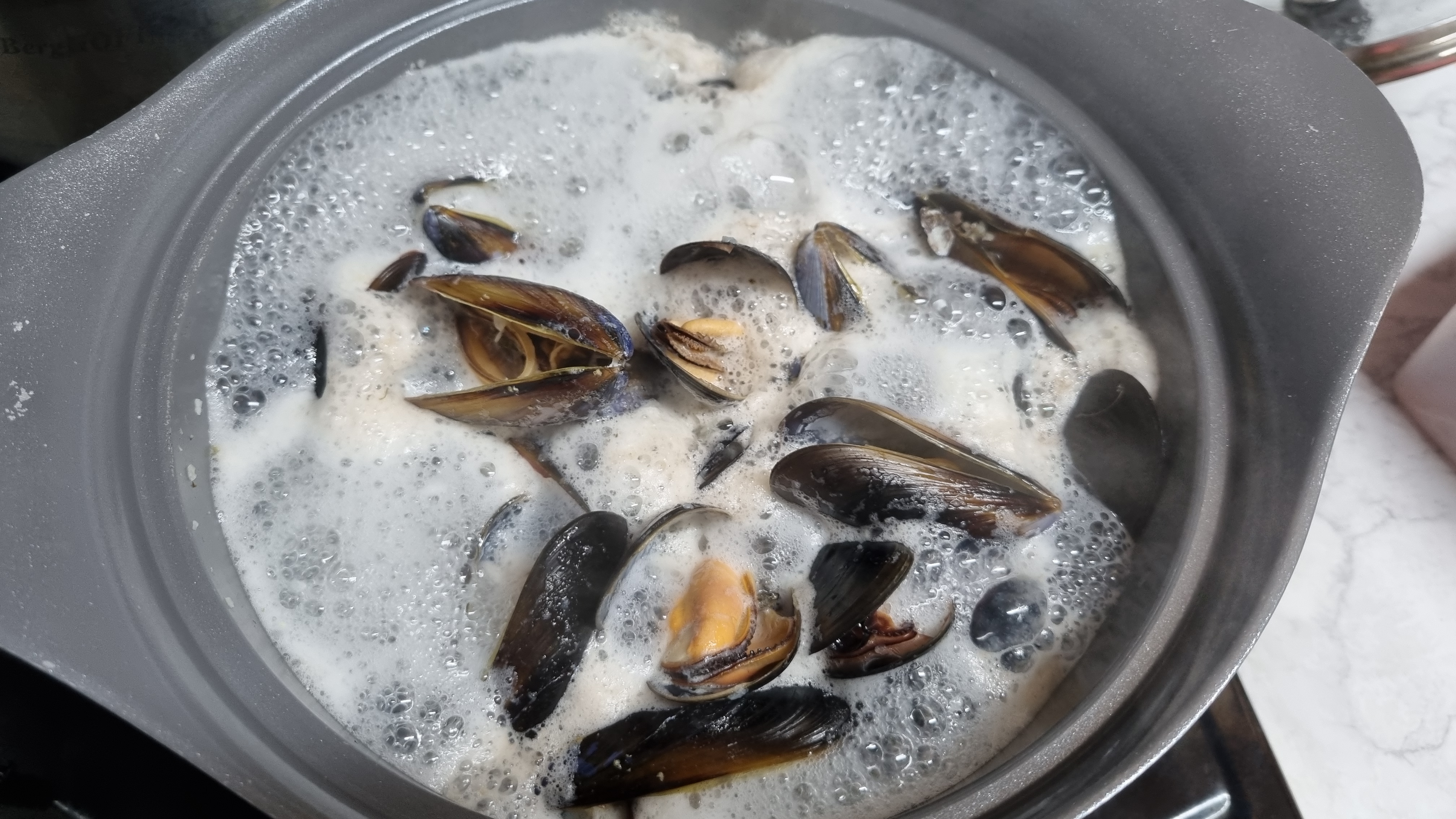 손질을 마무리 되었으면 냄비에 넣고 물을 부어야 하는데 물의 양은 홍합 높이까지 하면 적당합니다.