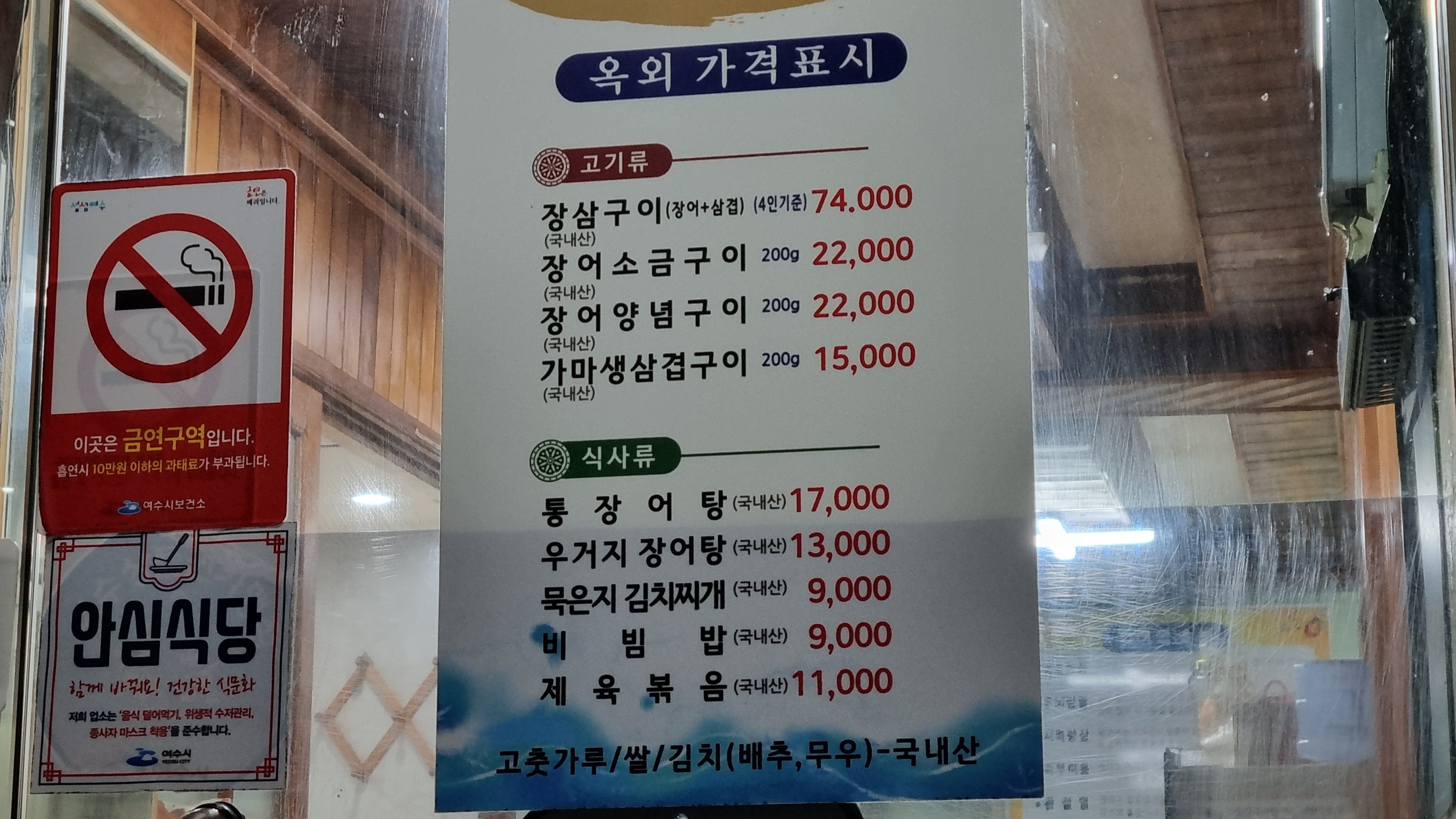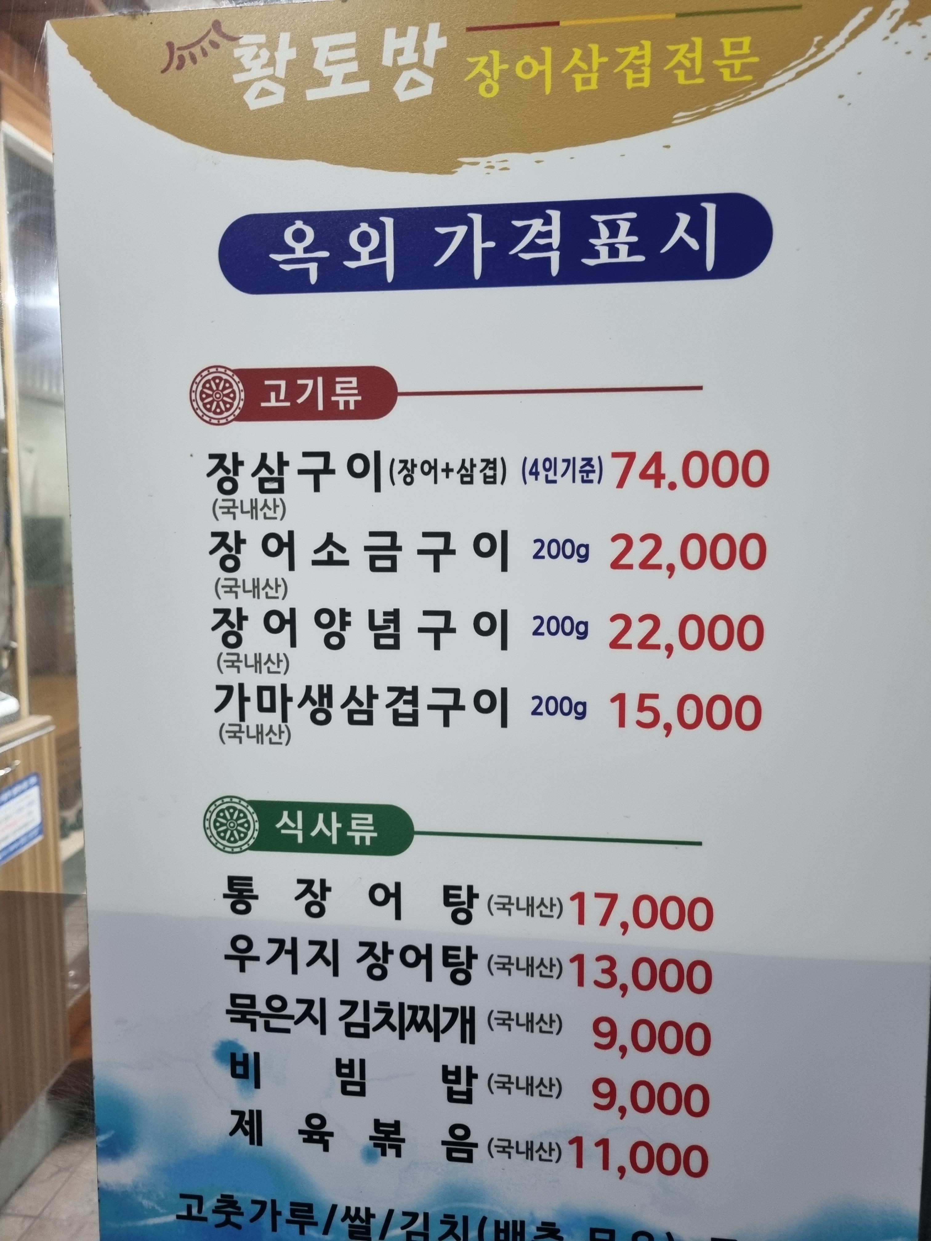 메뉴판인데 장삼구이(장어 + 삼겹)가 주메뉴였으며 장어소금구이와 양념구이가 200g당 22,000원에 판매됩니다. 그 외 통장어탕 17,000원 우거지 장어탕 13,000원으로 비교적 저렴합니다.