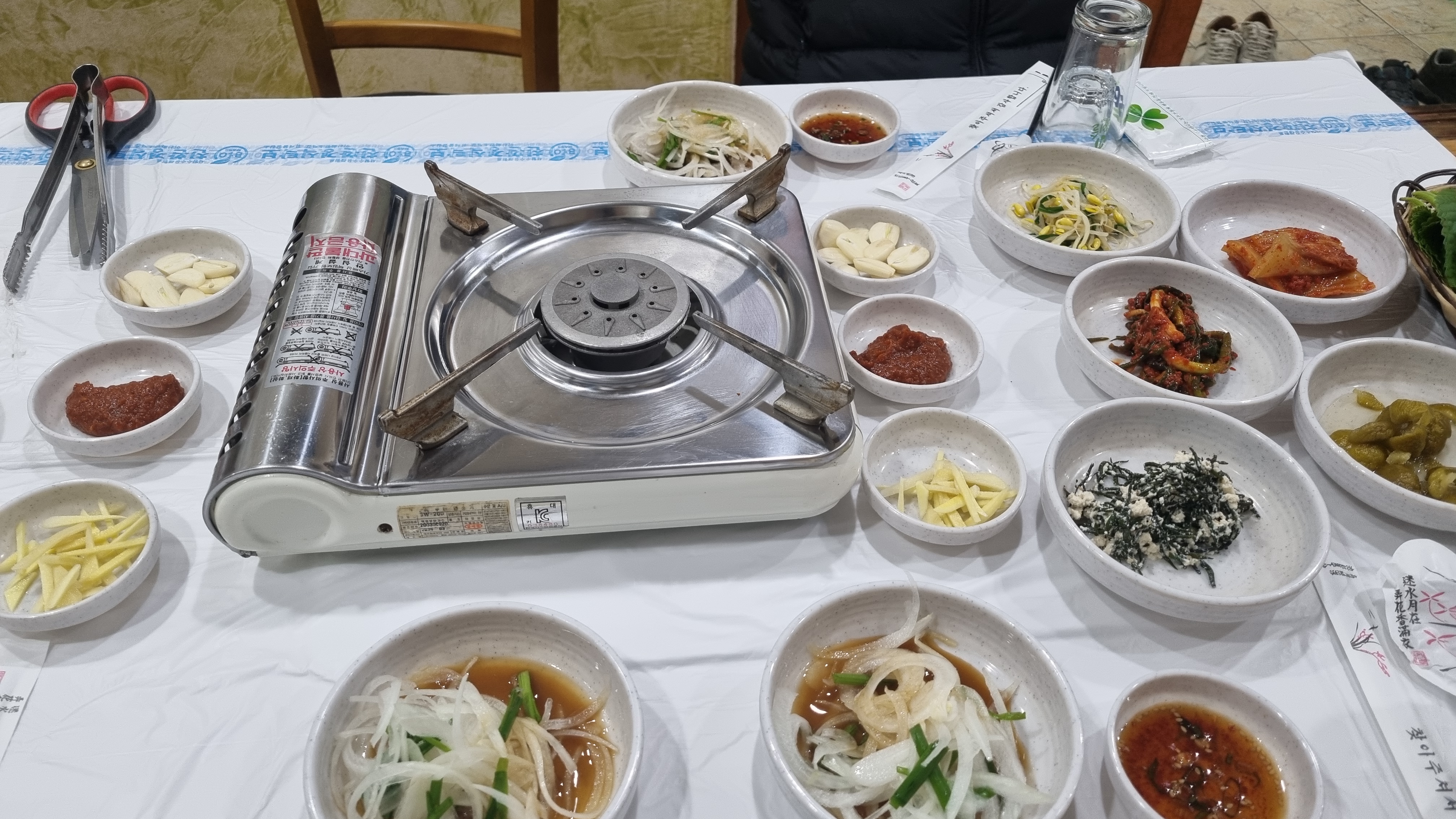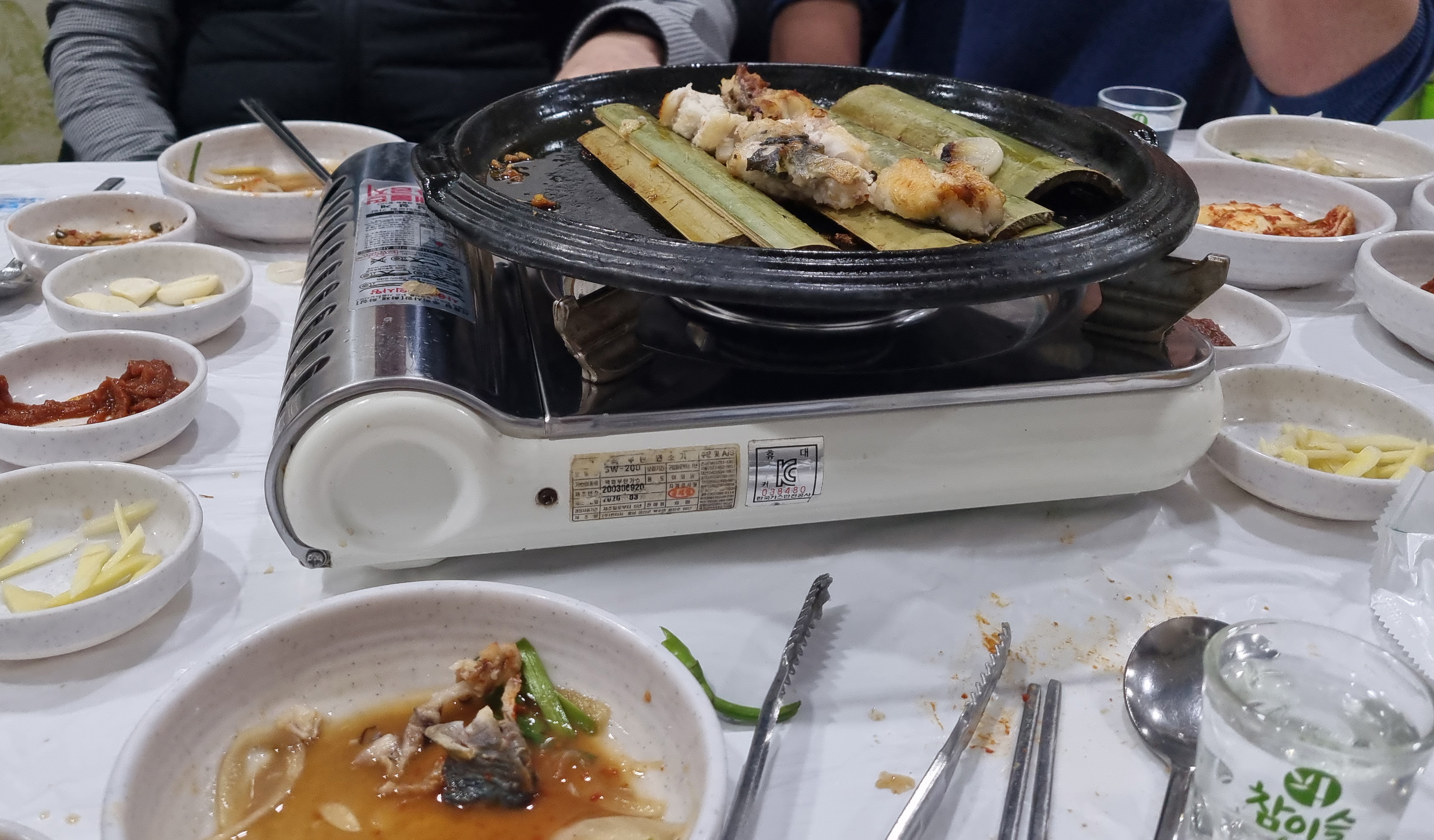 불판에 대나무가 깔아져 있으며 가스렌이지에 약하게 불을 켜는데 이것은 굽는 것이 아닌 따뜻함을 유지하려는 것으로 계속 따뜻한 고기를 드실 수 있습니다.