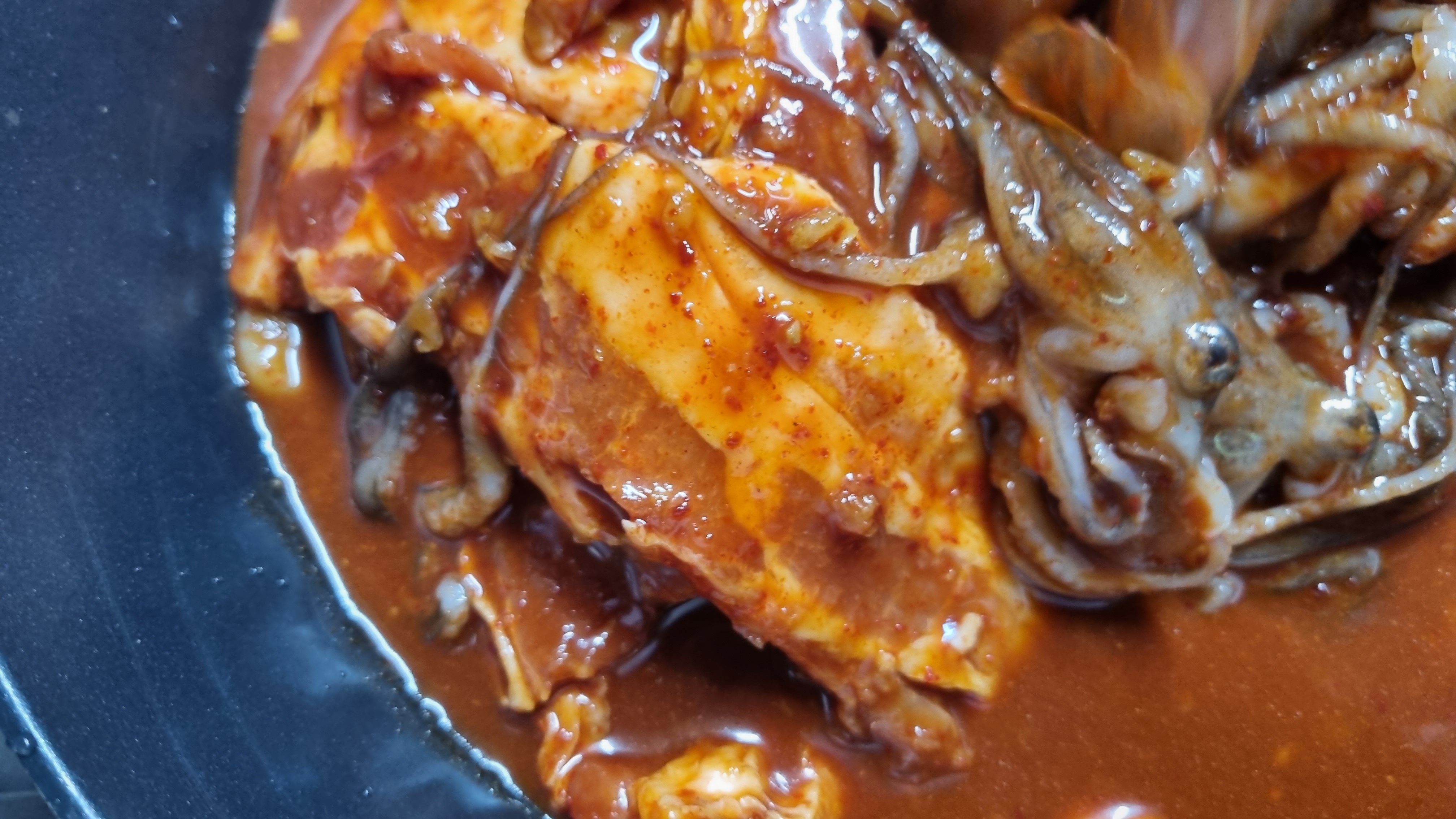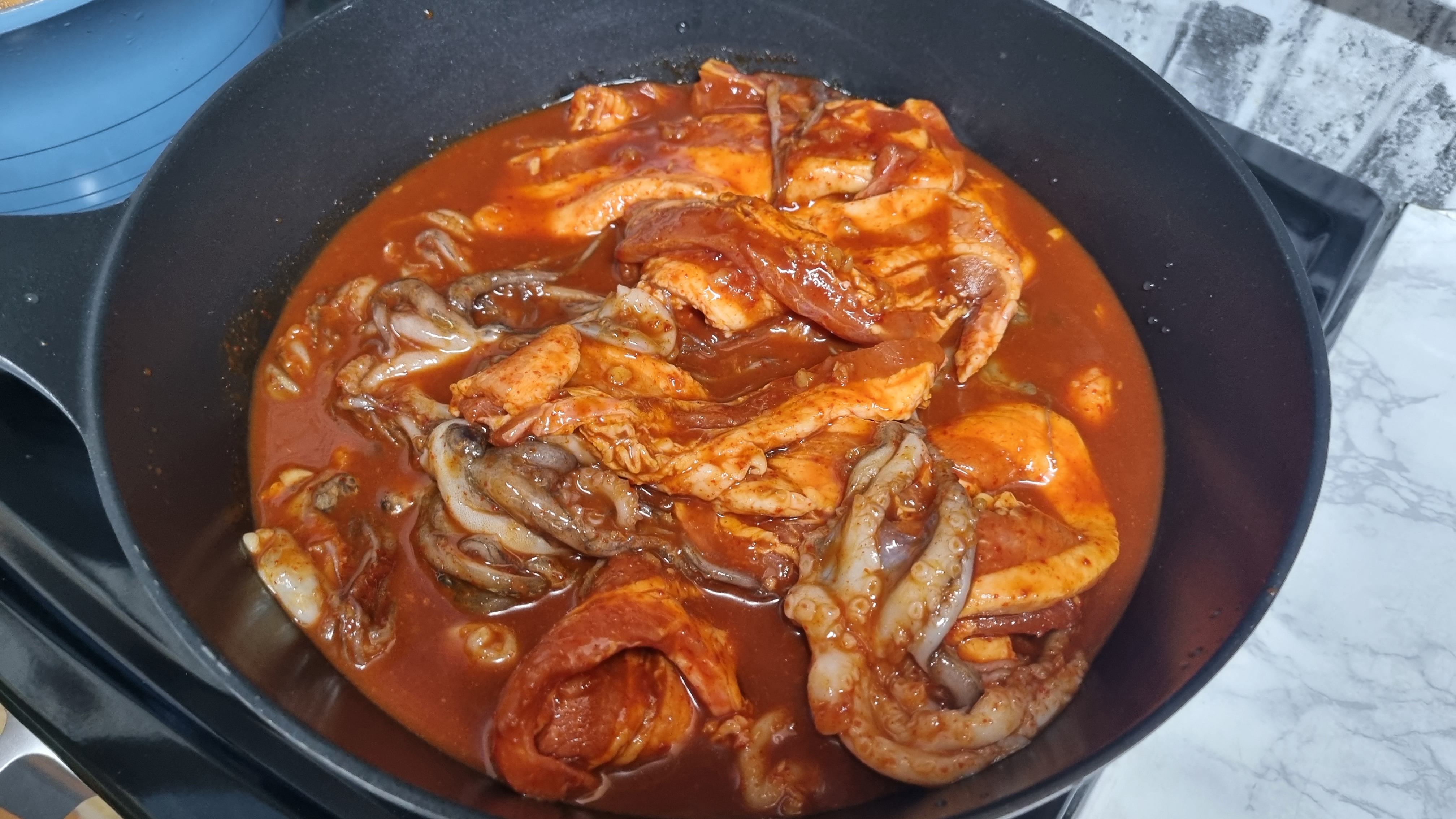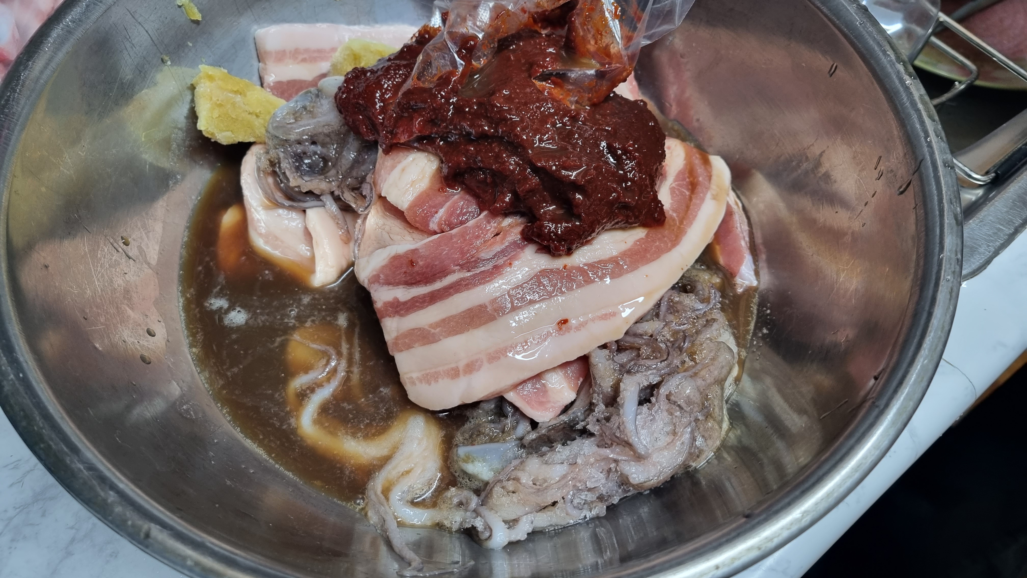 물엿을 넣어주면 마무리되는데 별도로 물을 넣지 않아도 위의 사진처럼 물이 많이 나와 있습니다. 이는 양파즙을 하나 넣었고 또한 주꾸미나 삼겹살이 있는 물이 고추장과 섞어지면서 이렇게 되는 듯합니다.