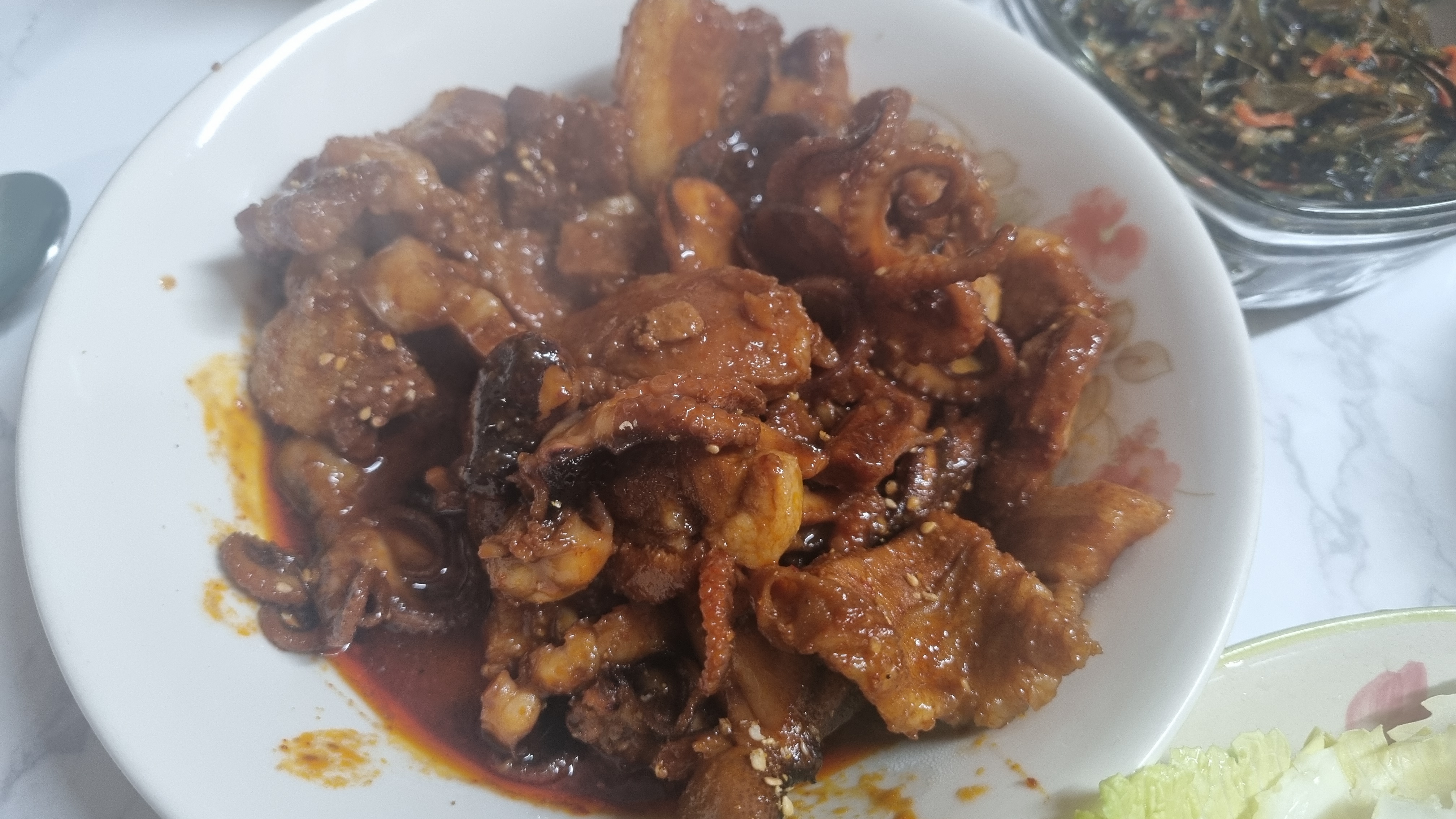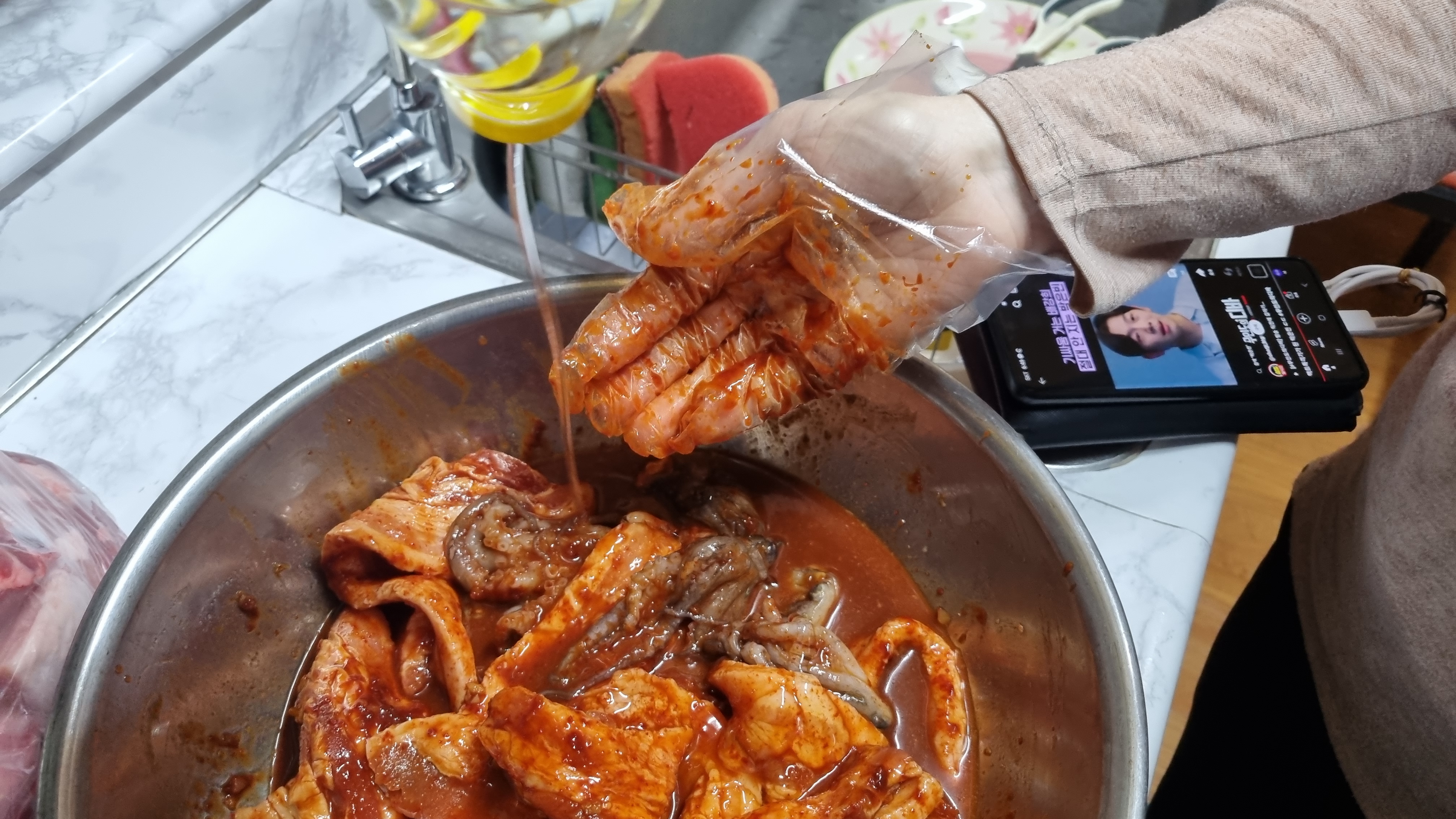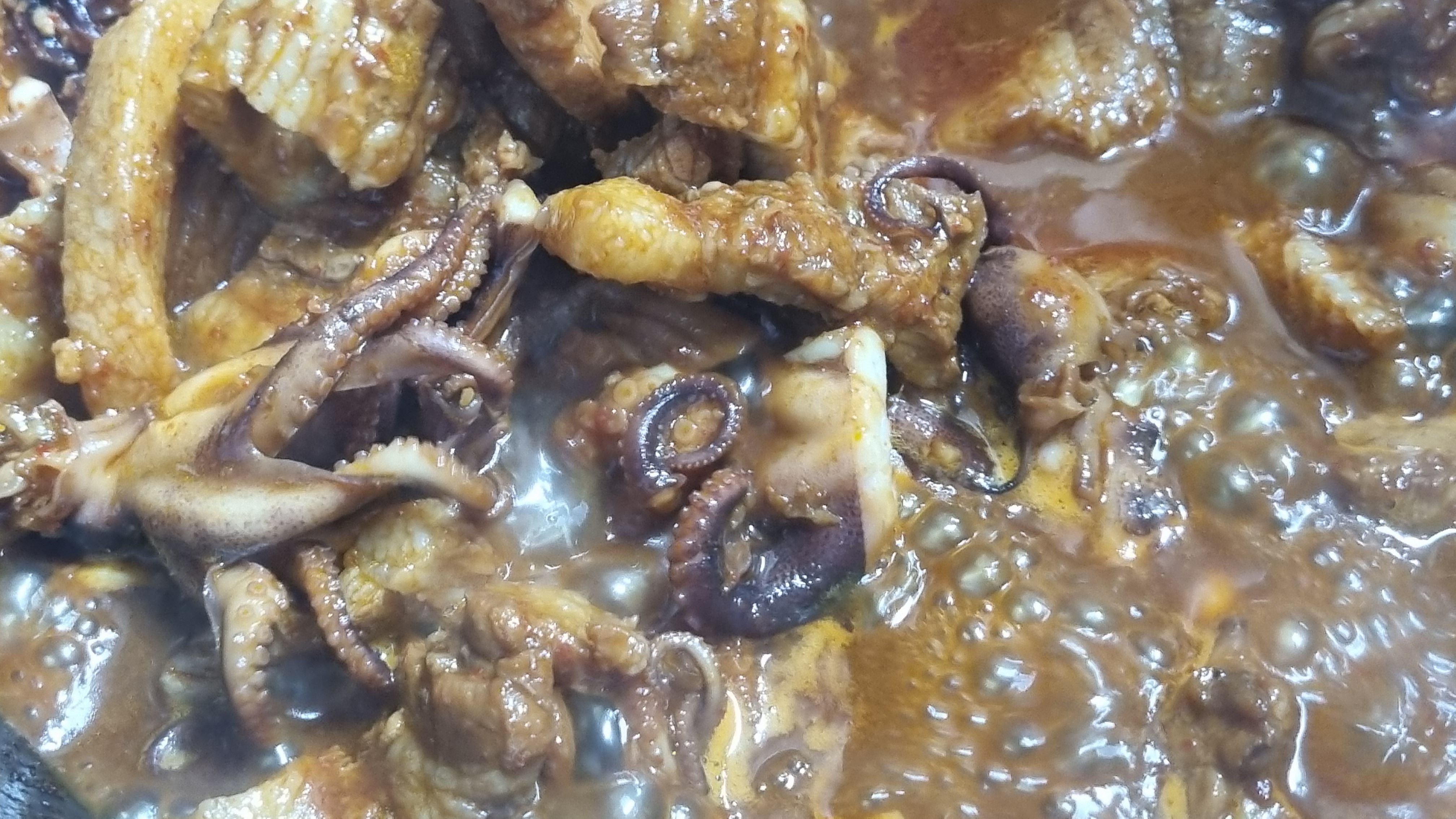 물엿을 넣어주면 마무리되는데 별도로 물을 넣지 않아도 위의 사진처럼 물이 많이 나와 있습니다. 이는 양파즙을 하나 넣었고 또한 주꾸미나 삼겹살이 있는 물이 고추장과 섞어지면서 이렇게 되는 듯합니다.