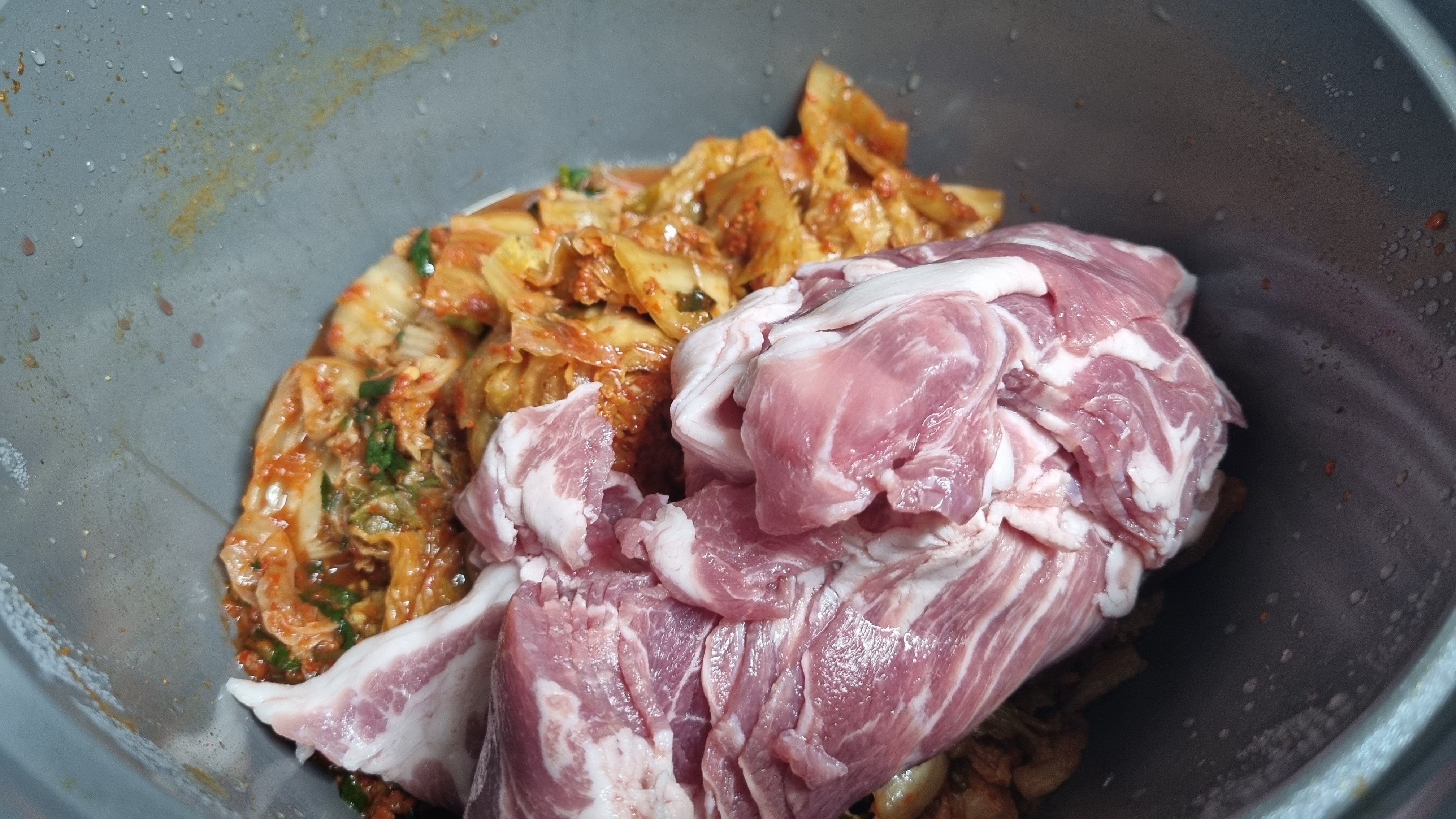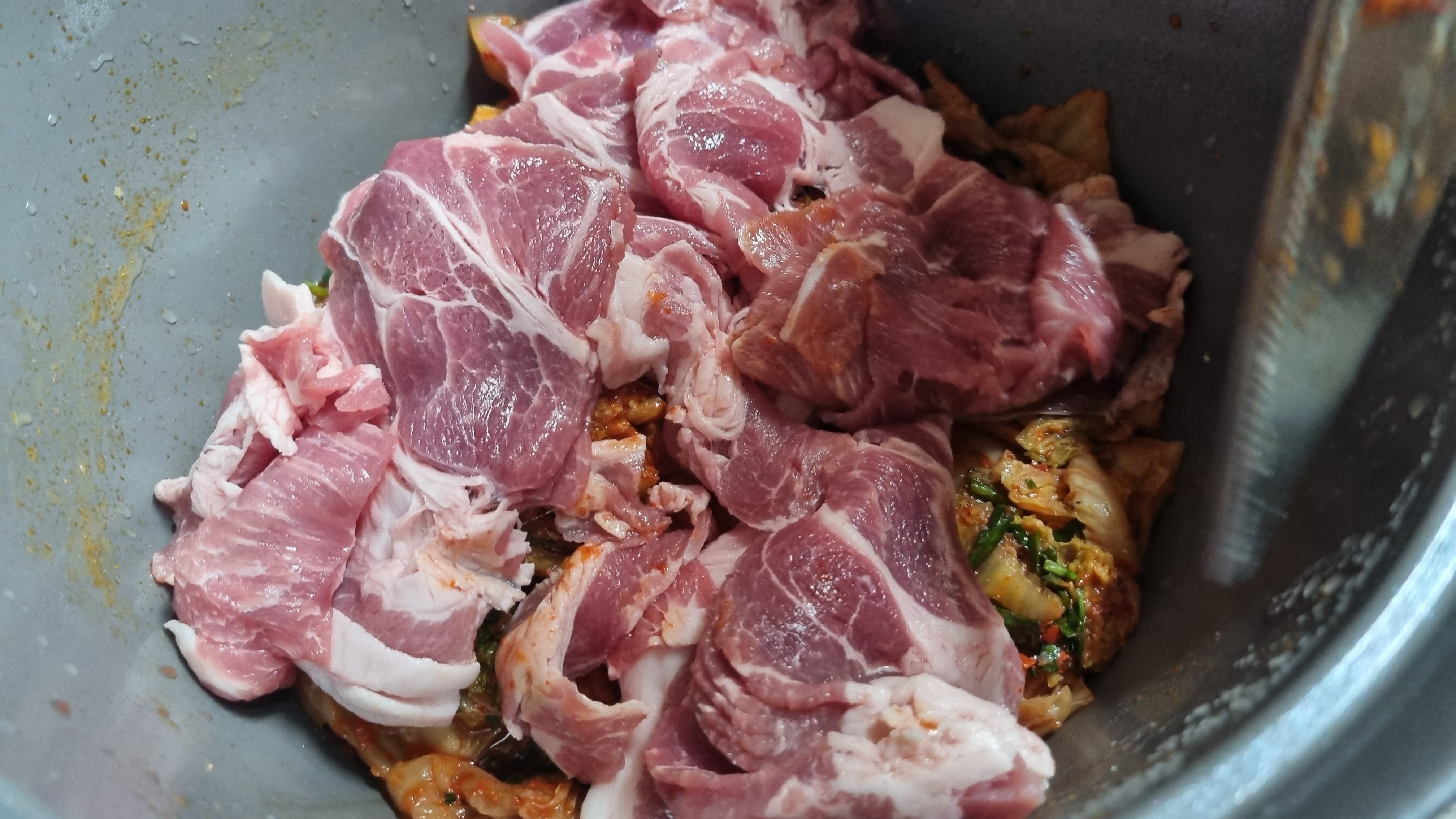 먼저 김치를 냄비에 넣고 이어서 돼지고기를 넣습니다. 돼지고기 부위는 앞다리살이나 뒤다리살 모두 상관이 없으며 제육용으로 저렴한 부위를 구입하여 만드시면 됩니다.