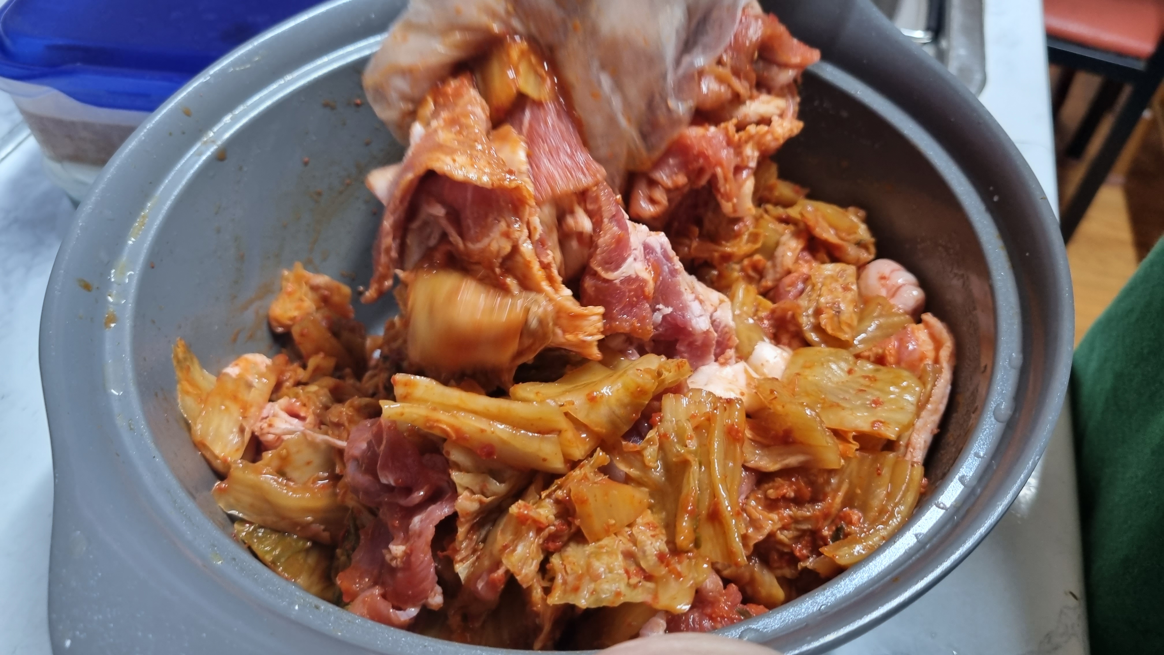 다음으로 중요한 것이 이렇게 고기에 김치의 양념이 잘 스며들도록 혼합하여 주는 것입니다. 이때 다진 마늘도 넣으면 되며 최대한 김치와 잘 혼합합니다.