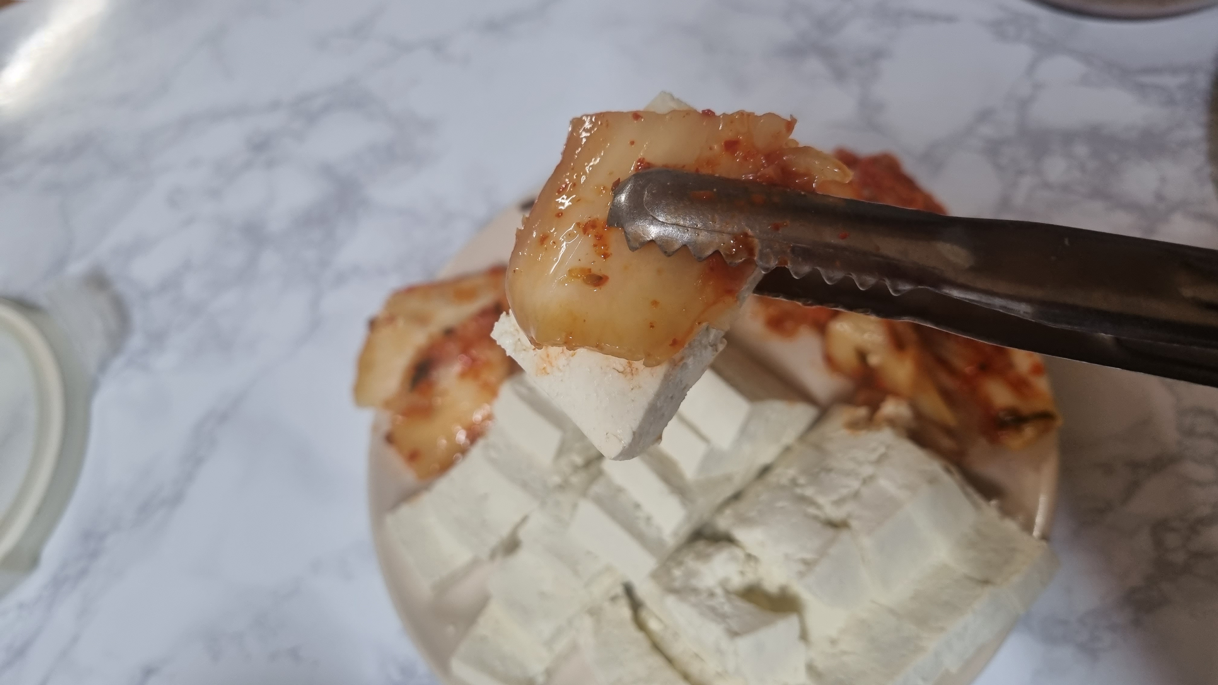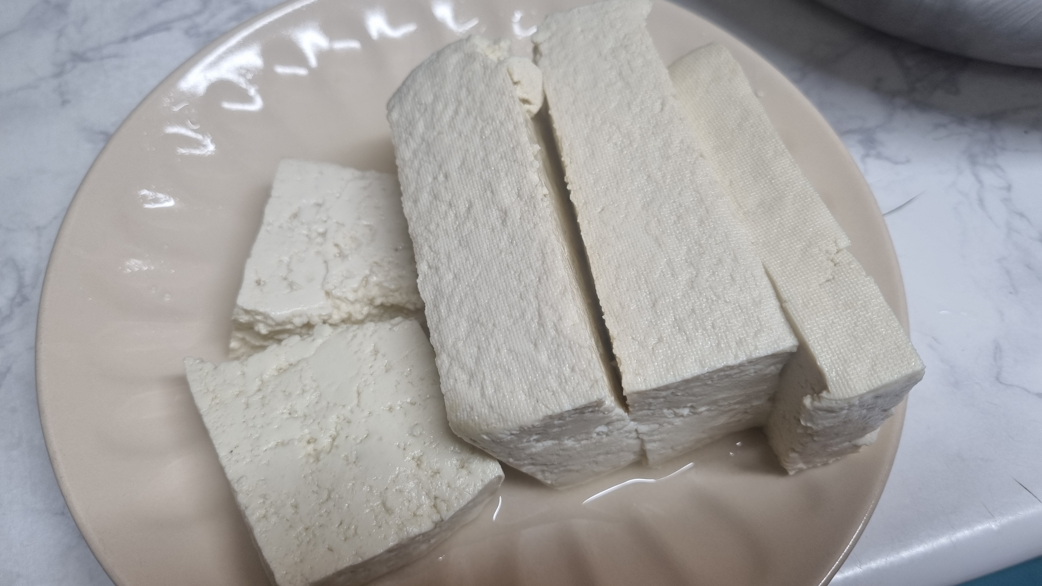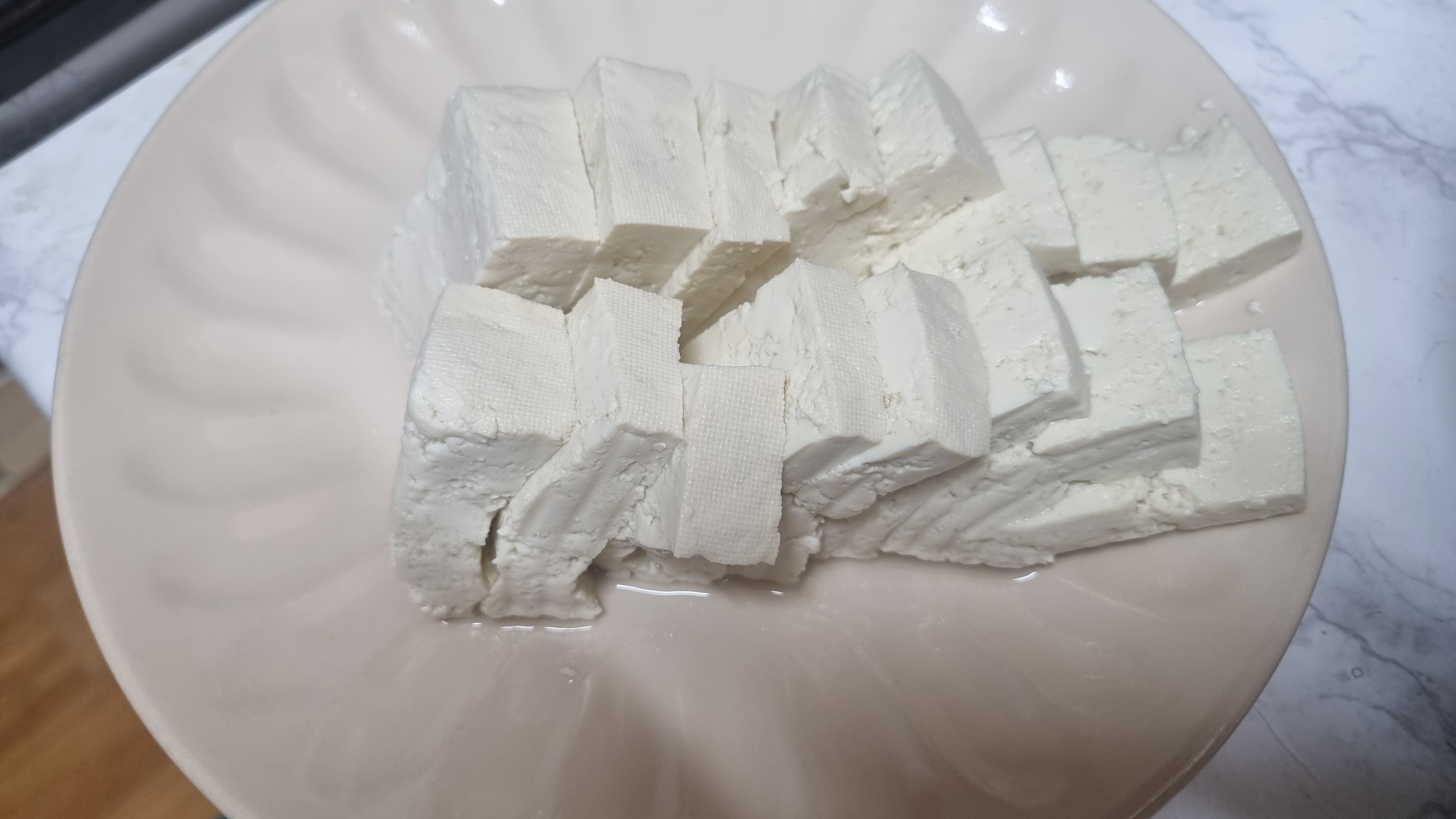 이렇게 데친 두부는 바로 접시에 담아 본인들이 가장 먹기 좋은 크기로 잘라 놓는데 접시 바닥에 두부에서 나온 물이 있으므로 제거하여 줍니다.