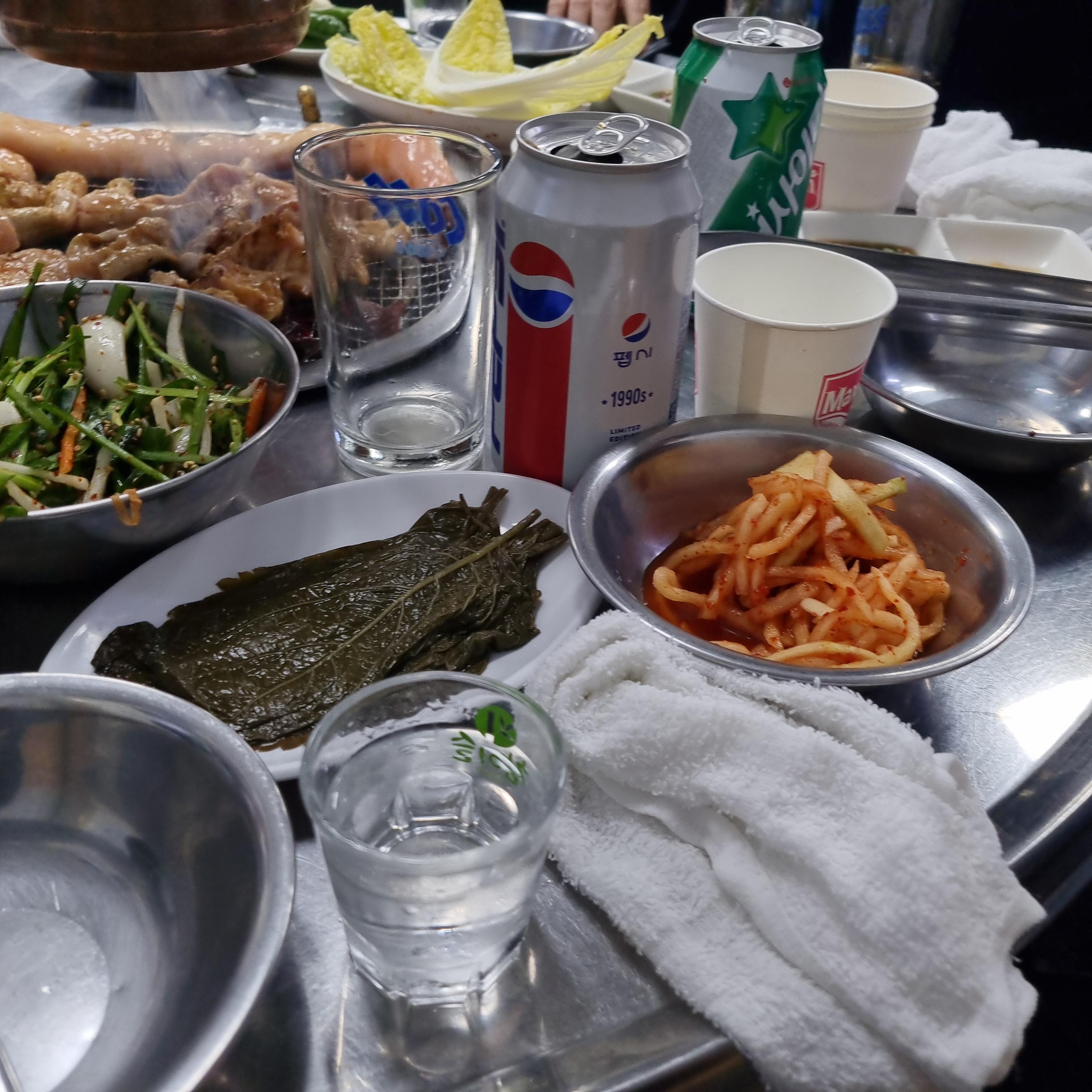 부추김치와 깻잎절임 김치등과 각종 양념소스가 몇 가지 있고 천엽과 소 간이 서비스로 조금 나옵니다.