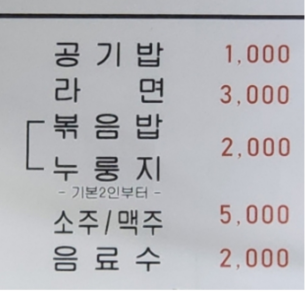 후식으로 공기밥 천원 라면 3천원 볶음밥과 누룽지가 2천원씩입니다.