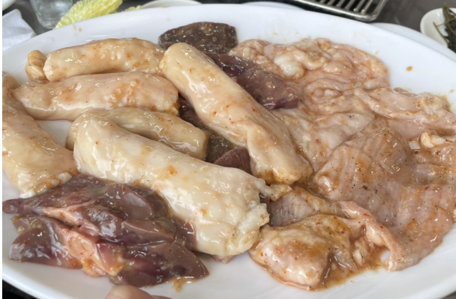 서비스로 나오는 천엽과 간입니다. 아주 싱싱하거라 바로 생식으로 드셔도 되며 필자는 천엽을 생식으로 바로 먹었는데 정말 맛있었습니다.