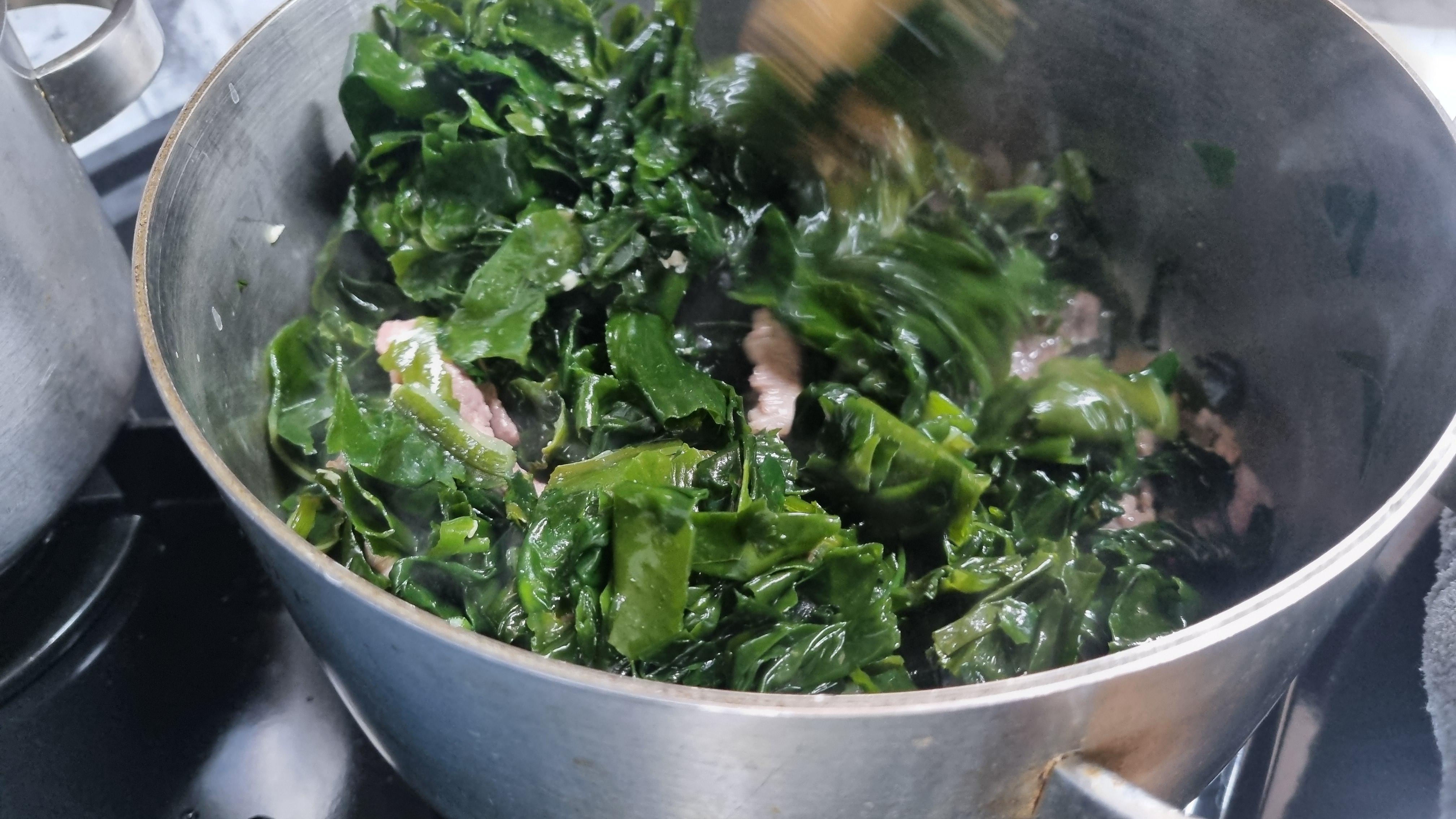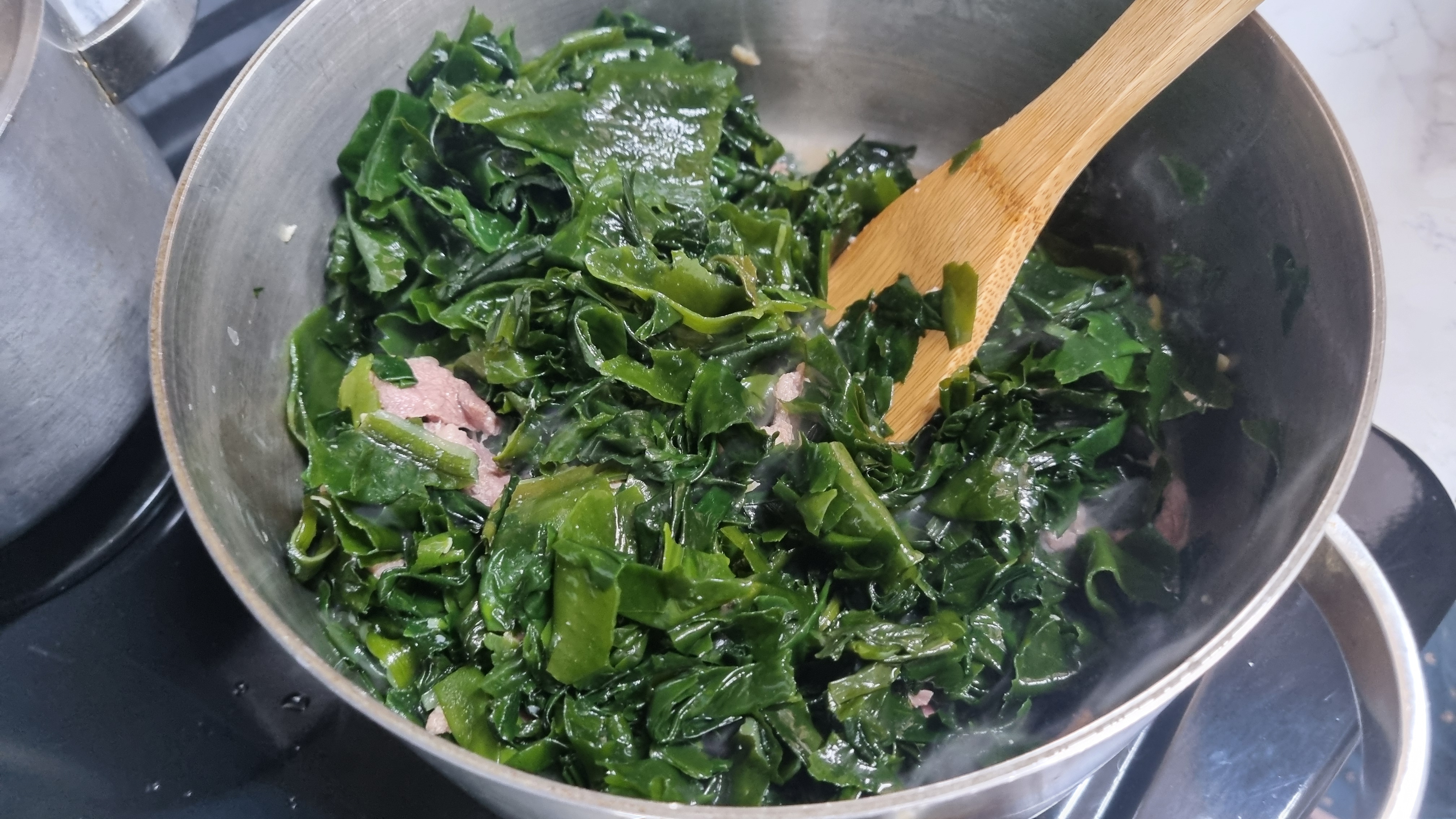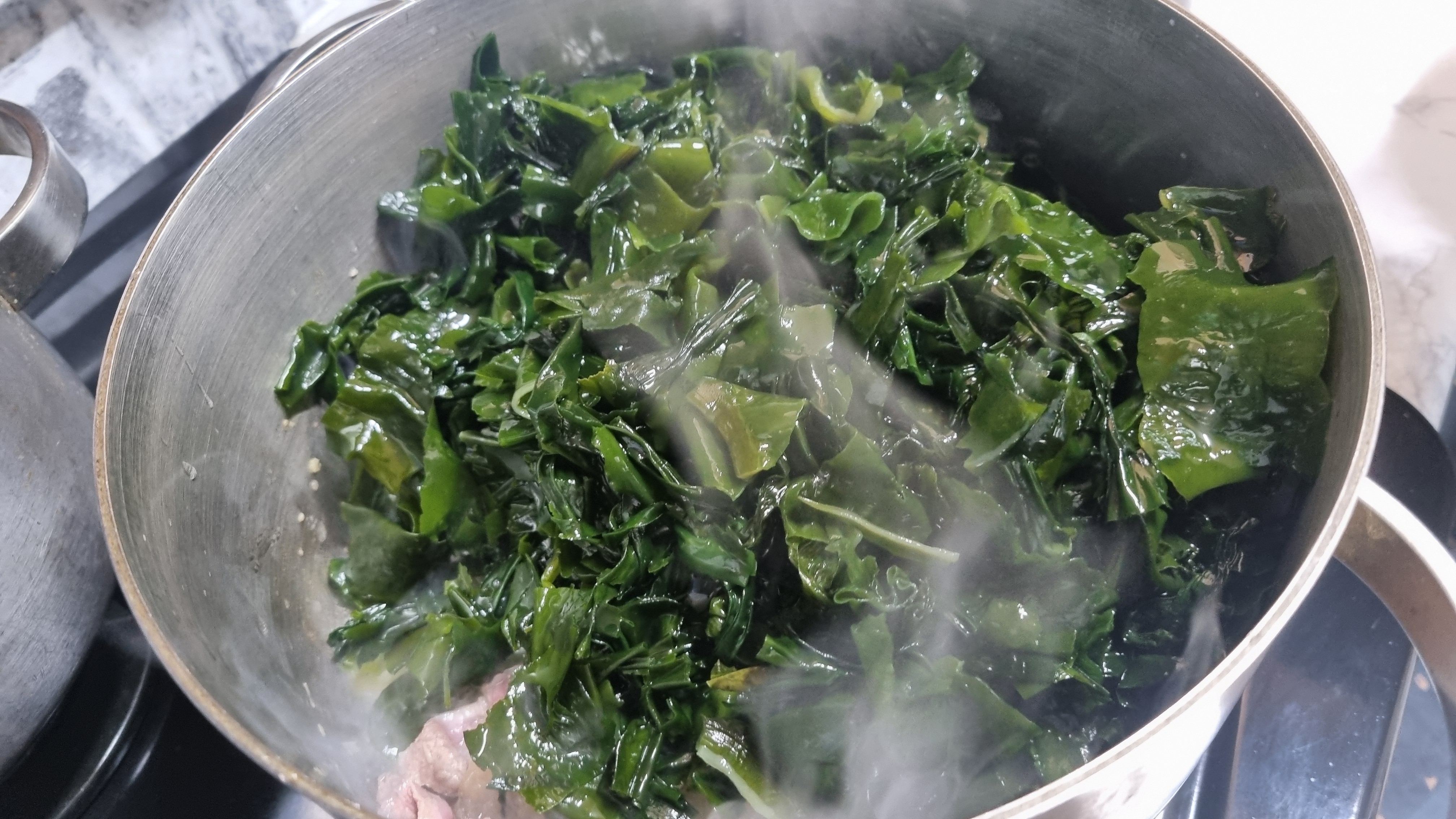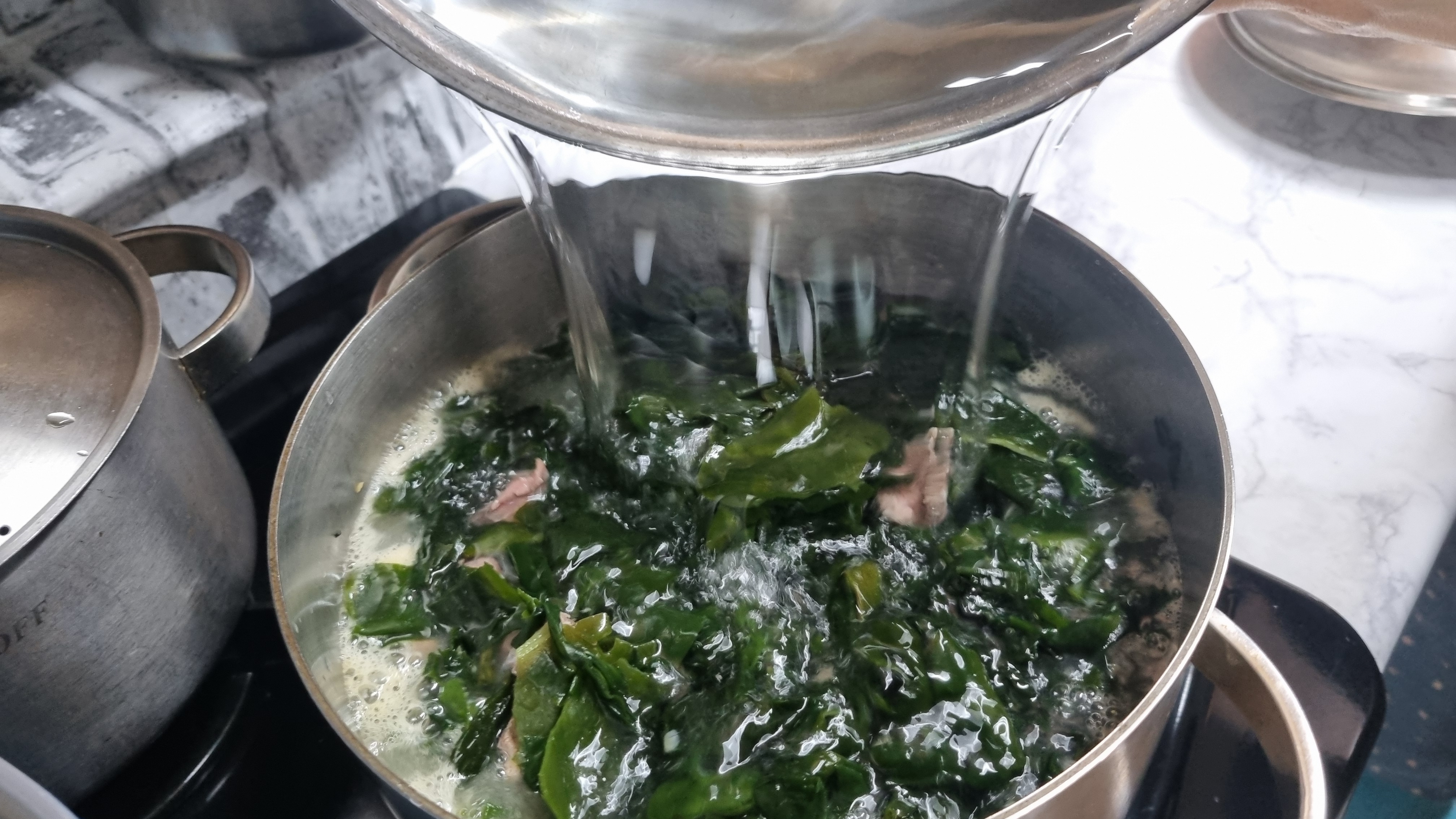 소고기를 볶은 후 바로 미역을 넣어 함께 그대로 볶아주는데 살짝살짝 저어주면서 볶아줍니다. 이때 식용유를 찻숟가락 하나정도 넣으면서 볶으면 좋은데 더 고소한 미역국을 만들 수 있습니다.