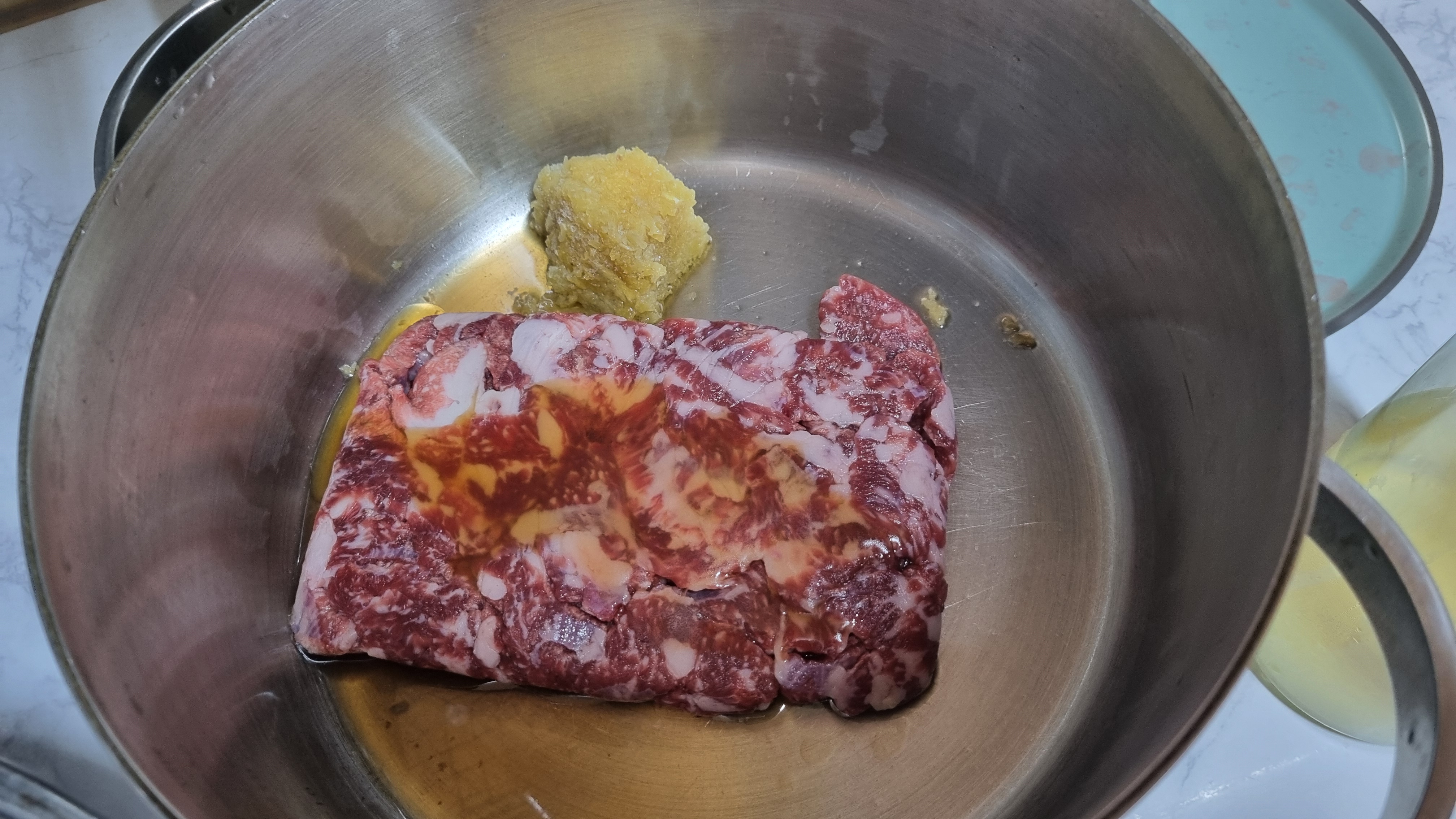 간장과 다짐마늘을 넣고 소고기와 함께 볶는데 미역국을 끓일 냄비에서 볶아주시면 됩니다. 간장이나 마늘등이 잘 섞어지도록 저어주면서 조리합니다.