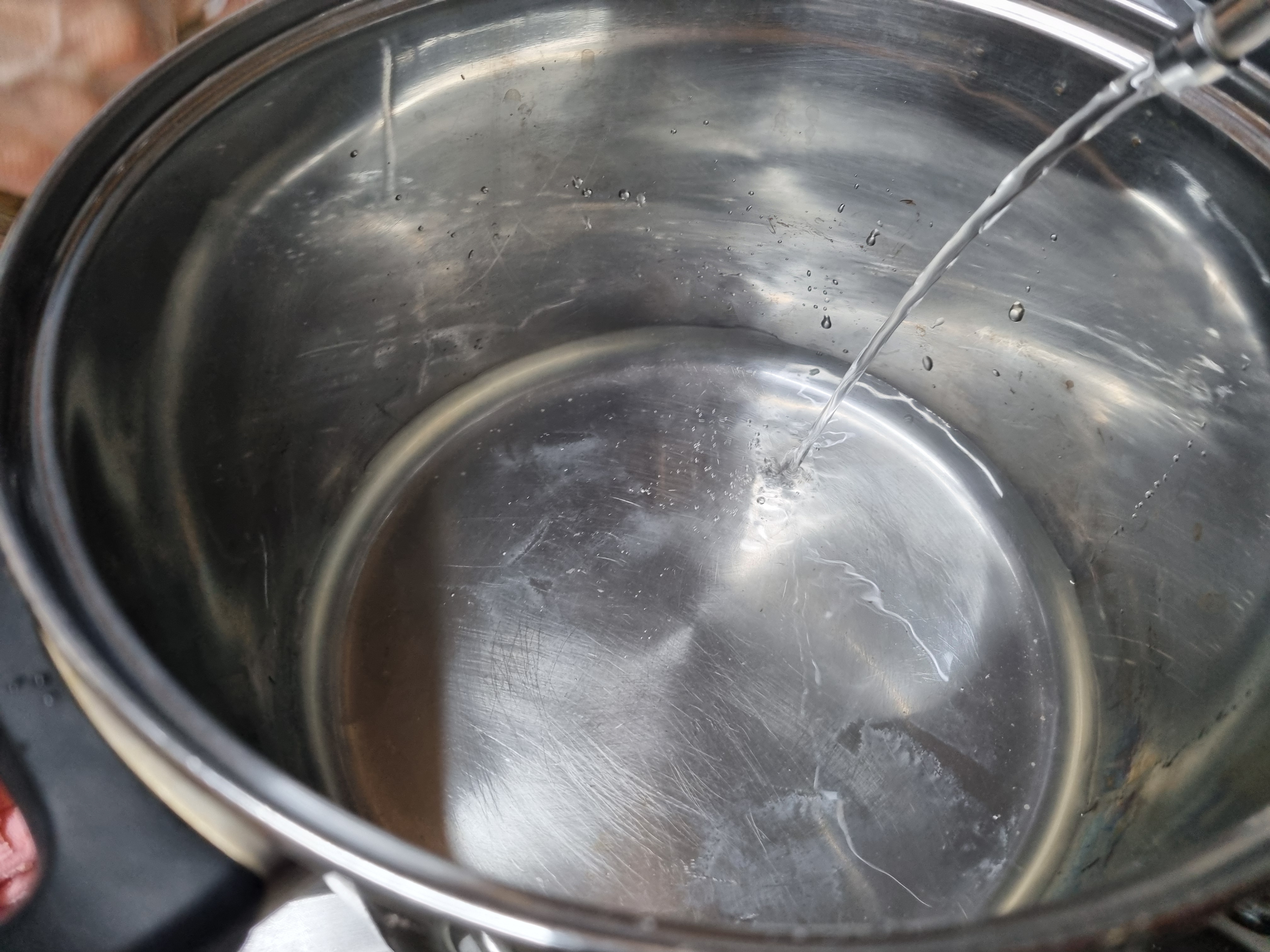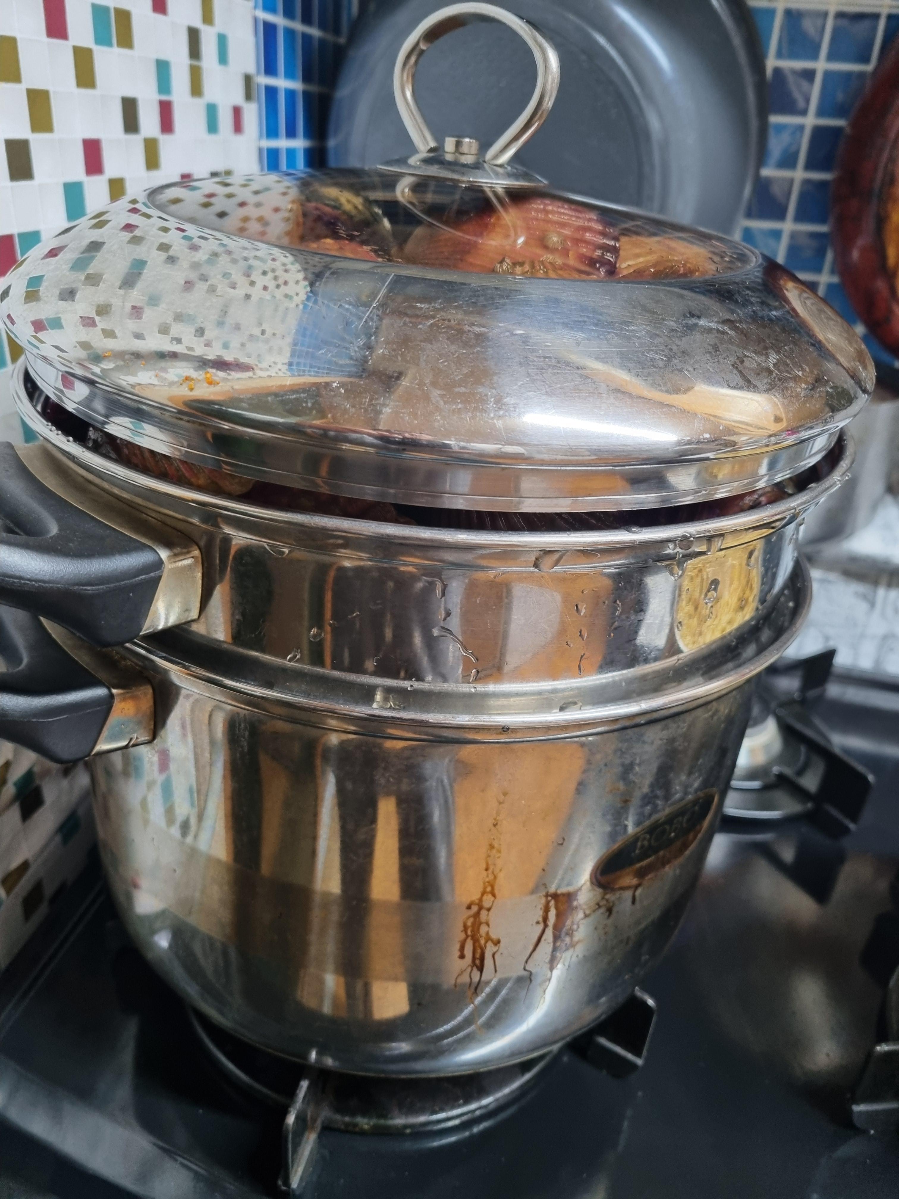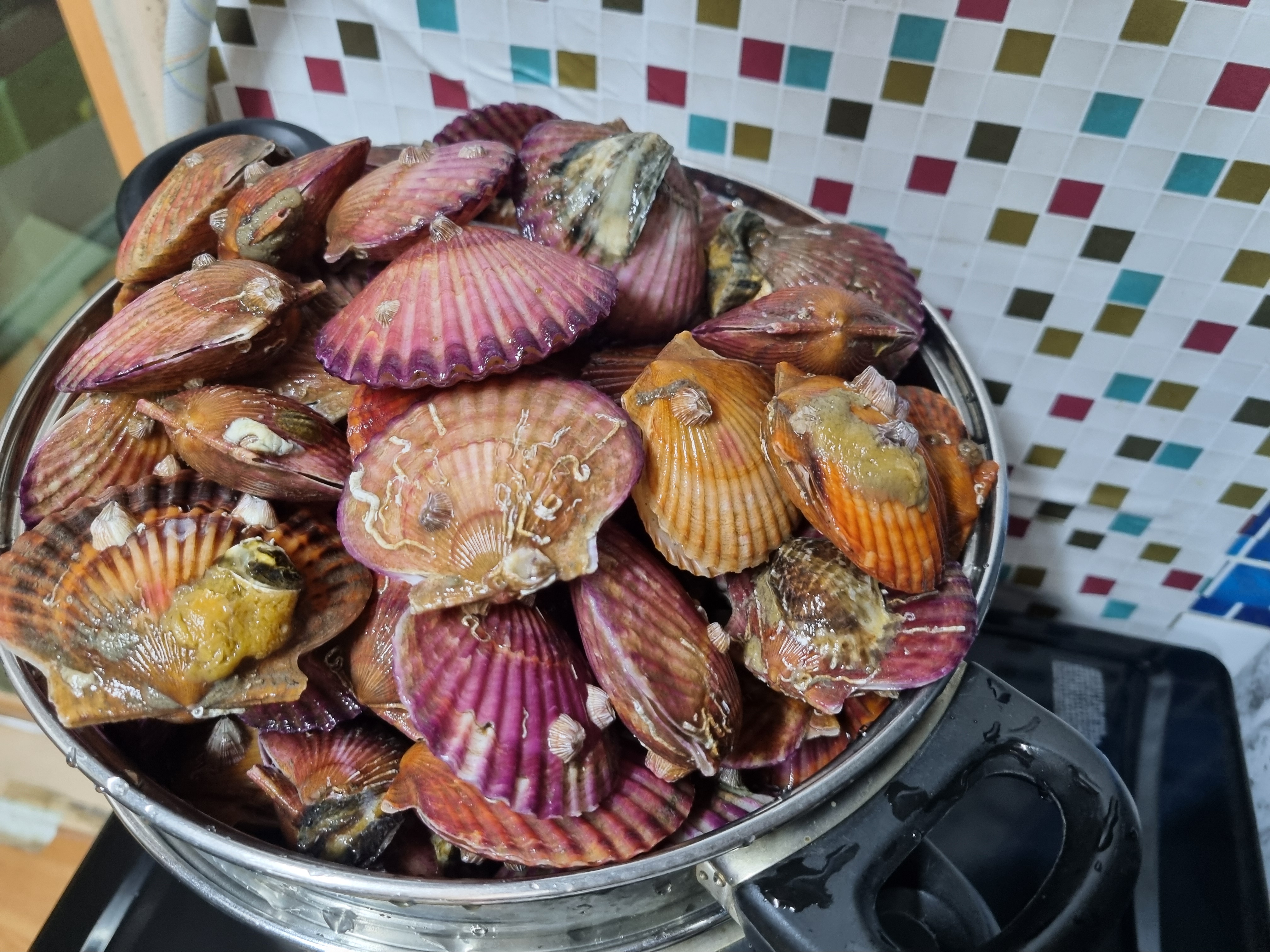 찜기의 바닥에는 물을 부어야 하는데 맥주컵 하나 정도면 충분합니다. 이 정도 물이면 찜기가 크거나 3~4kg의 가리비를 쪄도 충분합니다.
