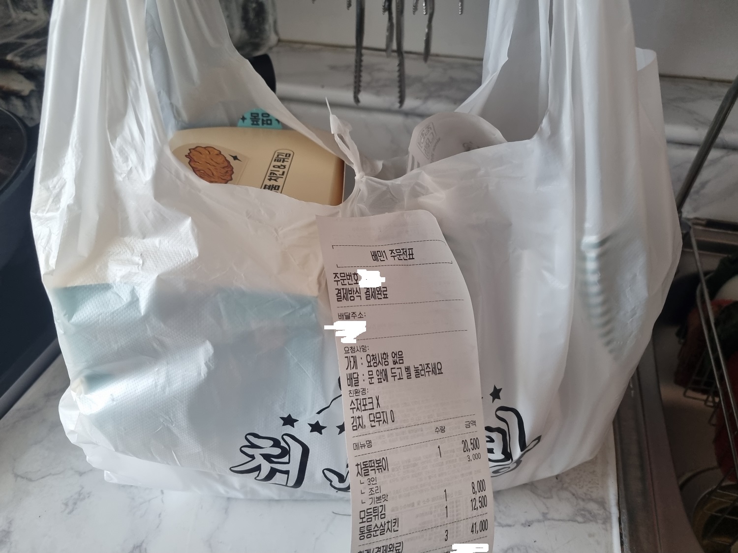 오늘 주문한 메뉴는 차돌똑볶이 20,500원이며 모듬튀김 8천원이며 통통순살치킨 12,500원으로 총 41,000원의 음식인데 여기에 배달료 4천운이 추가됨니다.