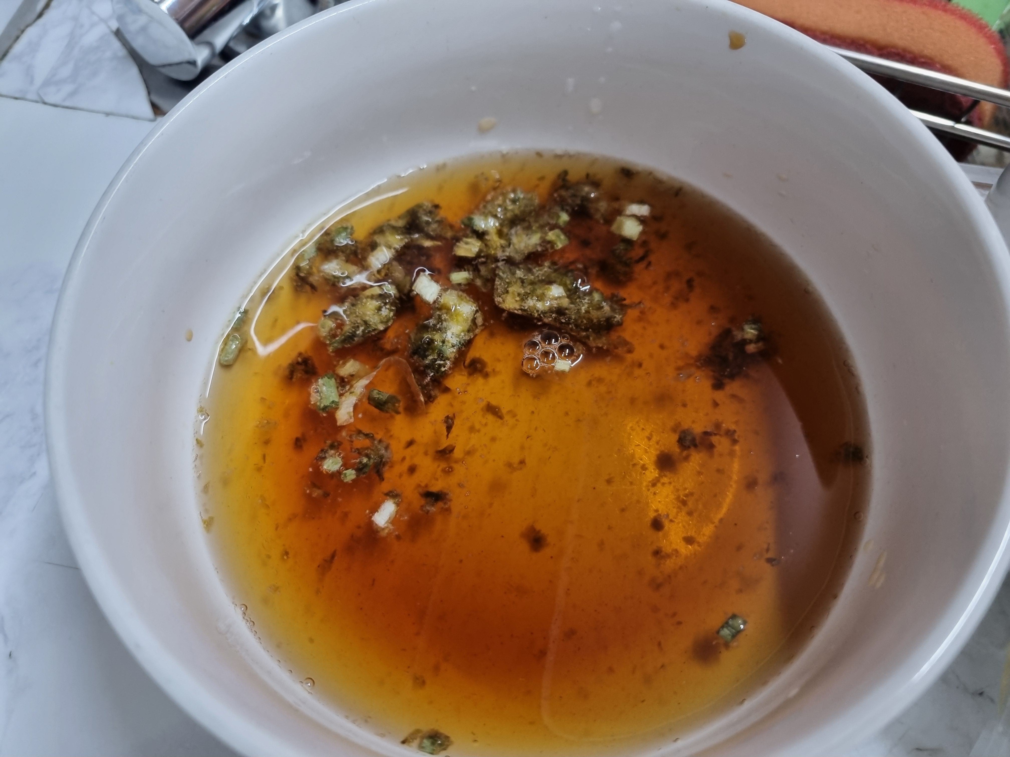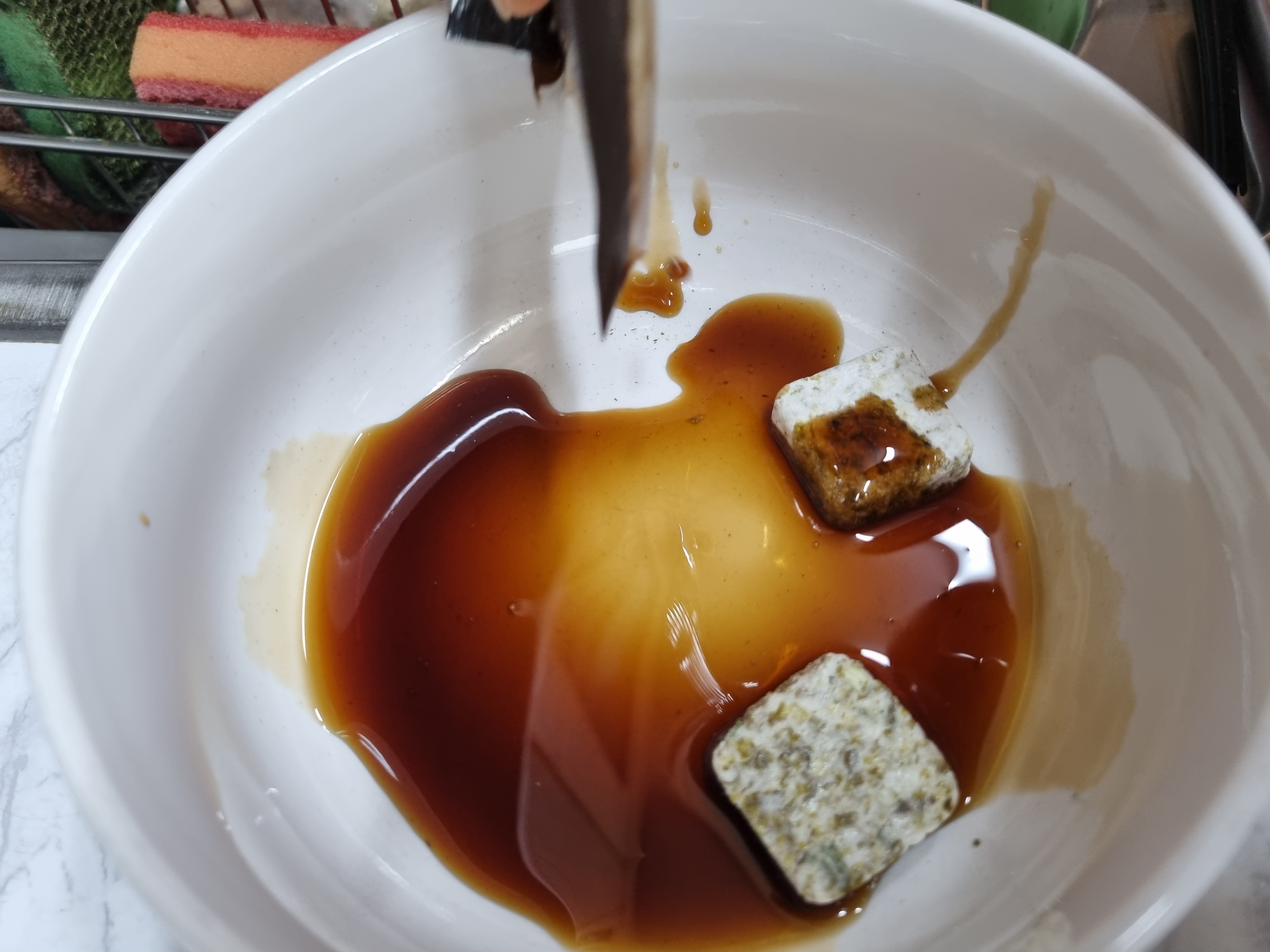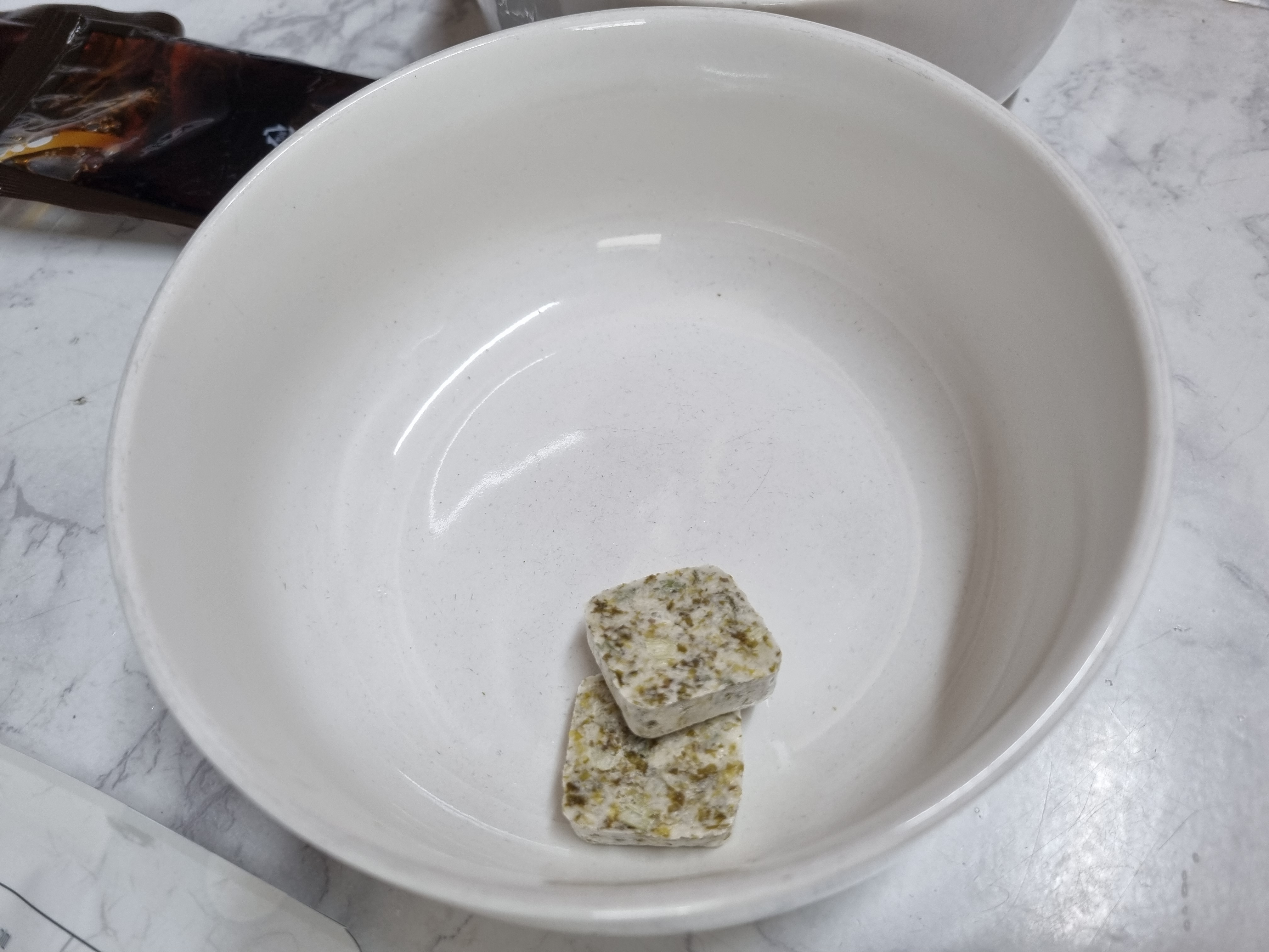 그릇에 무블럭과 액상소스를 위의 사진같이 넣습니다. 그릇은 라면 끓여드실때 크기의 정도면 가능하고 이때 물을 함께 넣어 무블럭을 풀어줘야 합니다.