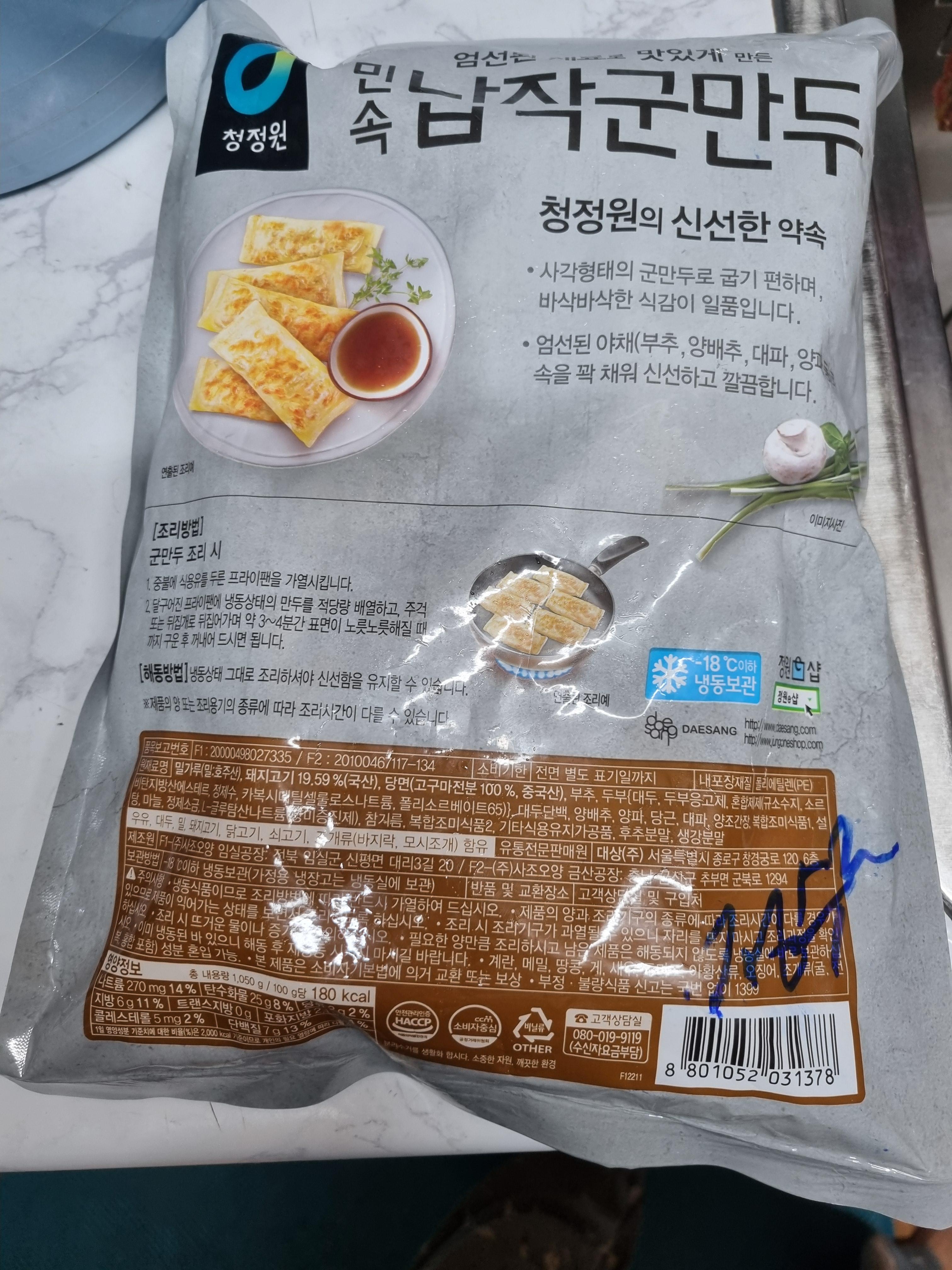 뒤면에 주요 성분과 조리방법에 대해 나와 있으며 일반적으로 구워 먹는 음식은 프라이팬이나 에어프라이어로 조리하는데 군만두는 특성성 에어프라이어에서 구우면 맛이 떨어져 프라이팬에서 구워야 맛있습니다.