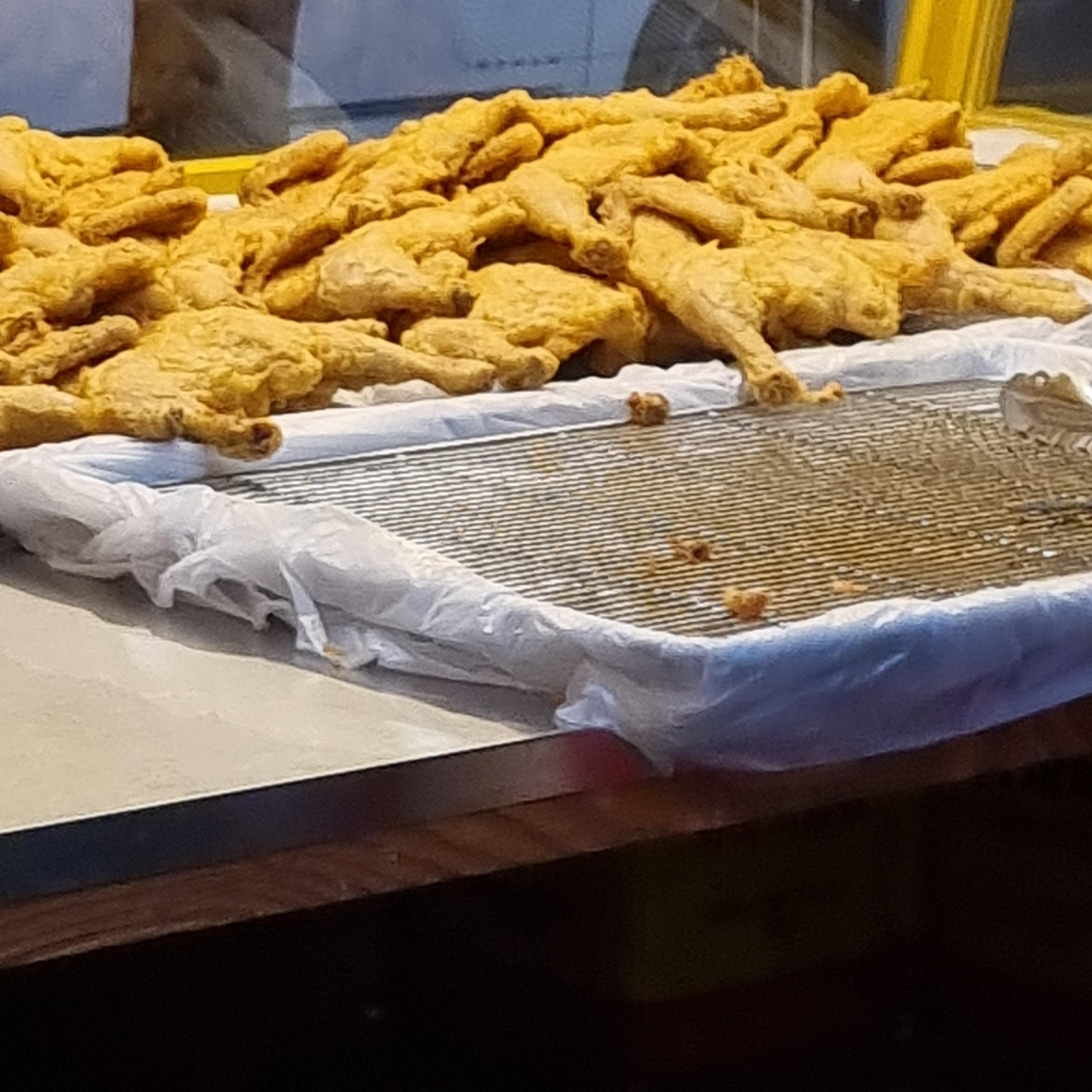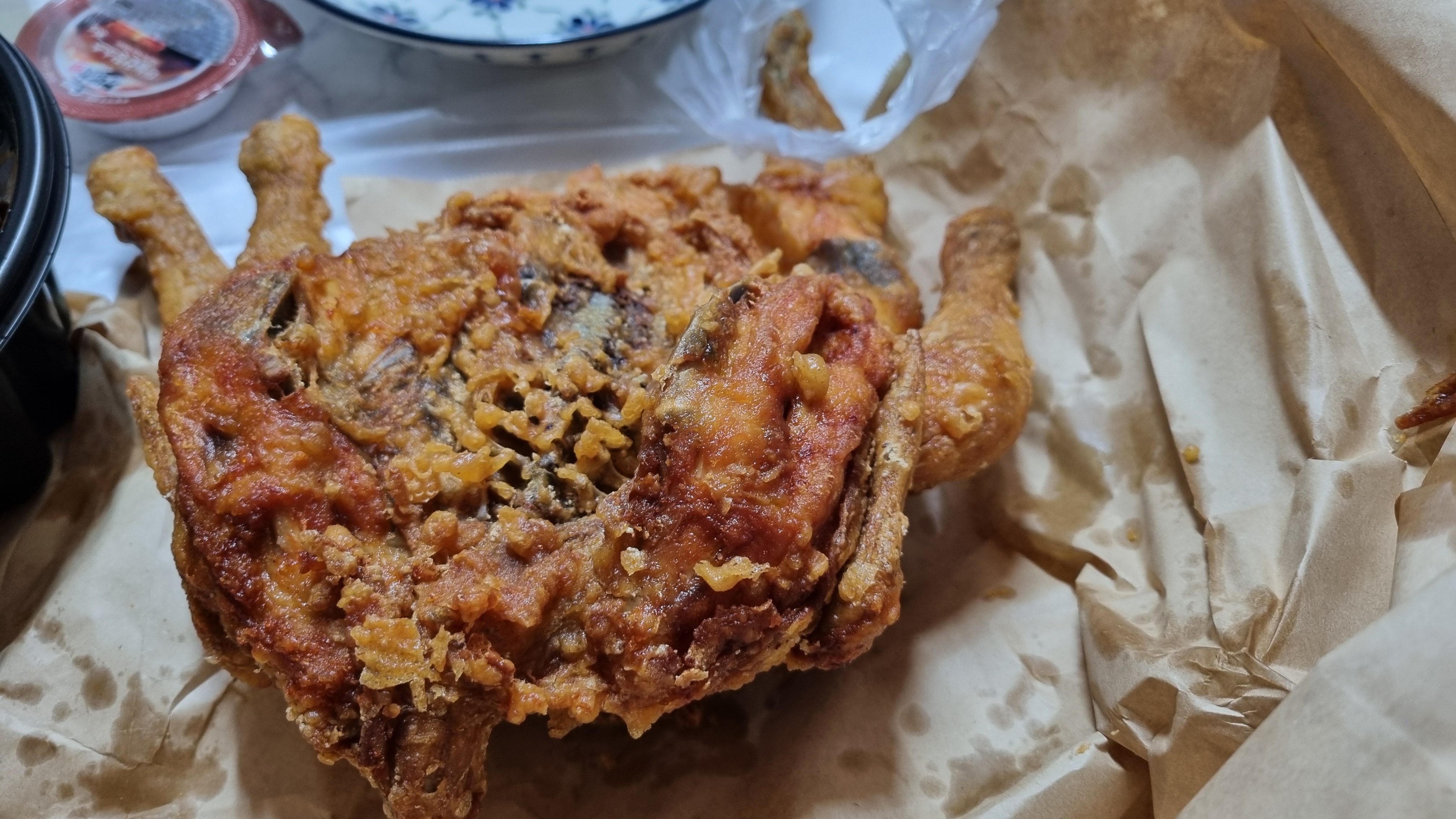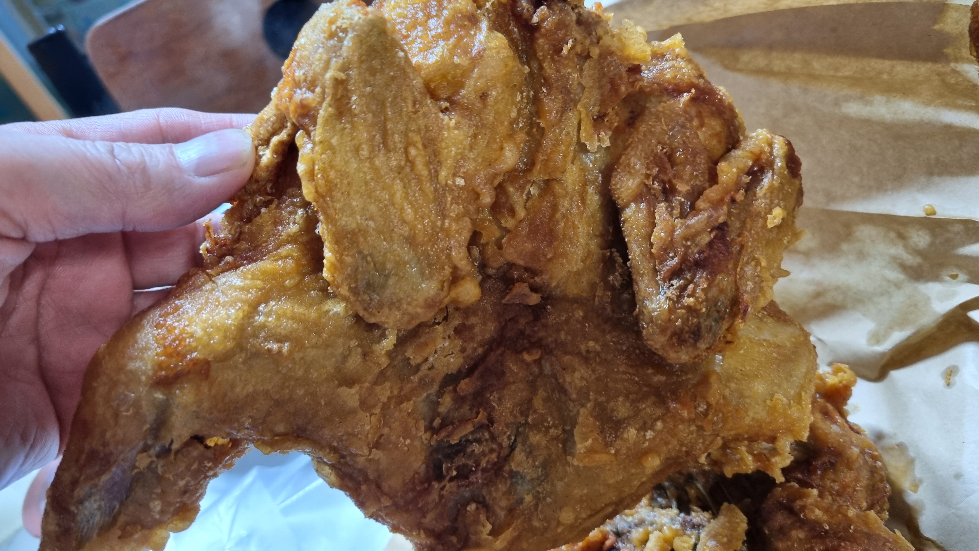 이것이 두 마리에 17,000원짜리 통닭인데 한 마리가 통째로 튀겨져 있는데 크기는 일반 치킨집에서 판매하는 닭보다는 약간 작은 크기입니다.