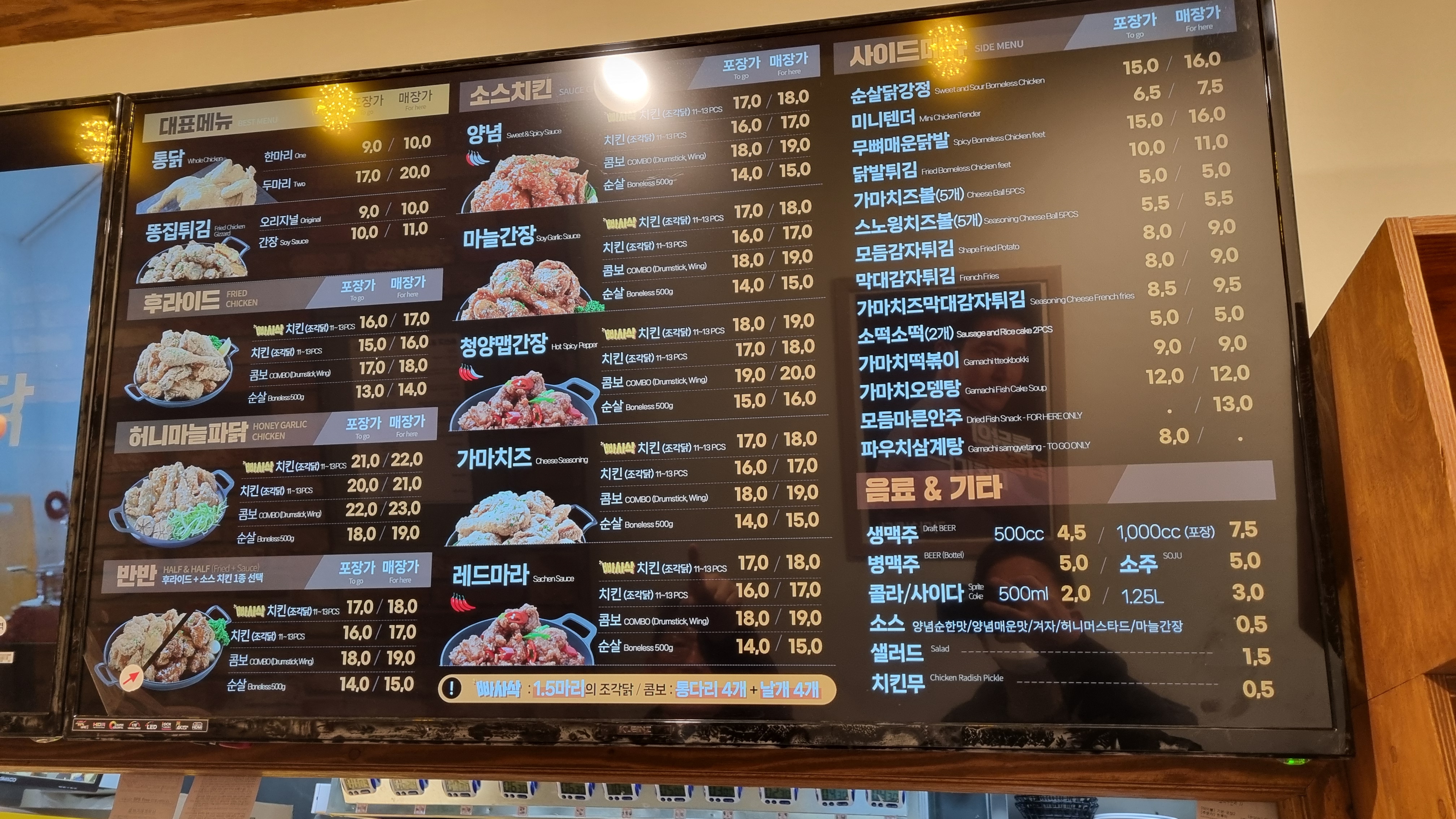 일반 후라이드에서부터 허니마늘 파닥, 마늘간장치킨, 양념등 정말 다양하면서 가격은 일반 치킨집 비교 10~15%는 저렴합니다.