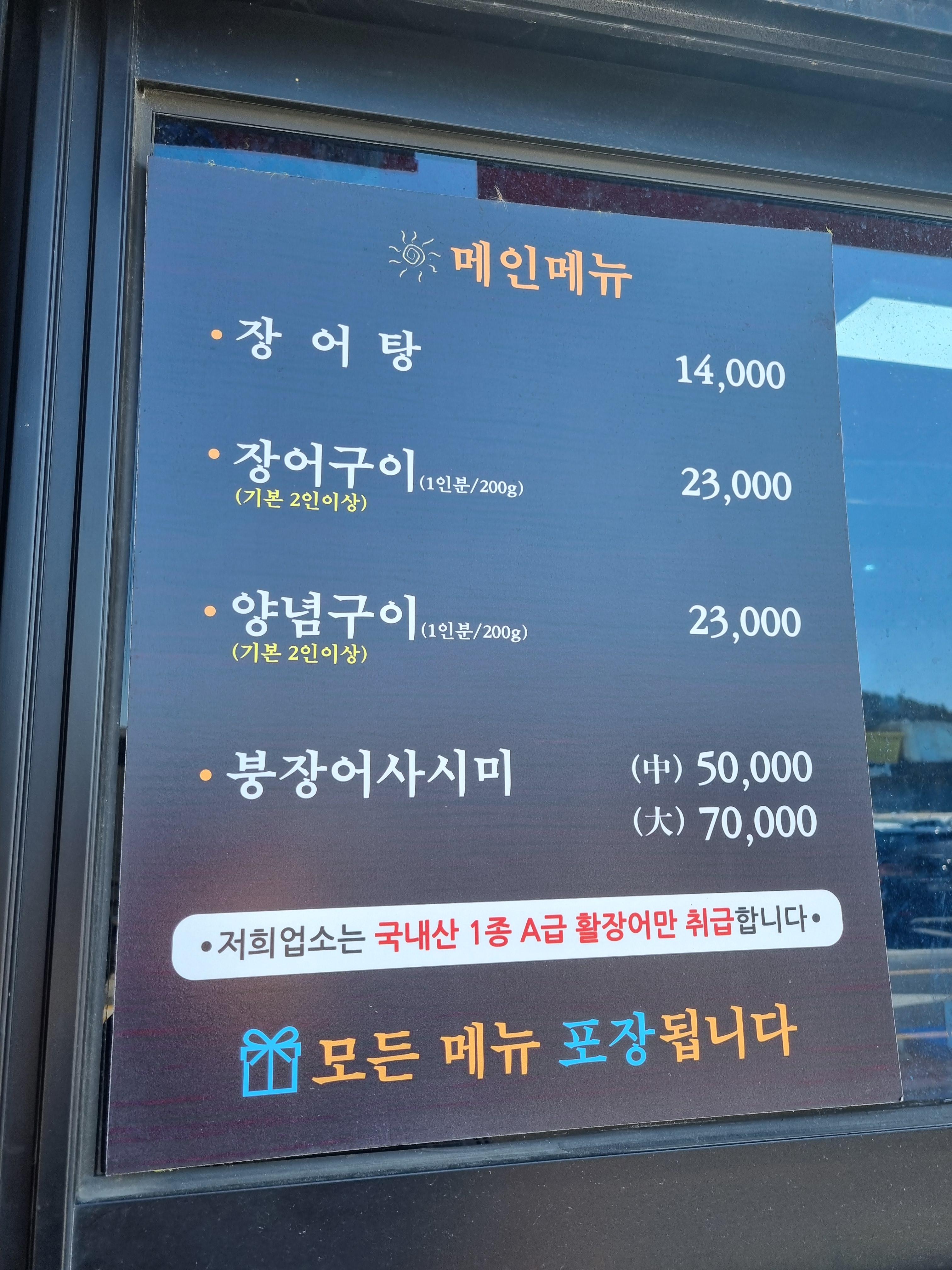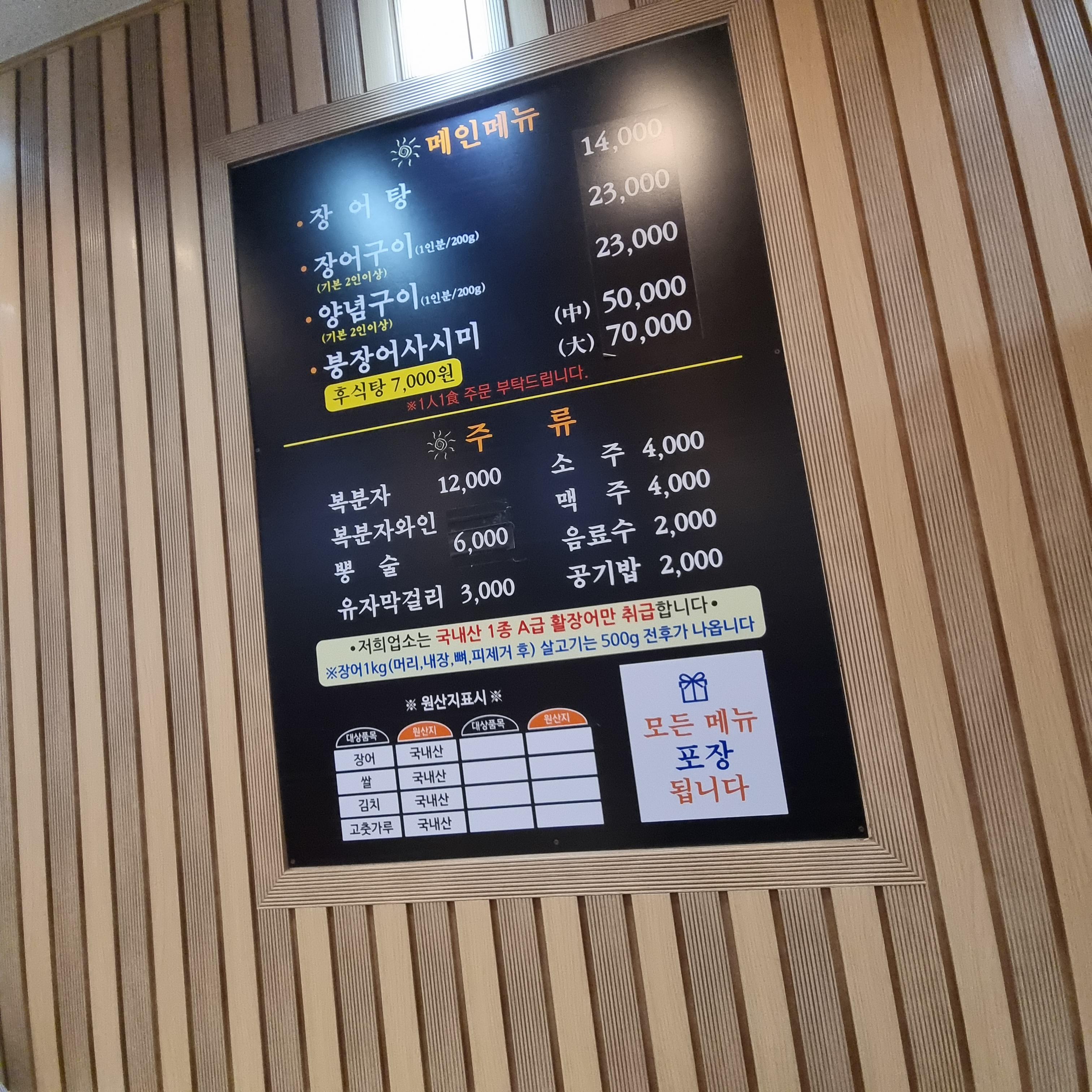 유명한 장어탕이 14,000원이며 장어구이,장어양념구이가 각각 23,000원인데 구이는 기본이 2인분 이상 주문해야 합니다.