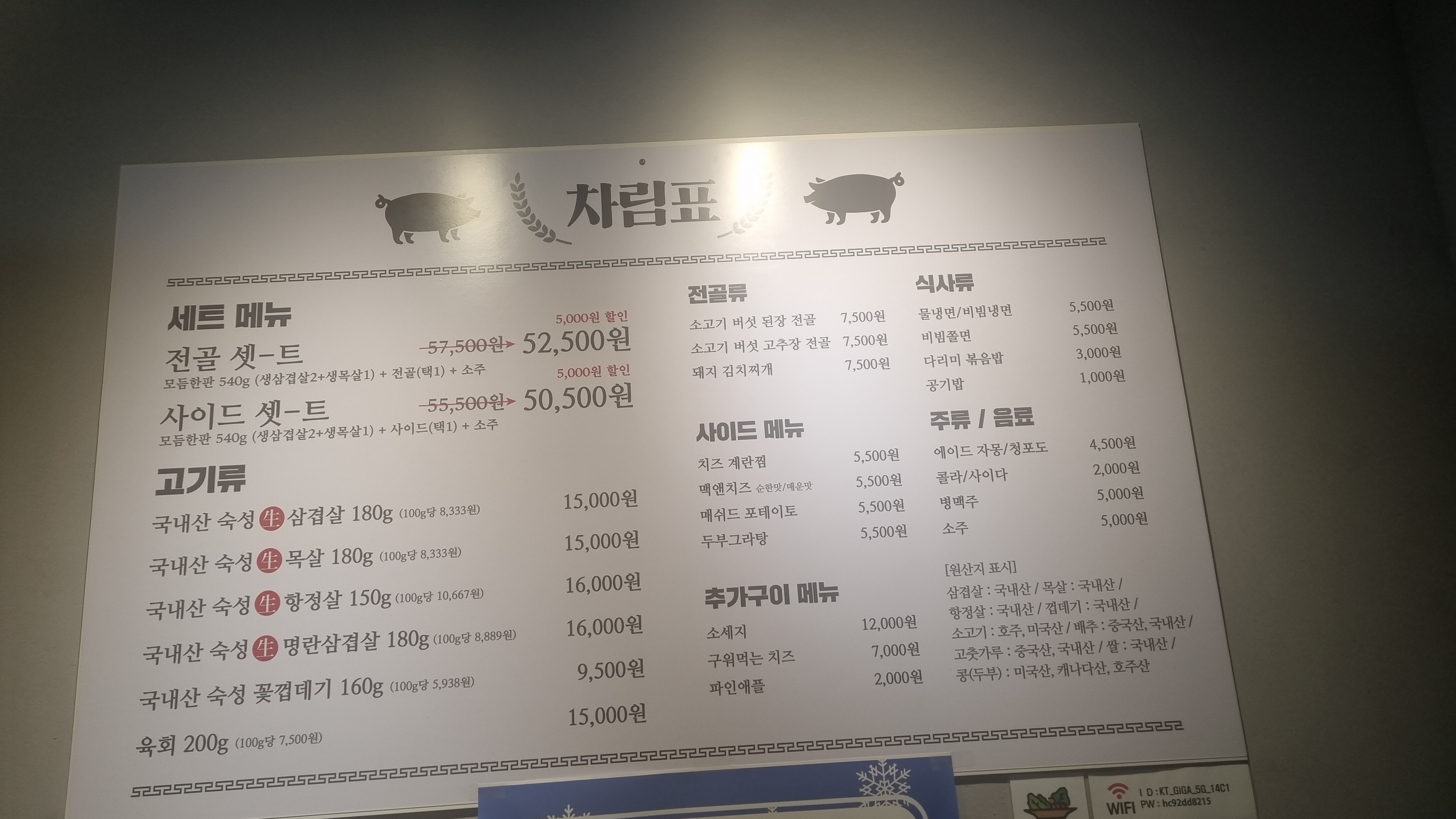 메뉴표이며 삼겹살은 180g에 15,000원이며 목살도 동일한 가격으로 다른 곳 보다 저렴한 편입니다.