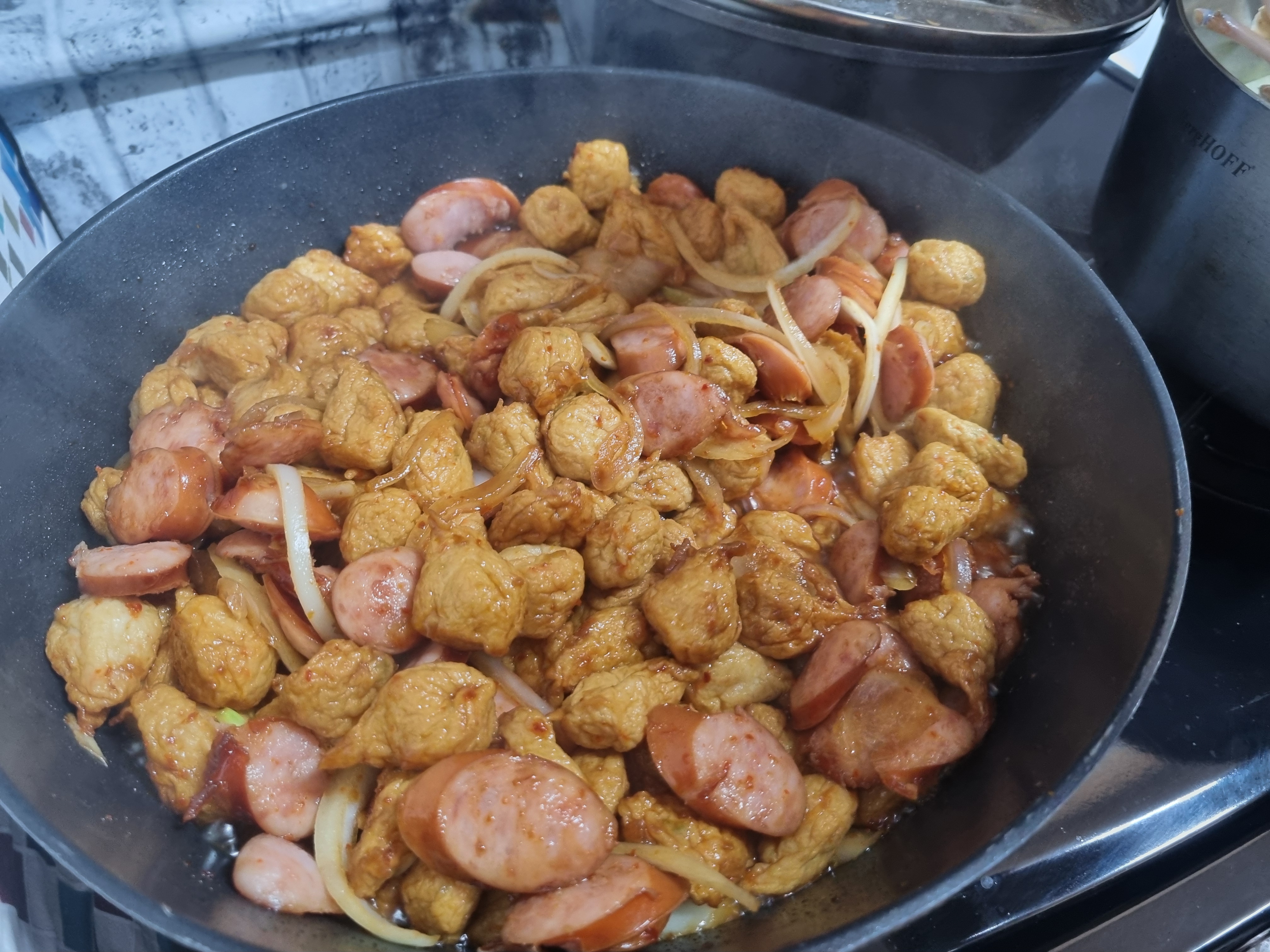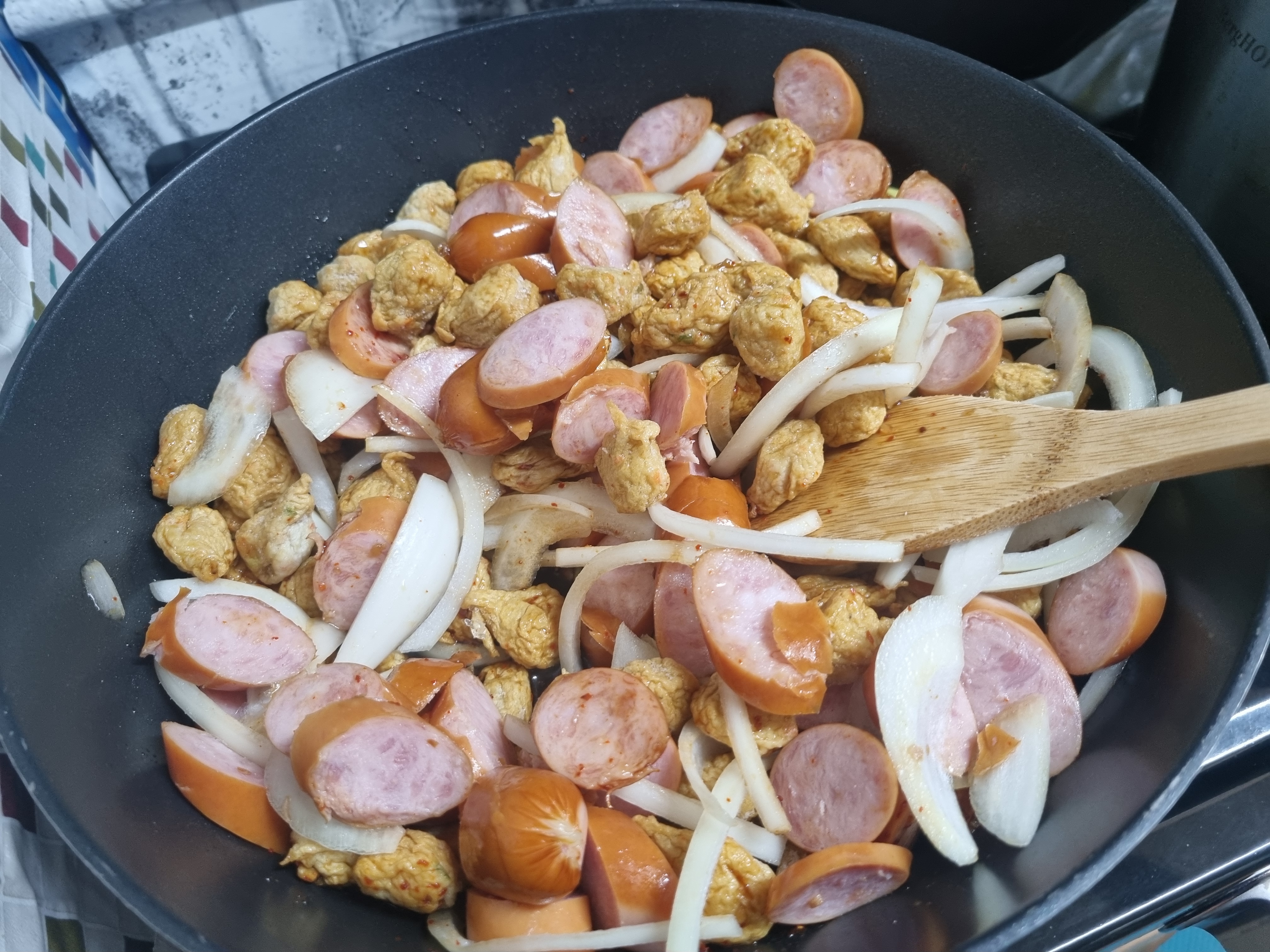 여기서 햄보다 어묵을 먼저 넣은 이유는 함은 어느정도 짭짤한 간이 되어 있지만 어묵을 그렇지 않아 양념이 조금이라도 더 스며들게 하는 것 때문에 먼저 볶기 시작합니다.