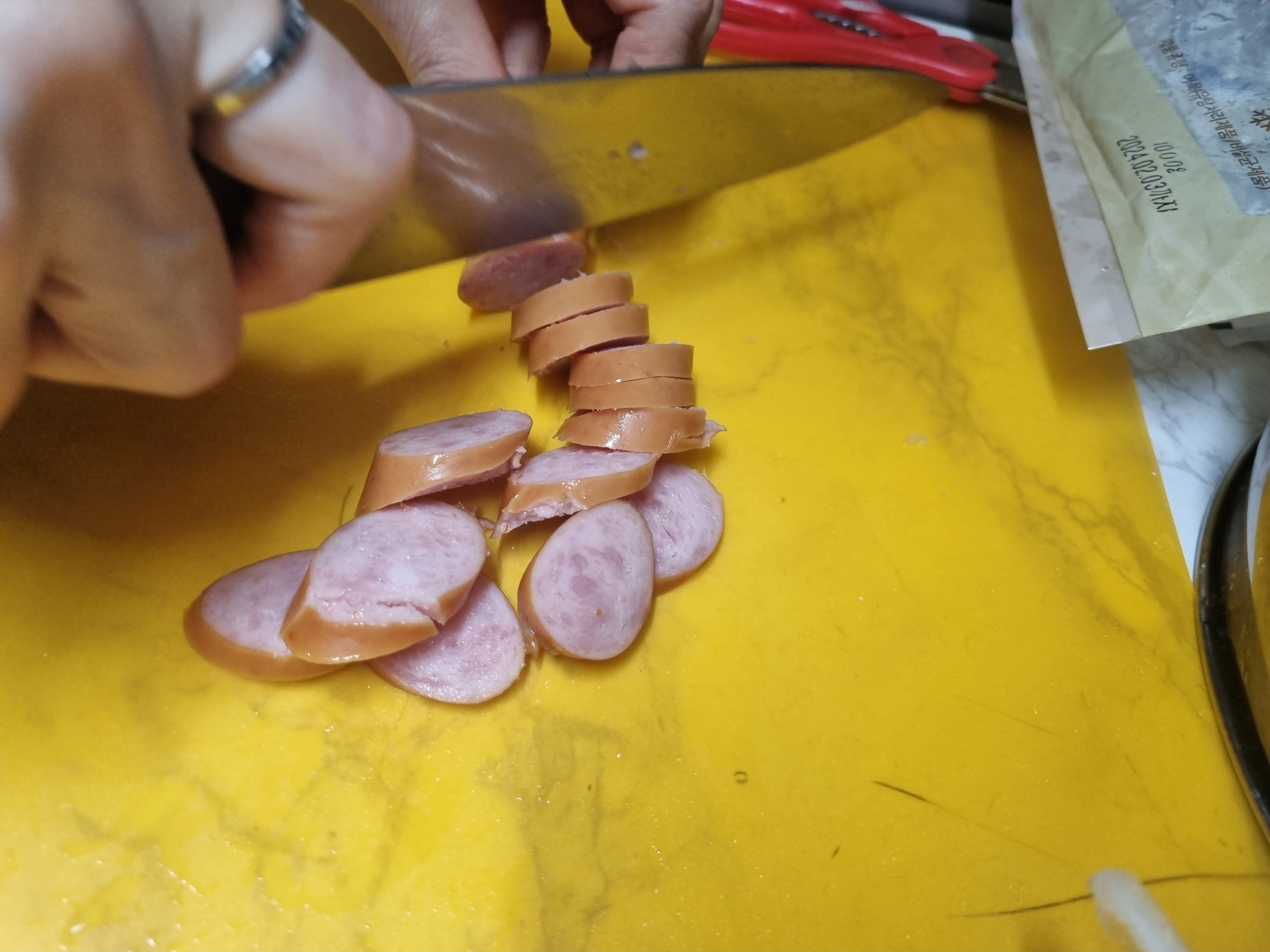 햄은 얇게 썰어줘야 하는데 너무 두꺼우면 안되고 0.5센티 두께 정도면 적당하는데 이것은 본인의 입맛과 취향에 따라 조절하시면 됩니다.