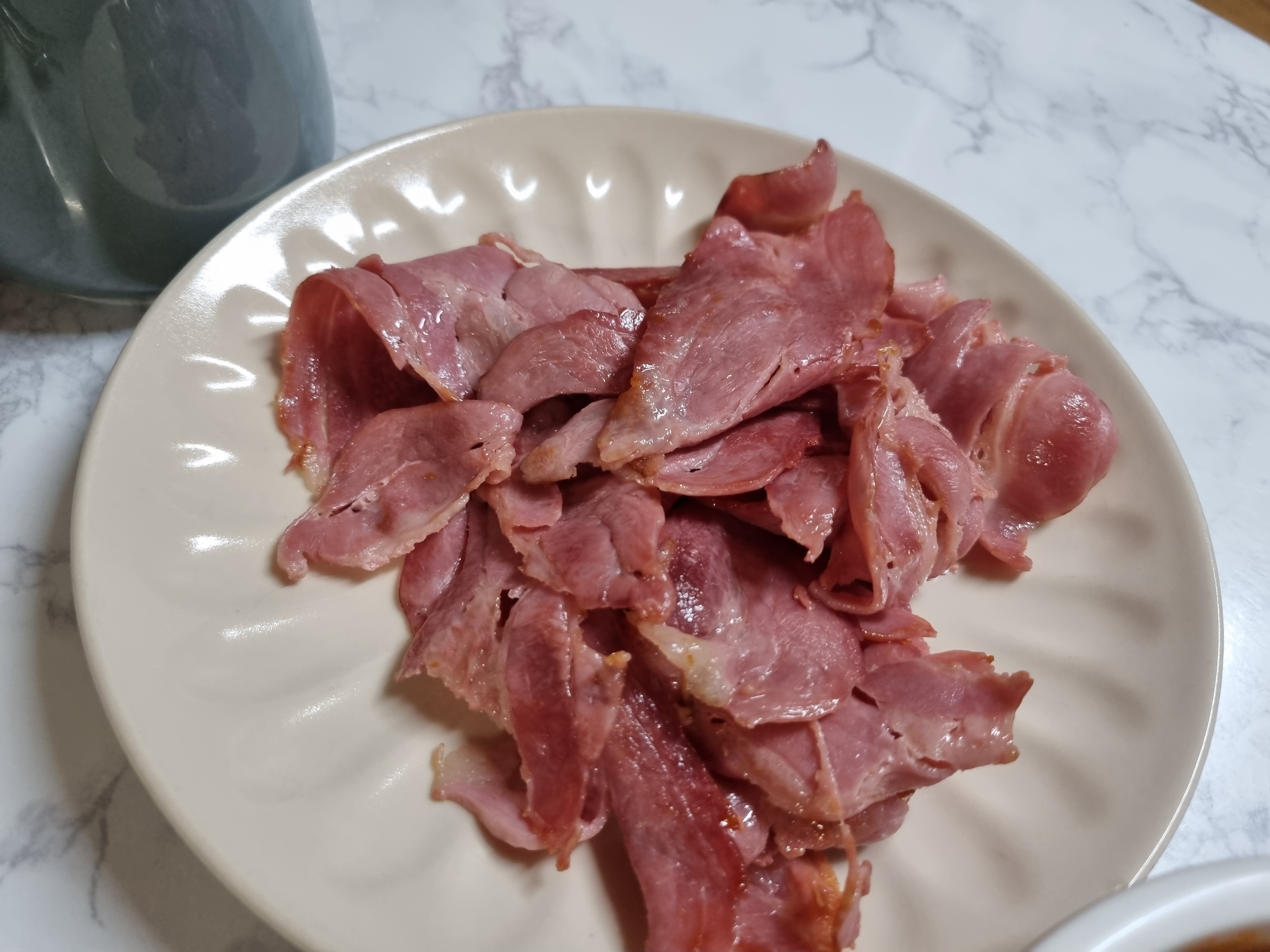 베이컨은 삼겹살을 말려서 먹는건데 기본적인 소금간이 되어 있어 살짝 짭조름한 맛이 있어 집에서 간식이나 야외에서 도시락으로 드셔도 정말 맛있습니다.