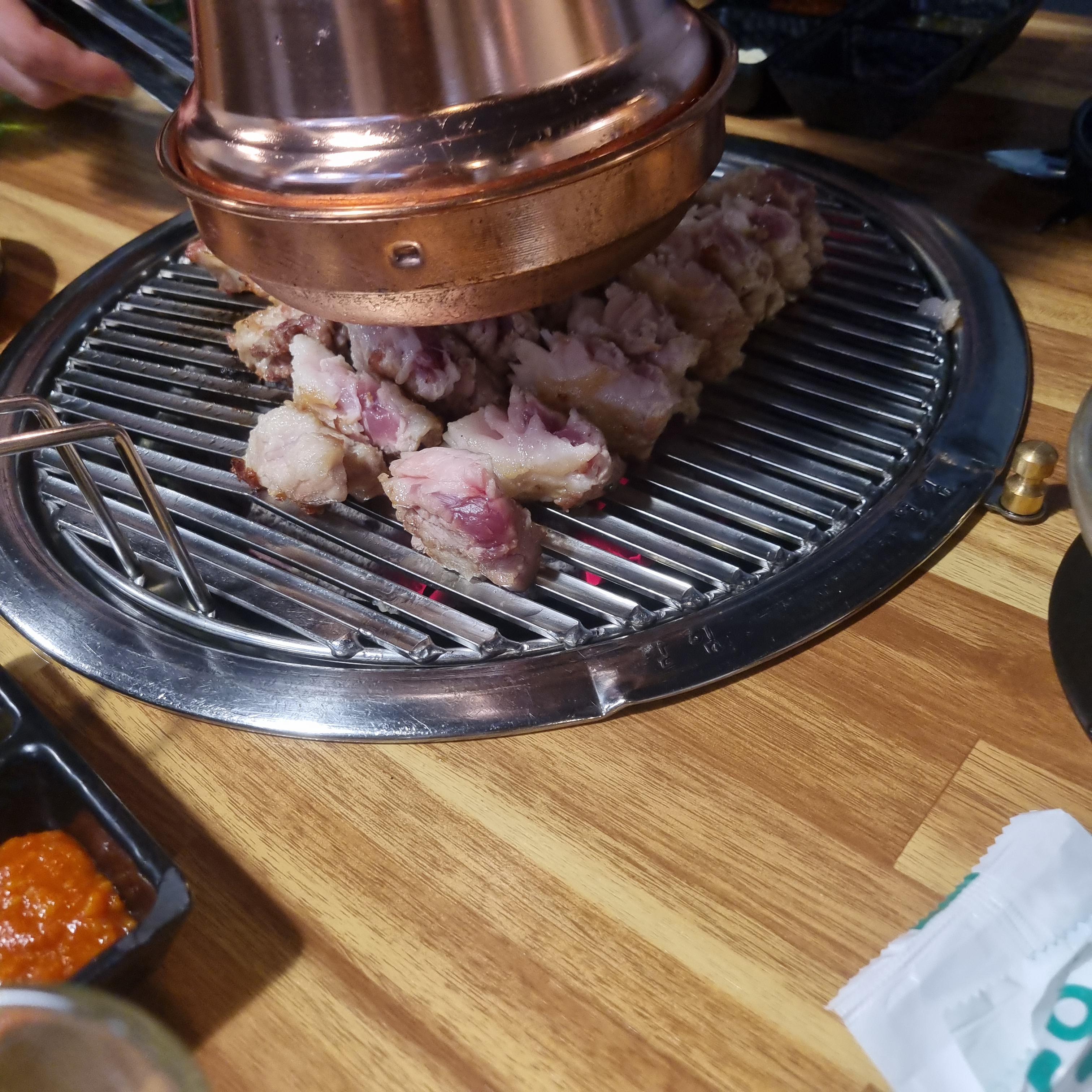 일반 가스불판이 아닌 숯불에 올려 굽기 시작 합니다