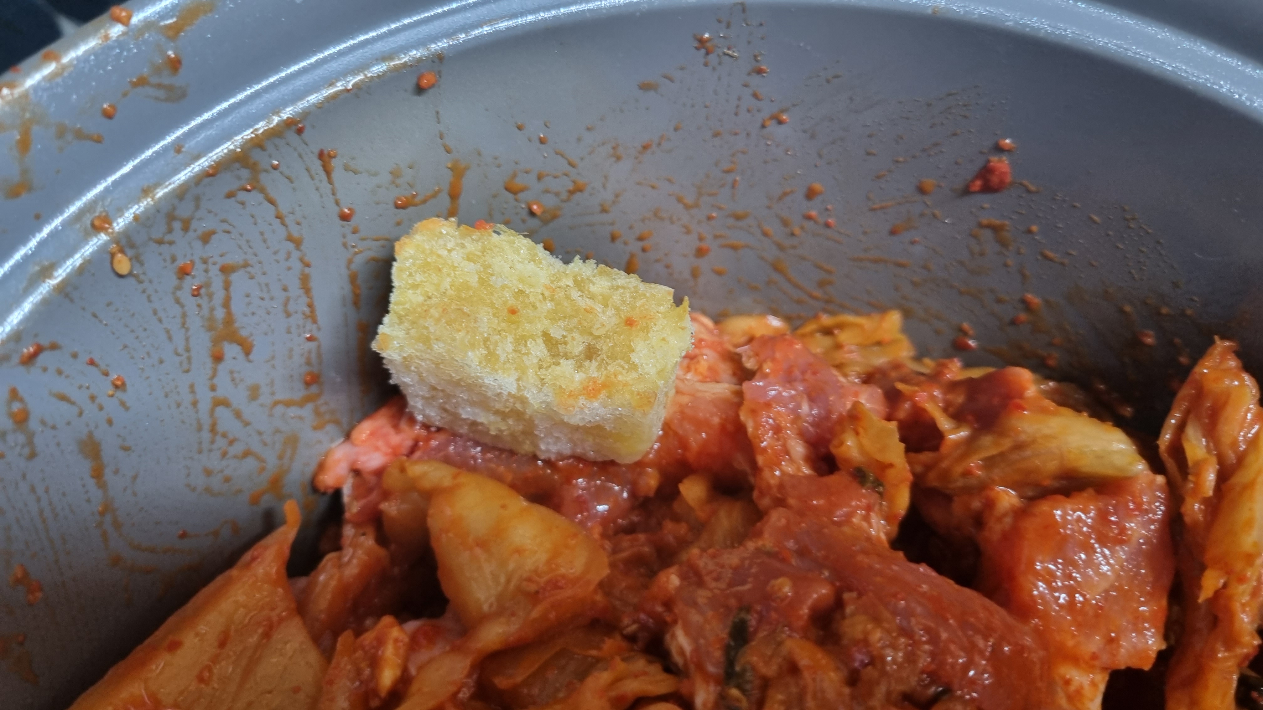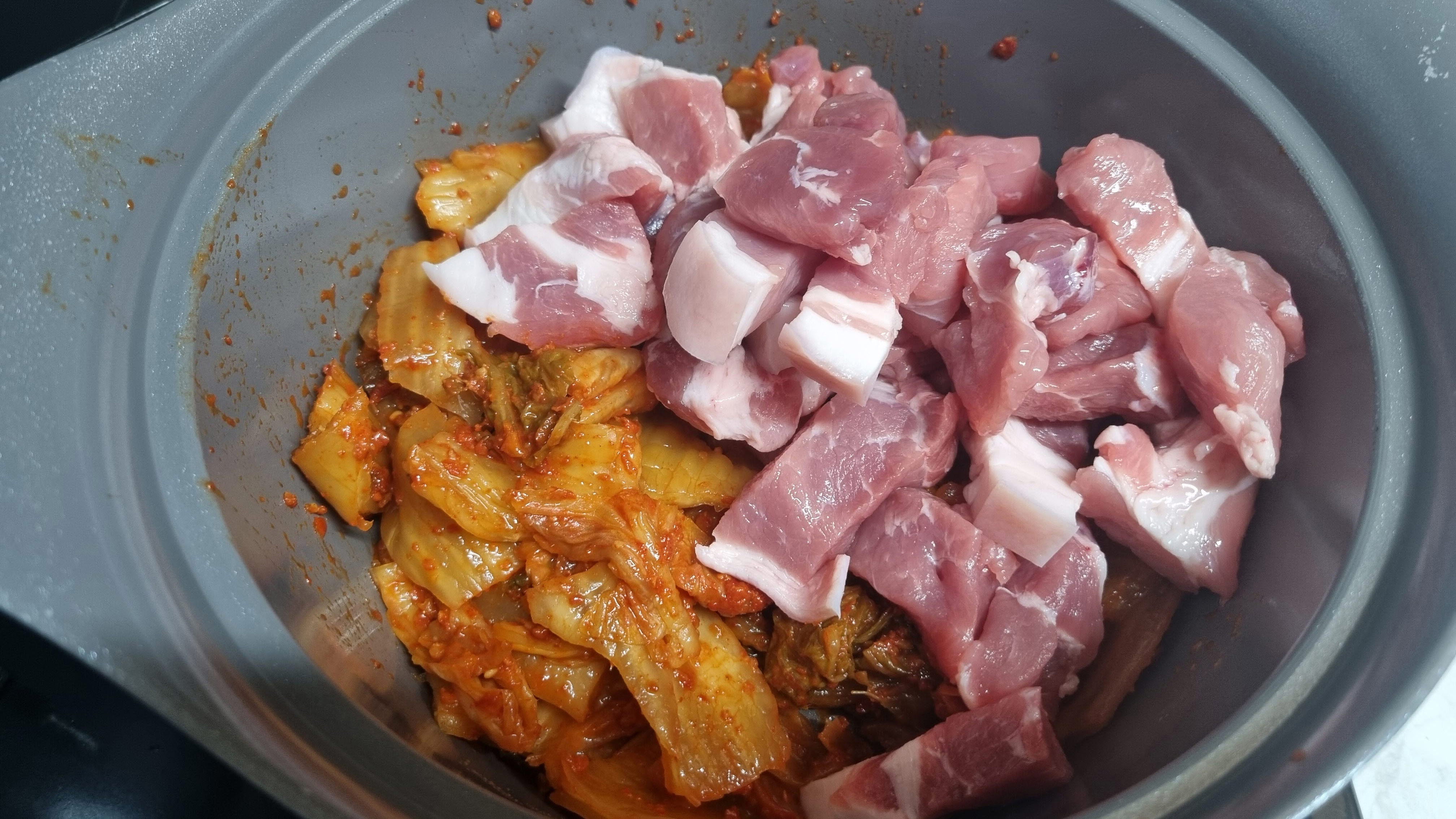 일단 김치를 잘게 잘라야 하는데 부엌칼이나 가위로 평소에 김치 먹는 크기로 자르시면 됩니다. 이때 돼지고기도 함께 넣는데 별도의 고추장이나 양념등은 추가하지 않아도 상관없습니다.