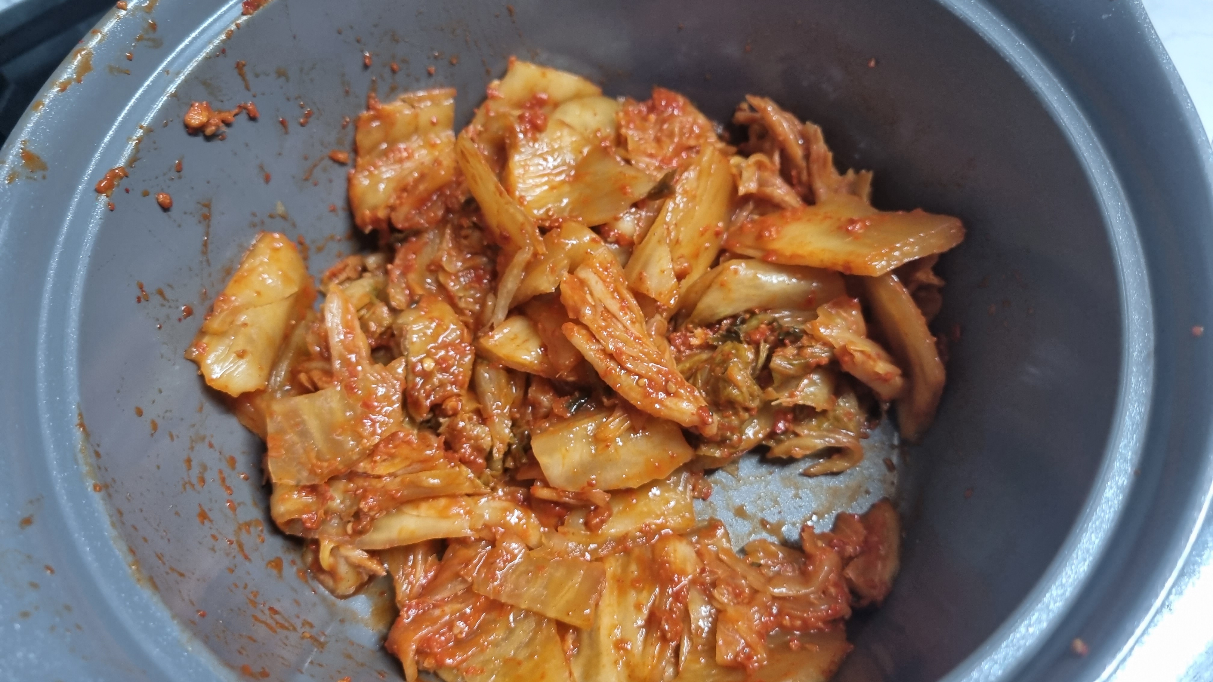 이제 김치를 볶아야 하는데 숙성 이후 식용유를 찻숟가락 기준으로 하나정도 넣어 잘 혼합하여 볶아주는데 이렇게 하면 더 고소하고 맛있습니다.