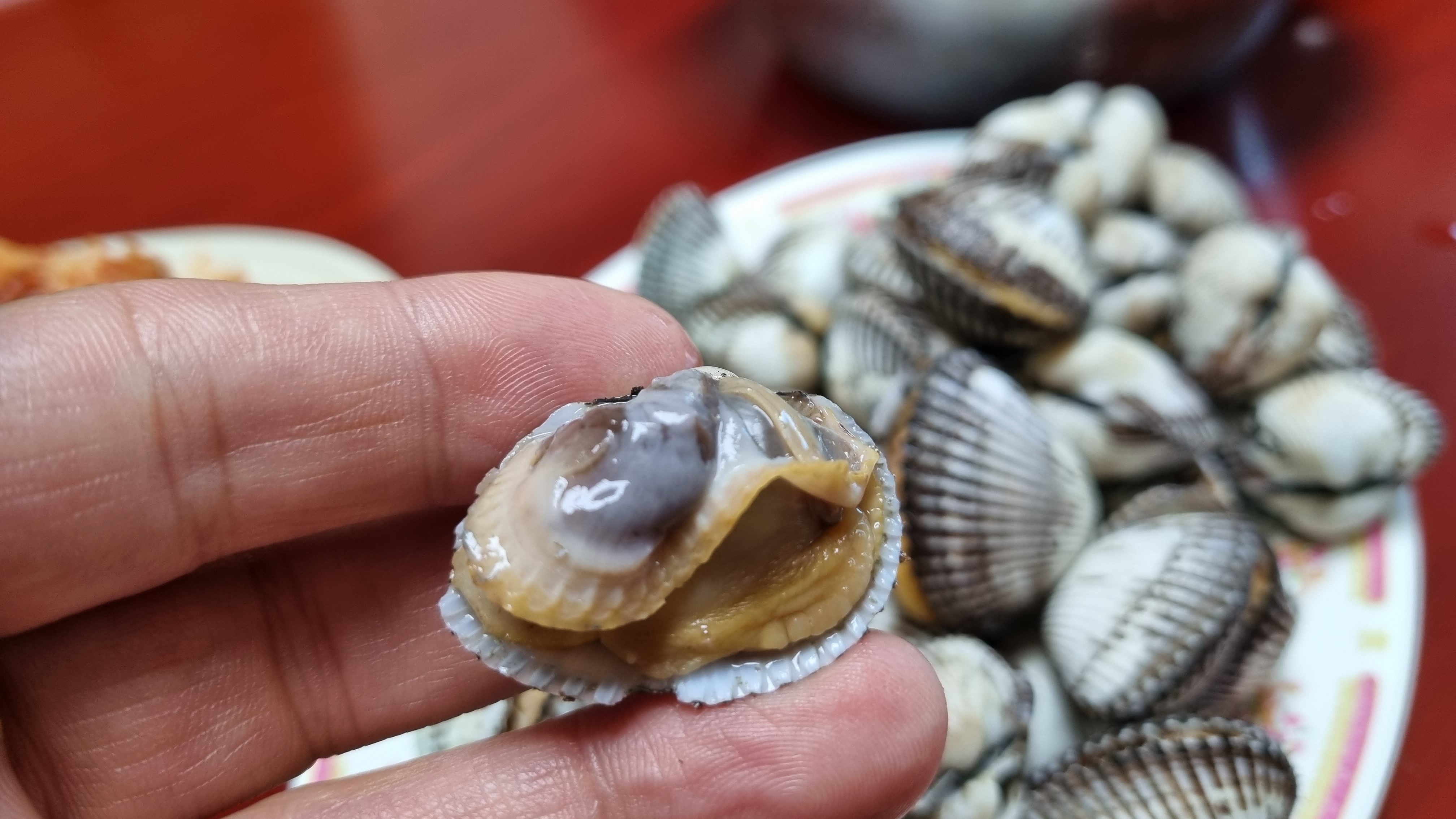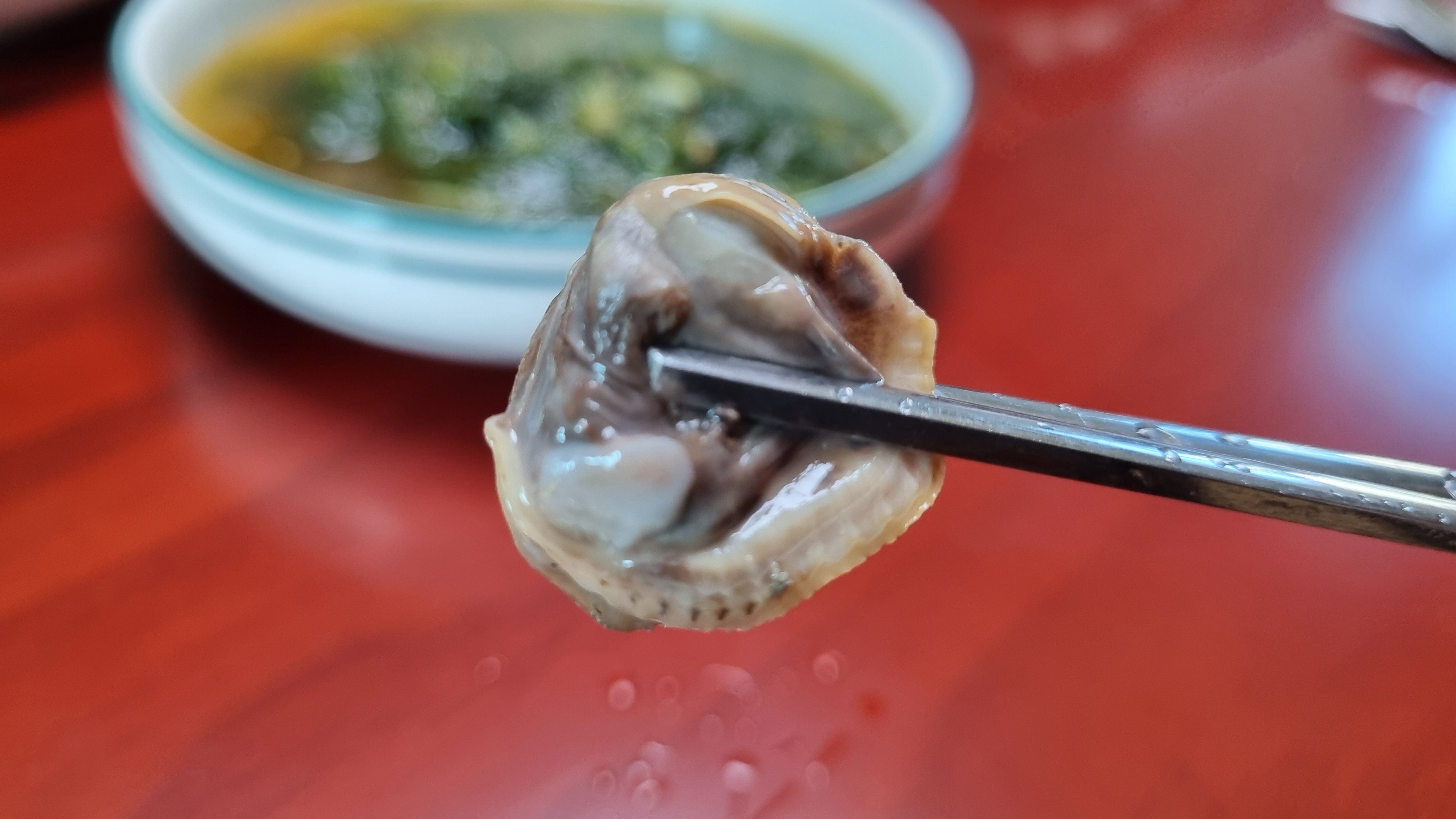 알이 작은것을 구입했는데 살아있습니다. 위 사진처럼 입을 벌리고 있는데 살짝 건드리면 재빨리 닫습니다. 외관은 비교적 깨끗한 상태이고 1차로 잘 씻어서 판매됩니다.