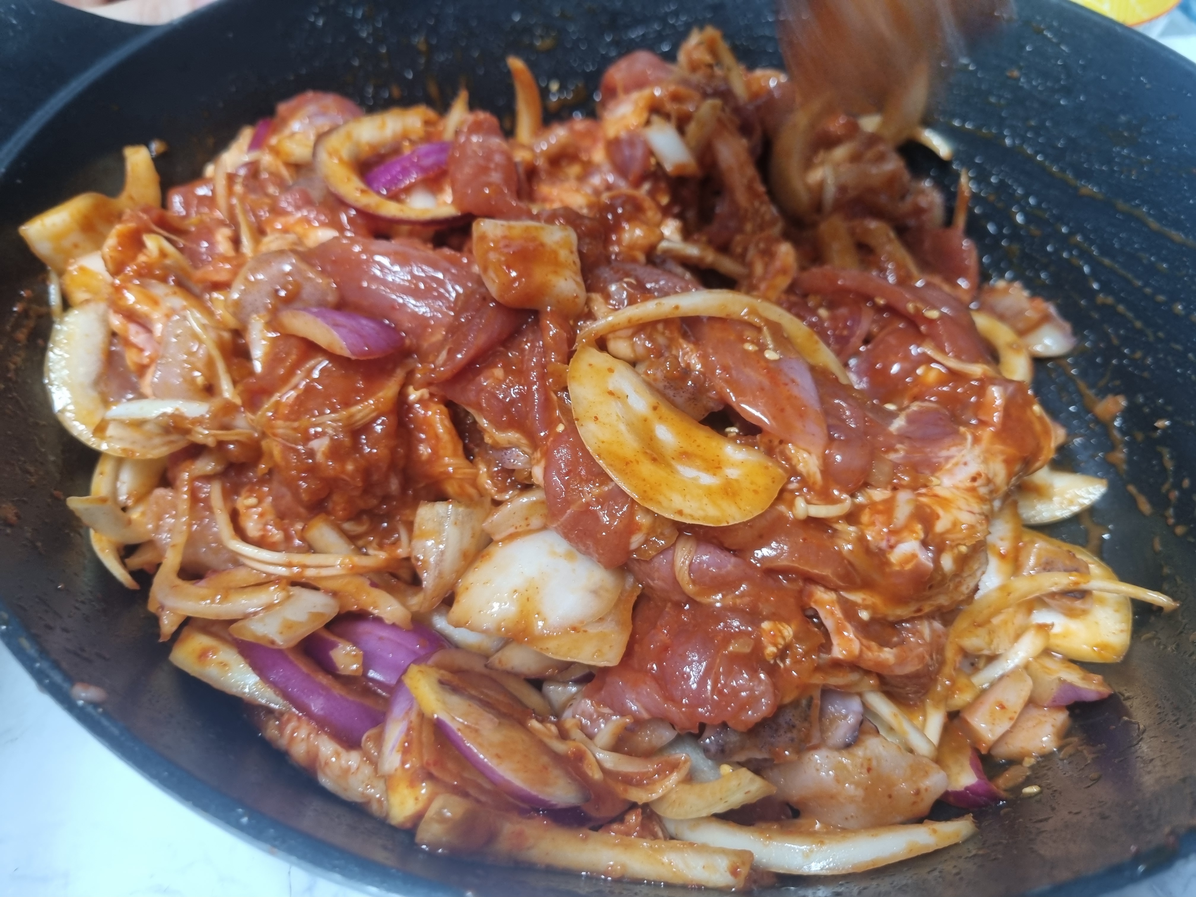 이렇게 숙성이후 가스레인지 중간불에서 10~15분 정도 볶으면 아주 맛있는 제육볶음이 되는데 중간에 하나 맛을 보는데 정말 맛있습니다.