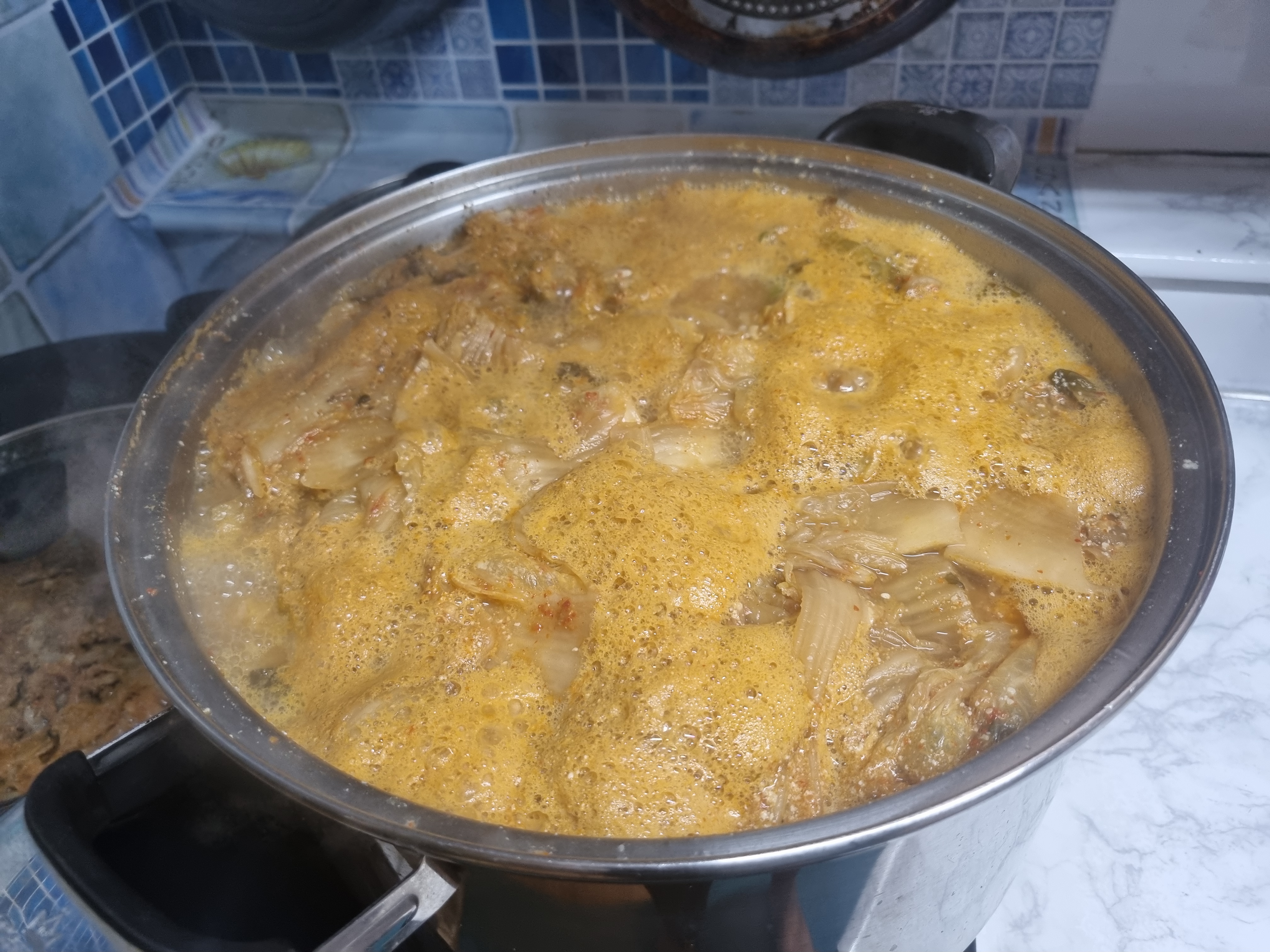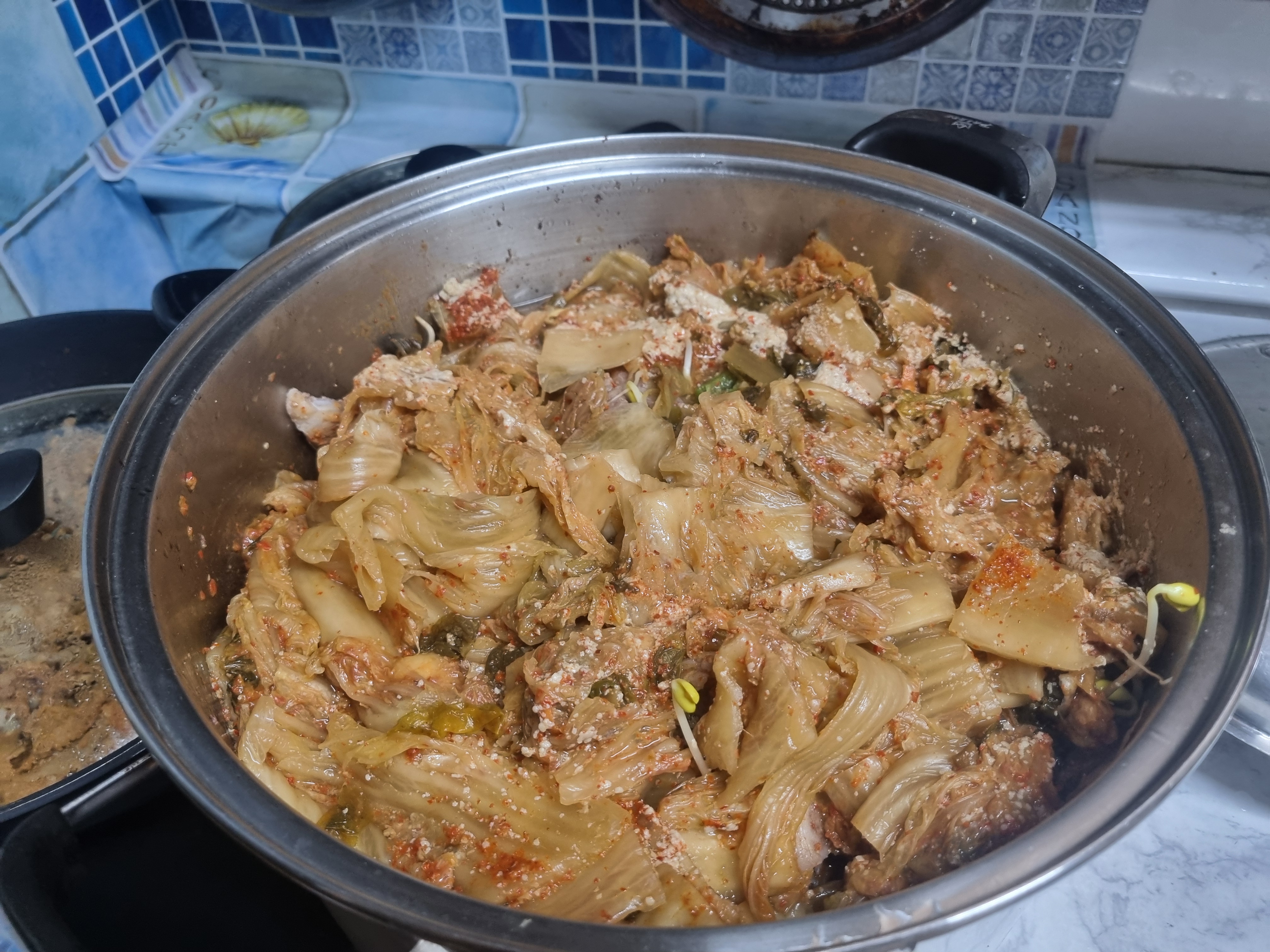 등뼈를 가볍게 한번 삶아 물을 다시 버리고 이후 김치와 다진 마늘 콩나물을 넣고 물을 재료 높이까지 붓고 끓이기 시작합니다.
