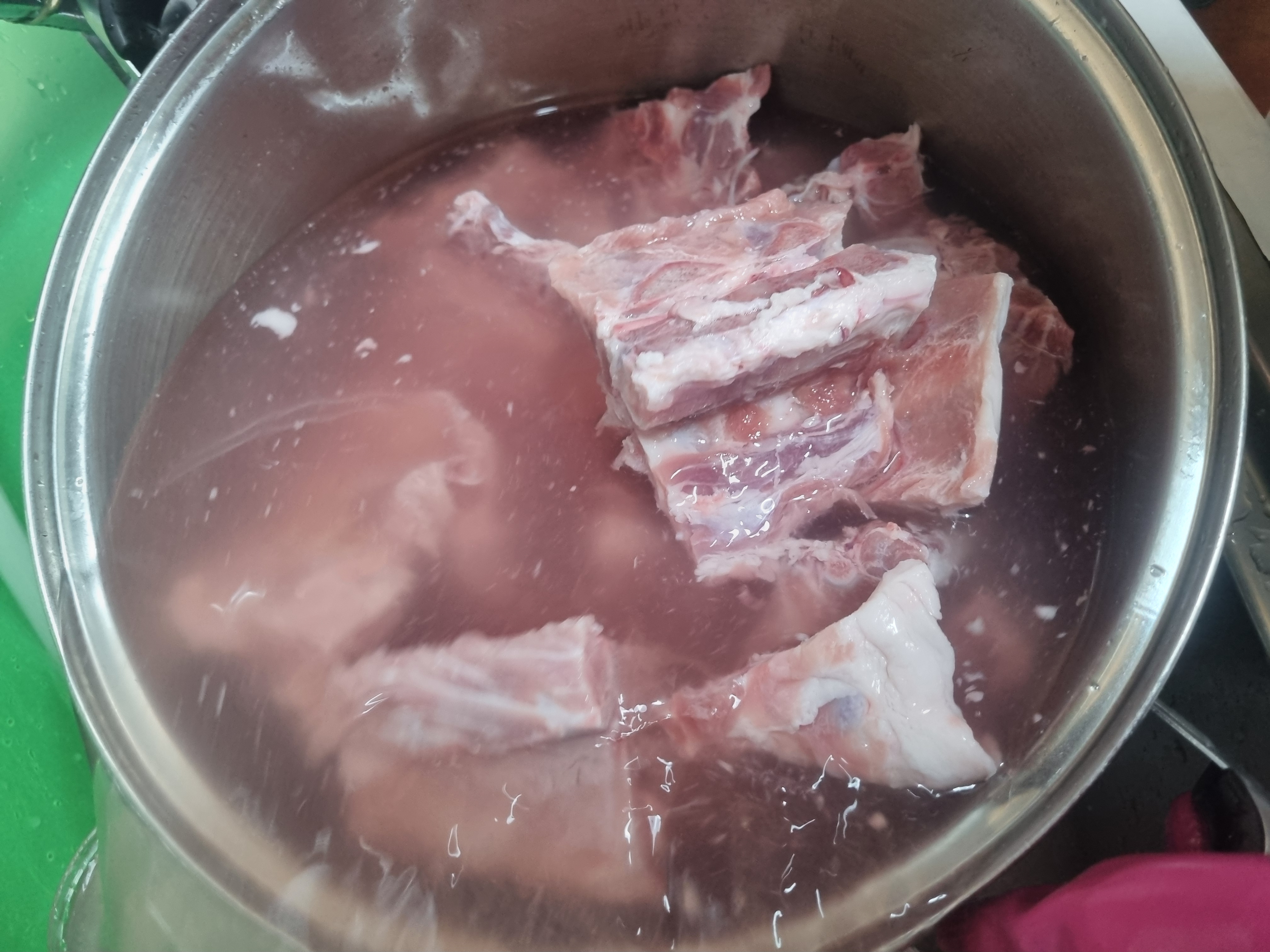 먼저 등뼈의 핏물을 빼주면 되는데 특별한 과정은 아니고 냄비에 물을 등뼈 높이 이상으로 하여 약 30분 정도 담근 후 물을 버리면 됩니다.