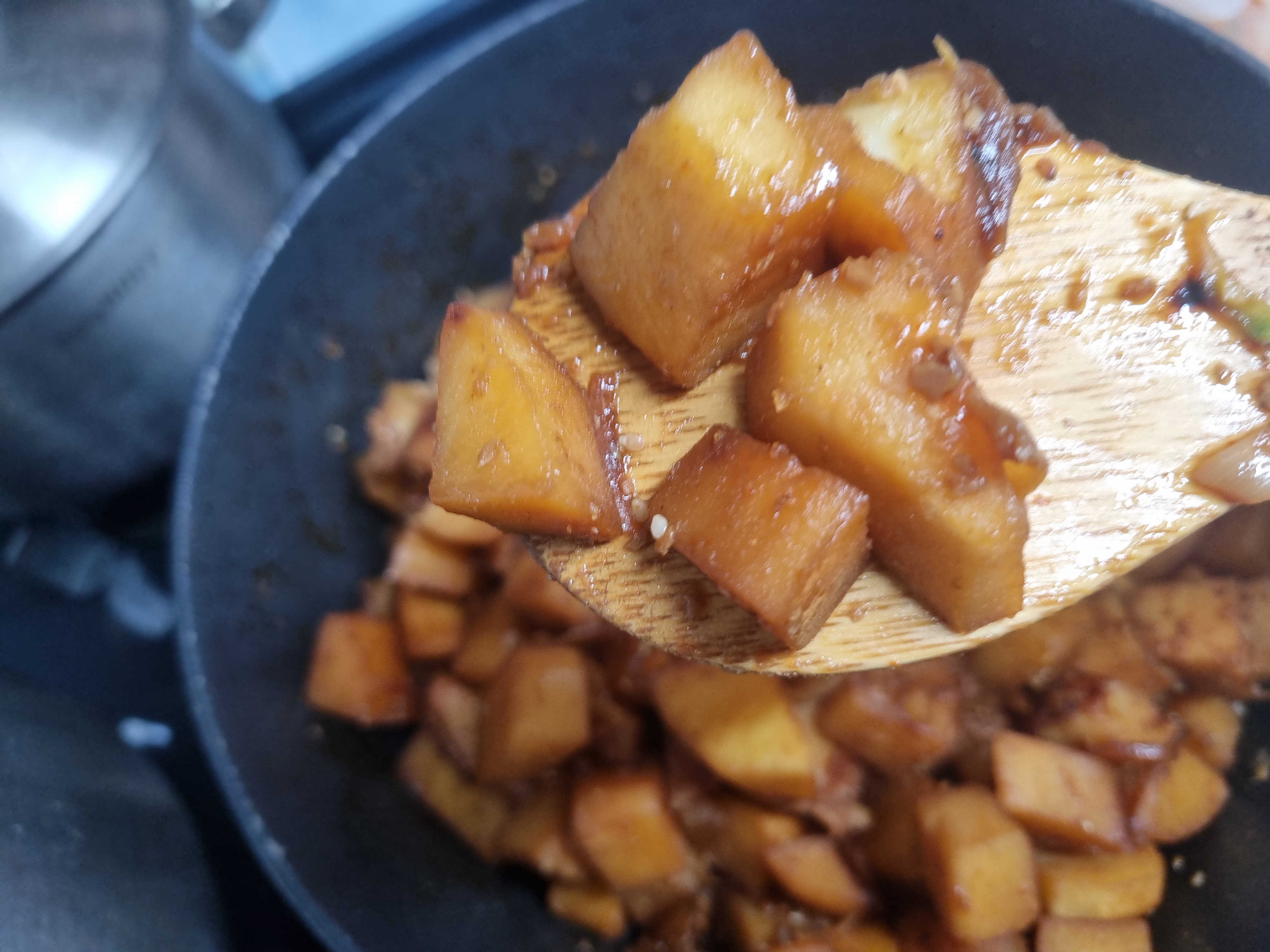 간장이 살짝이 끓여지면 바로 감자를 넣어 간장과 잘 혼합하여 주면서 서서히 볶아주기 시작하면 되는데 이때 가스렌인지나 인덕션 불은 중간으로 조절하여야 하며 불이 너무 강하면 감자가 타거나 모양이 망가질 수 도 있습니다.