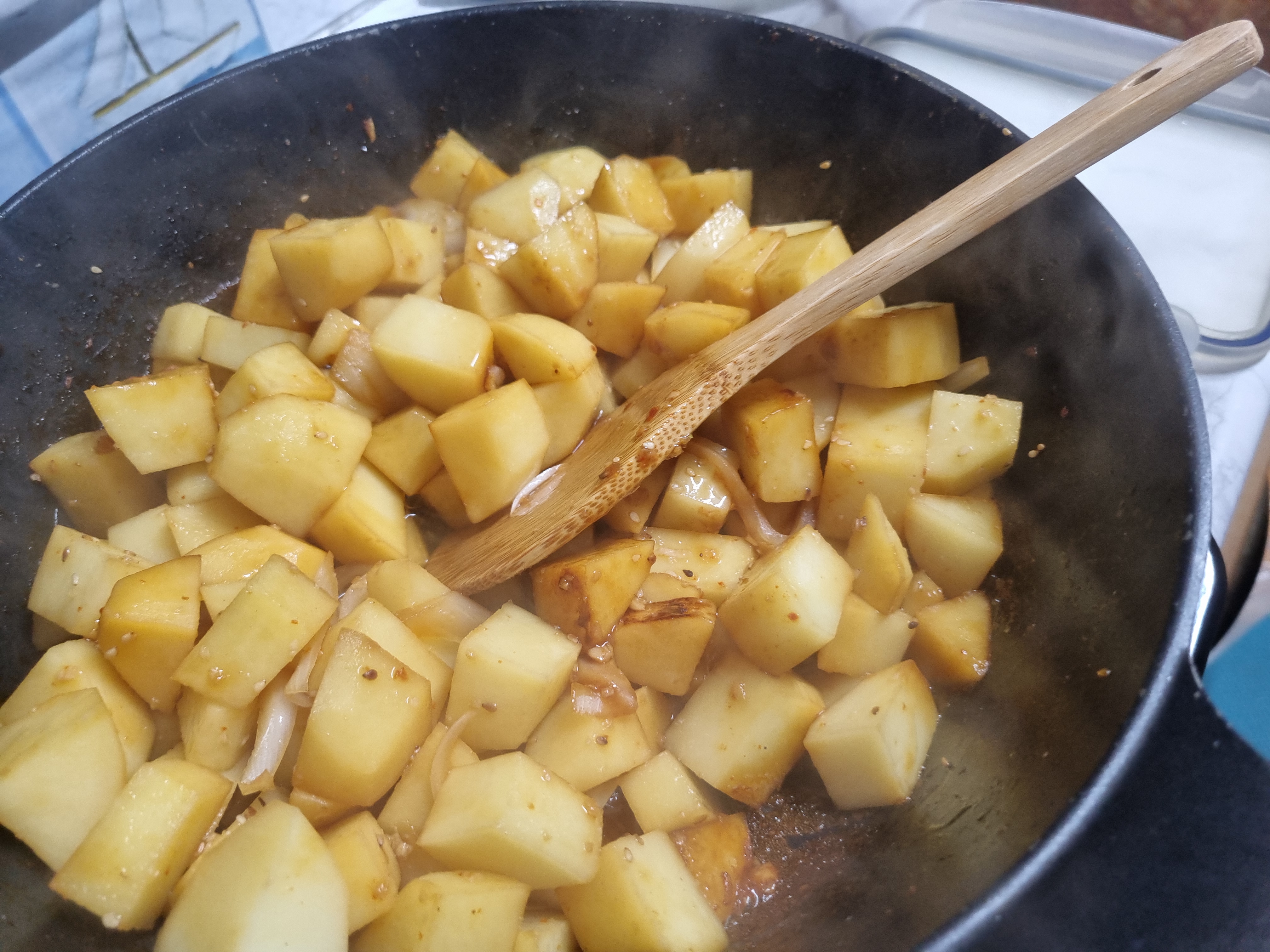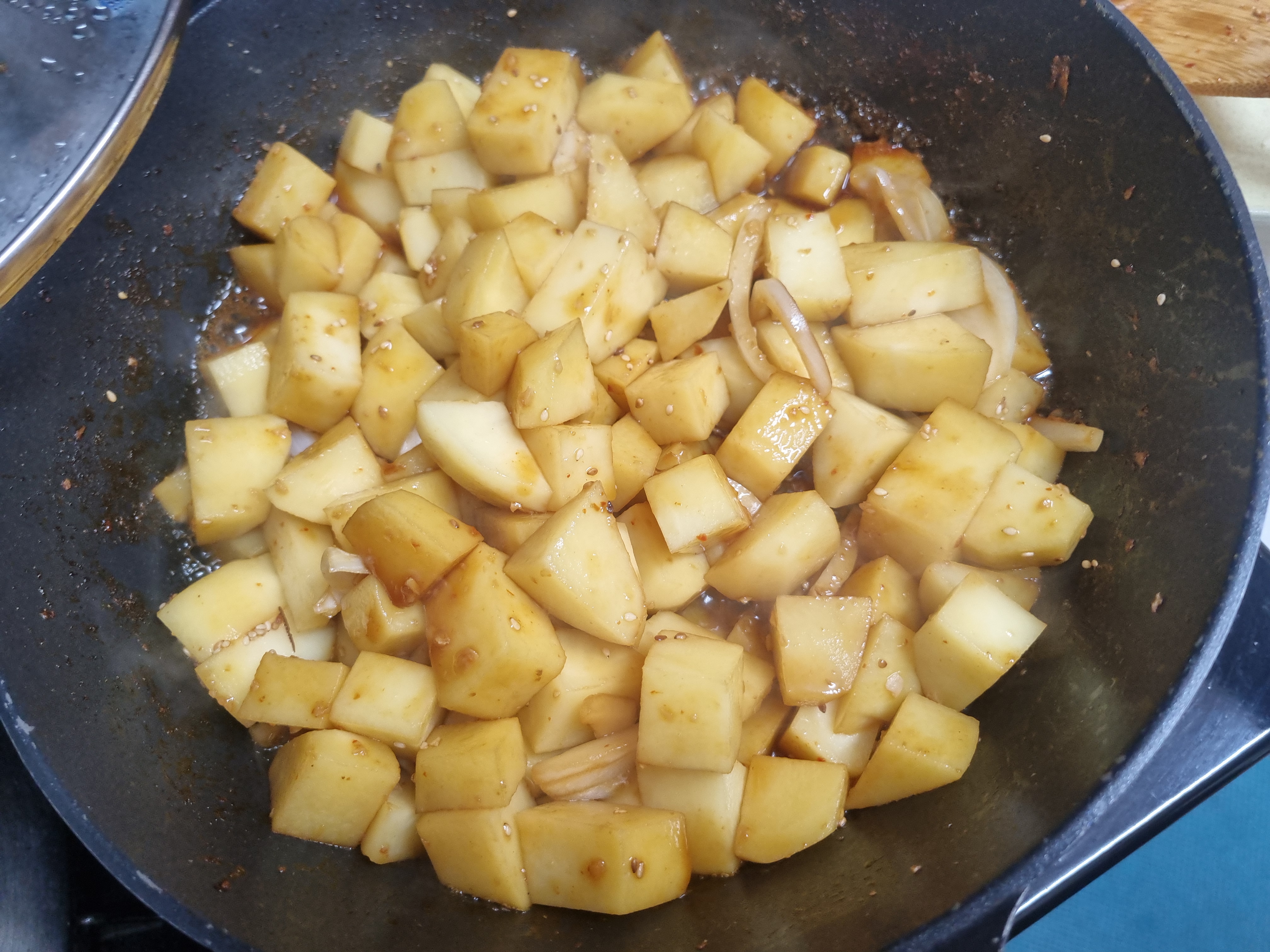 천천히 볶으면서 감자 속까지 볶아지게 하고 이어서 미리 썰어 놓은 양파까지 넣어 절 저어 주면서 볶아주기 시작합니다.