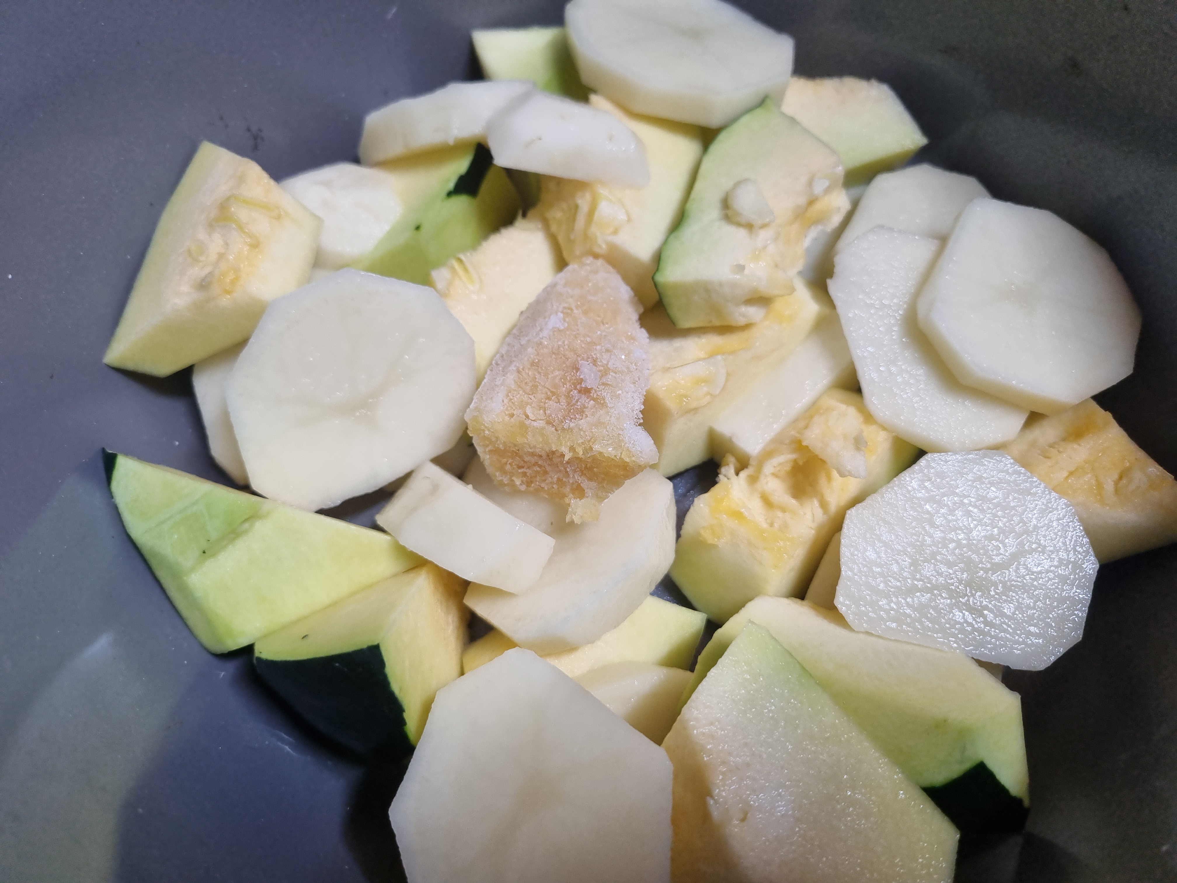준비한 재료 중 먼저 호박과 감자 양파 등을 냄비에 제일 먼저 바닥에 깔고 이어서 다진 마늘이나 간장 물엿등을 차례로 넣습니다.