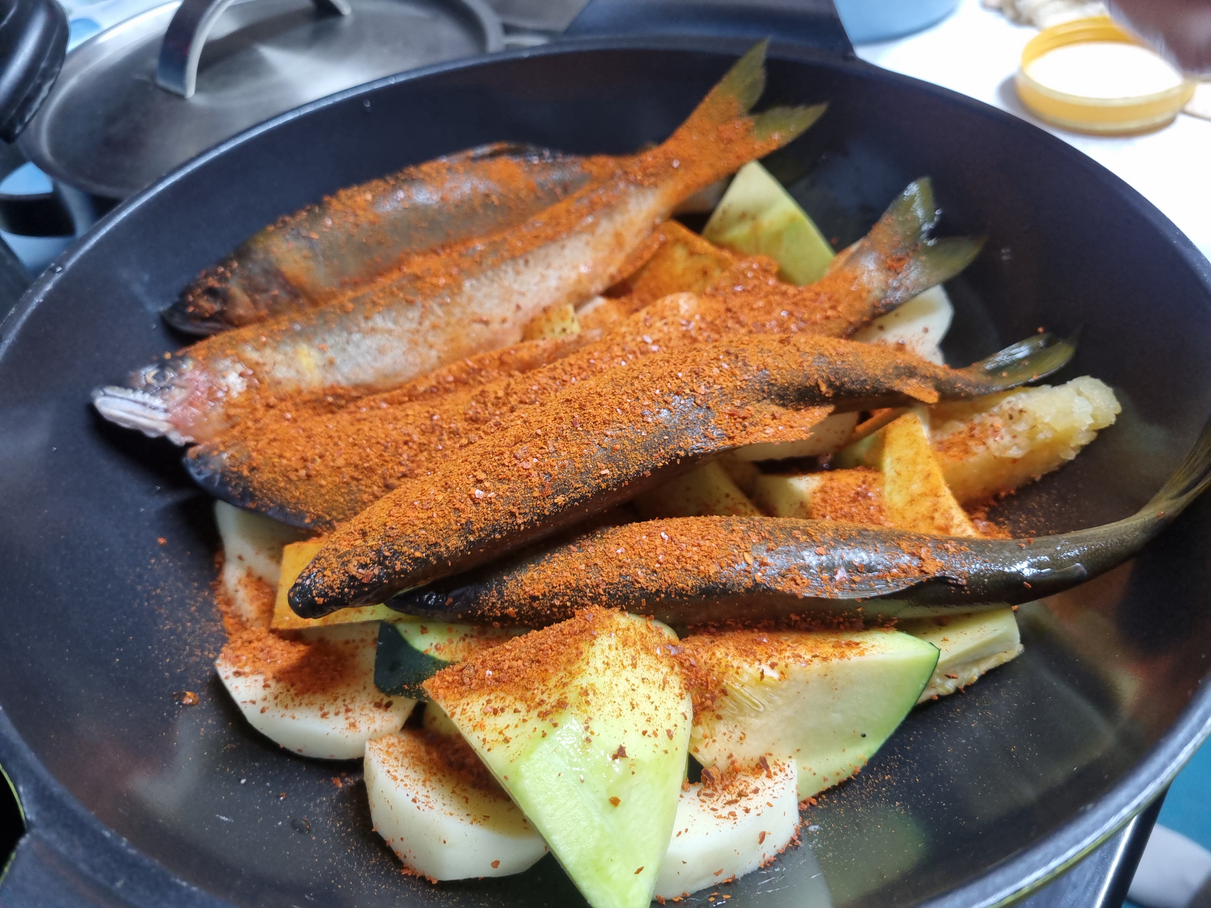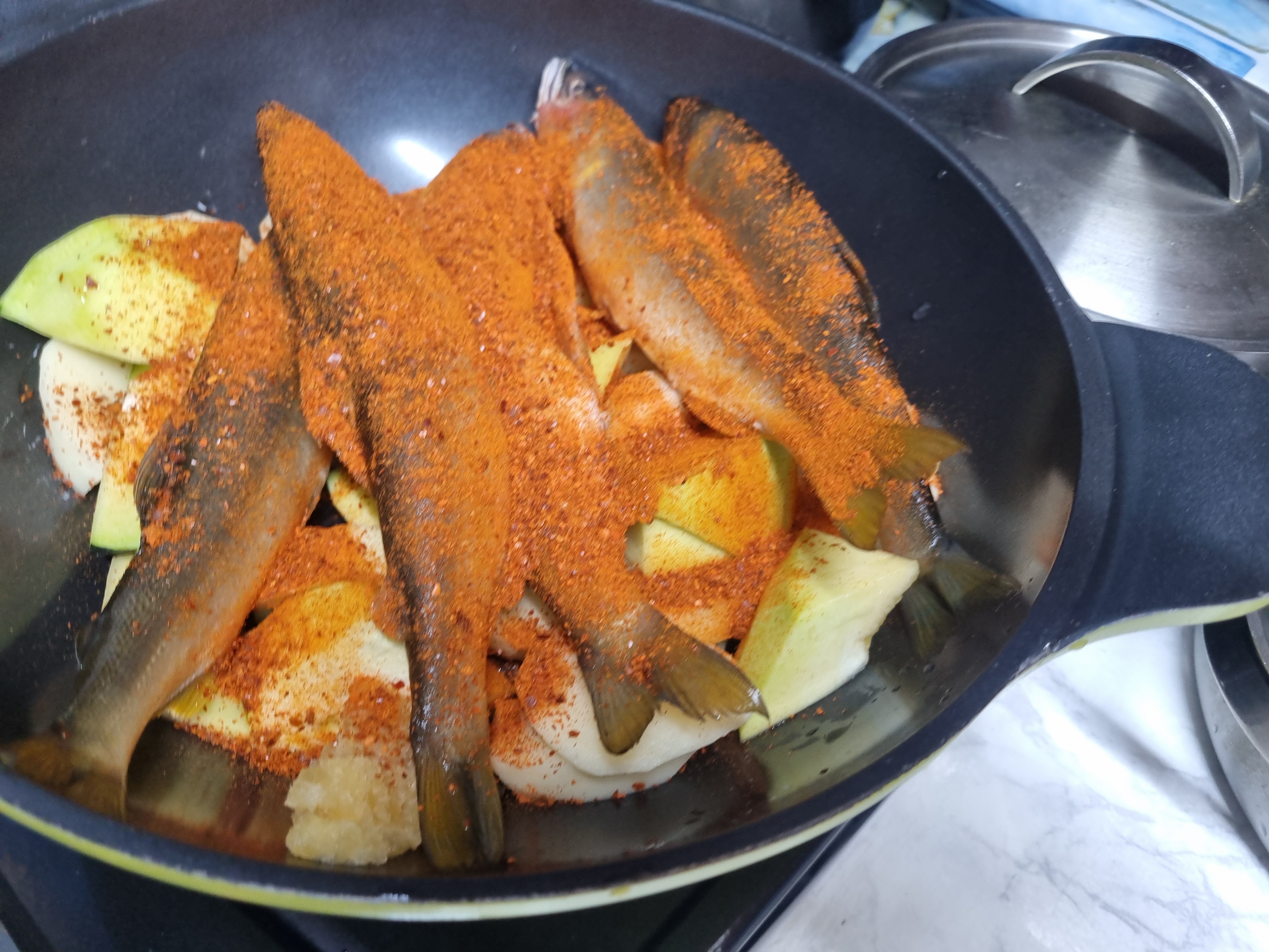 이어서 은어를 보기 좋게 넣고 그 위에 고추가를 뿌려 끓일 준비를 합니다.