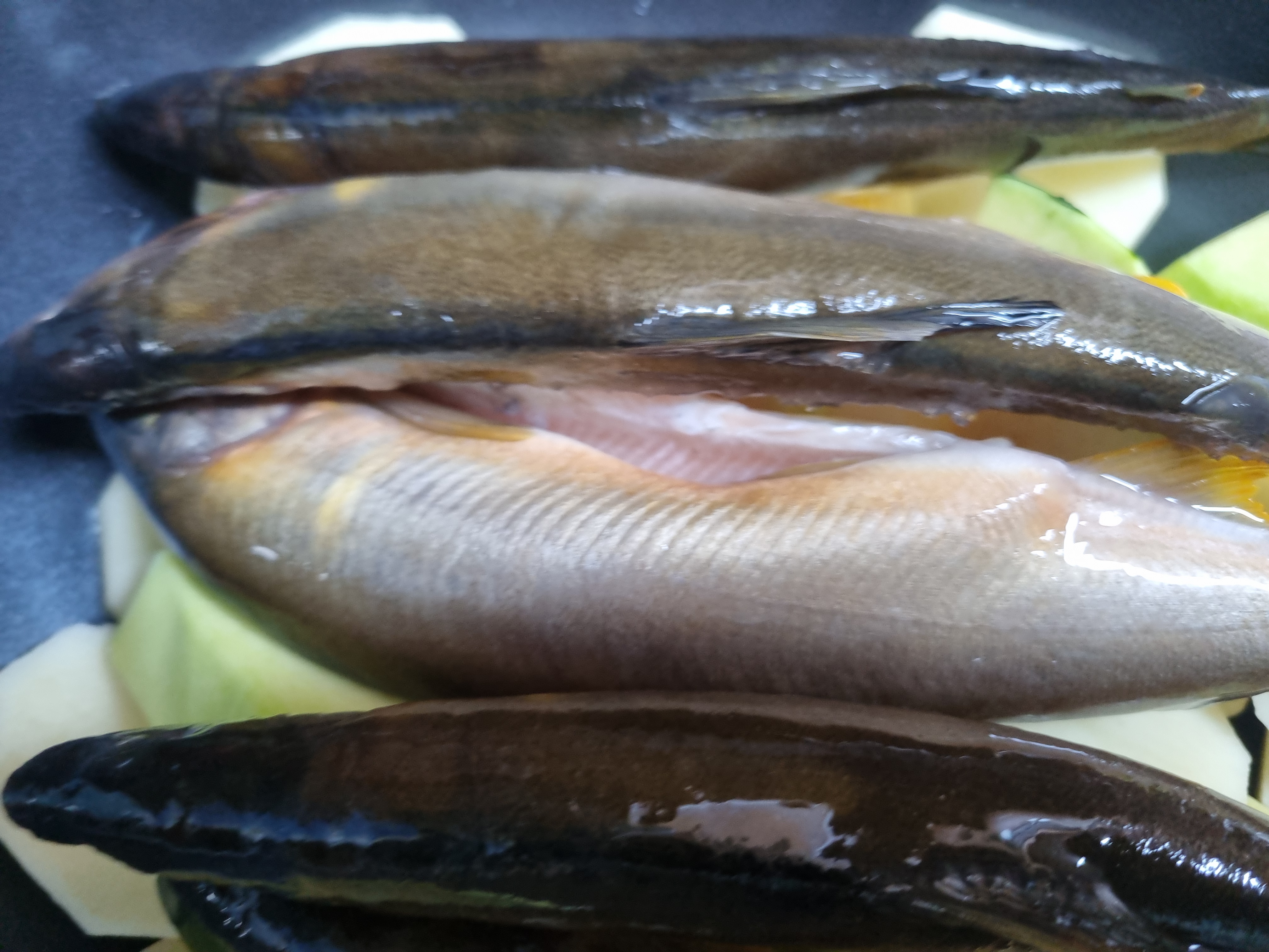 이렇게 재료를 물은 재료 높이까지 하는데 재료가 모두 물에 덮일 정도는 안되며 은어 밑부분이 물에 닿을 정도까지만 부으면 됩니다.