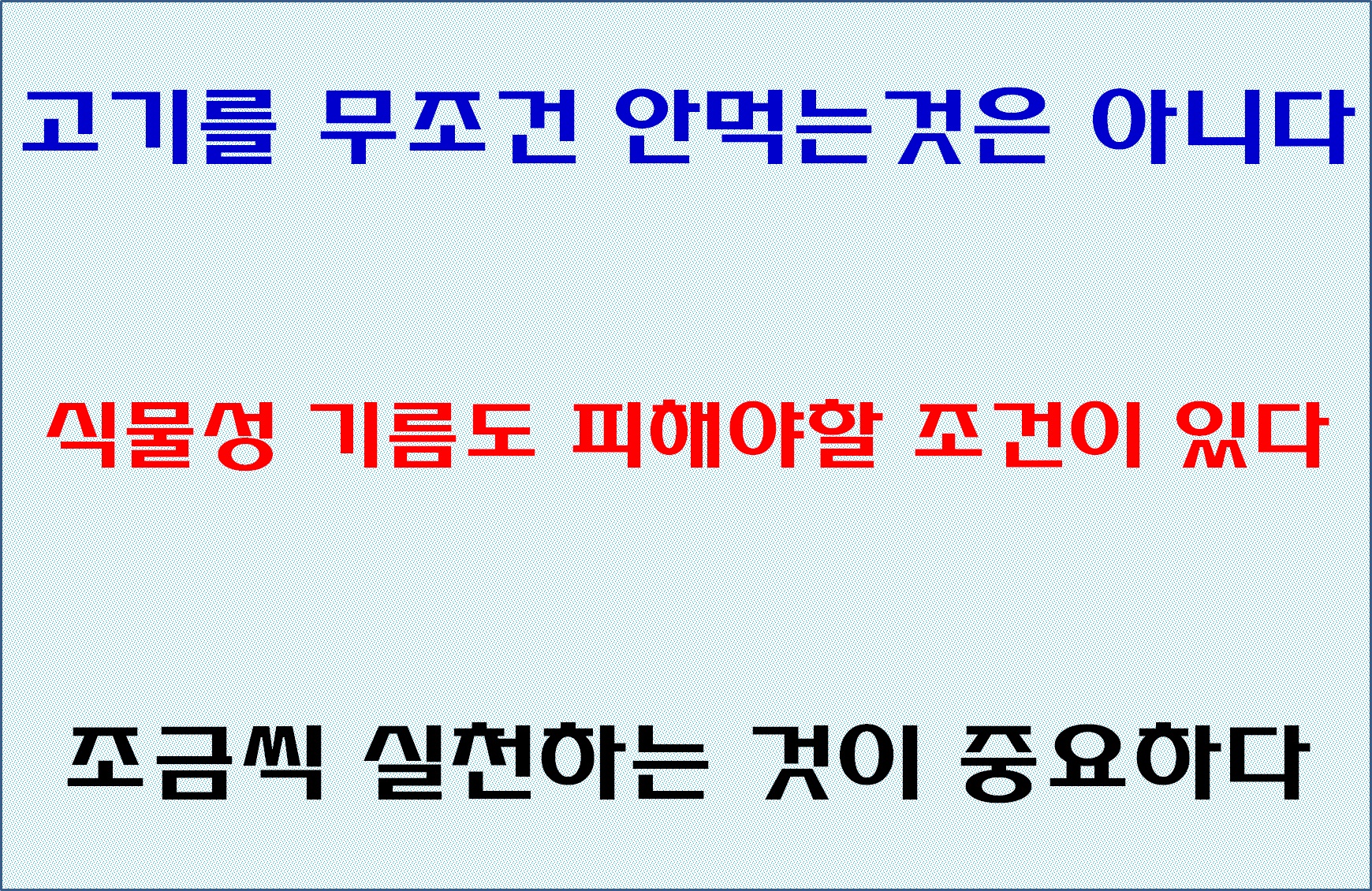 * 위의 자제해야 할 음식들을 모두 원칙되로 금지하는 것이 결코 쉬운 일이 아닙니다. 하지만 어렵다 하여 하나도 실천하지 않으면 우리 몸은 점점 망가지므로 하나씩이라도 지금부터 조금씩이라도 실천하는 것이 중요합니다.