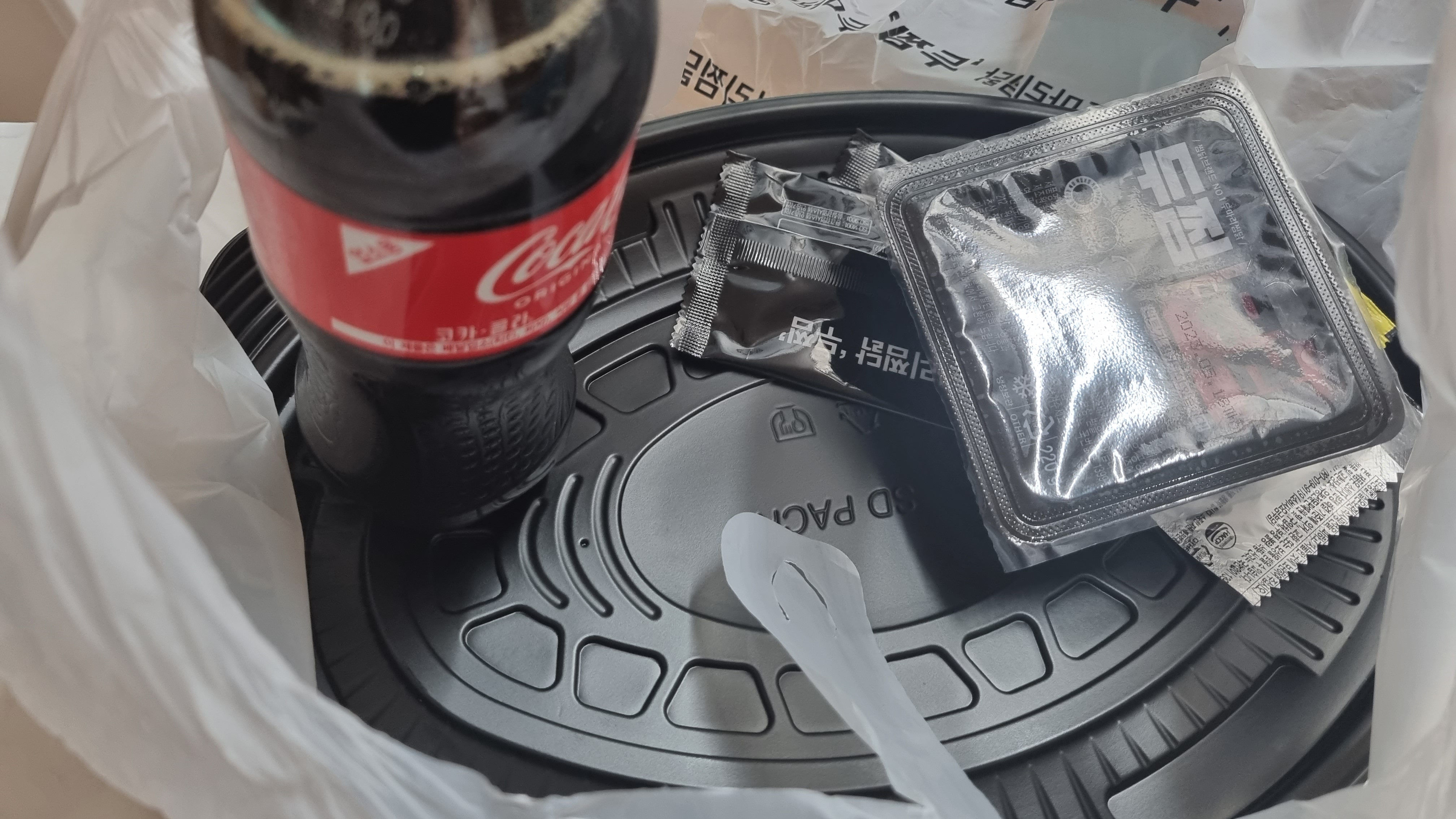 포장은 깔금하게 되어 있습니다. 접시 같은 1회용 그릇에 콜라와 기타 양념들이 챙겨져 있습니다.