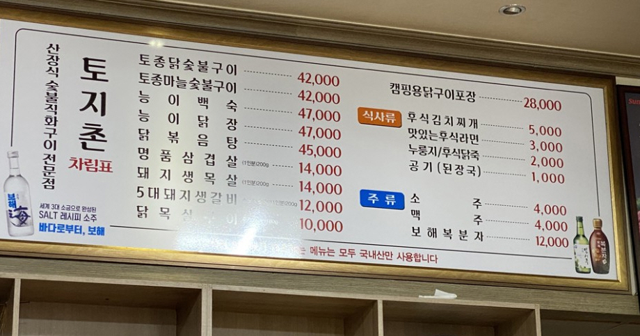 메뉴판인데 닭숯불구이가 전문이고 이후 백상이나 닭장 돼지고기가 구이로 판매되고 후식메뉴도 다양하게 있습니다. 가격도 일반 산장과 비교가 안될 정도로 저렴합니다.